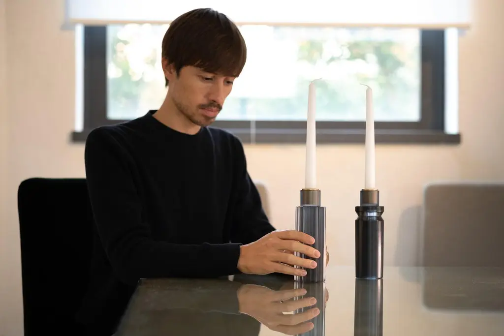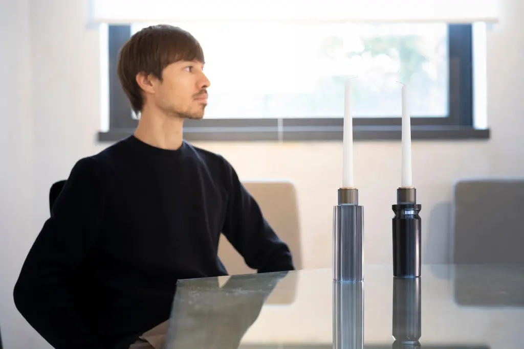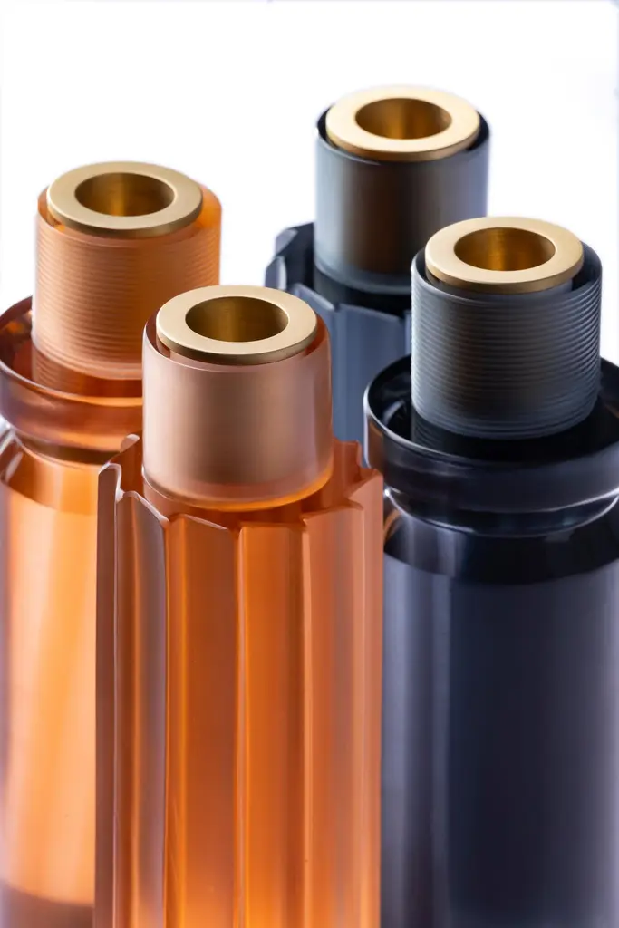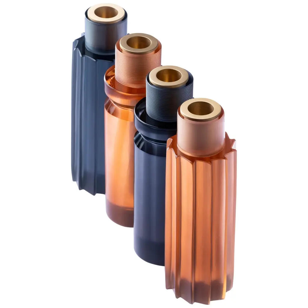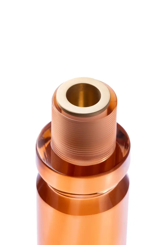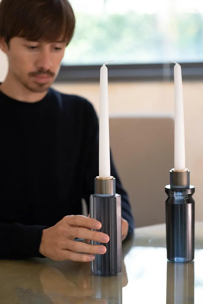 21st century, design Federico Peri, candlestick Satinated in Murano glass, various colors.Lume is a blown glass and satinated brass candlestick available in twodifferent variants: Lume Linear and Lume Plissé.The glass, prevalent material made with the same technique asthe submerged glass of the ashtrays and Lumino, is proposed bycombining two distinct finishes: in Lume Plissé the wide verticalpleating - similar to a cog wheel, are combined with a smooth bandincluding the candleholder glass, on the contrary Lume Linear has asmooth surface completed by the ribbed upper band. In both versionsthe candleholder cup is removable and is made of satin brass.Colors available: crystal + iris grey / steel + crystal / rose + iris