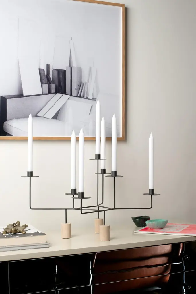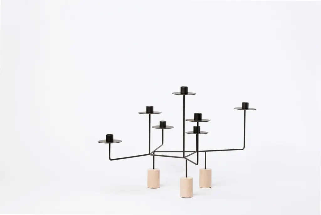 The Constellation series marks the first collaboration of GAIA&GINO and Porto based Designer Christian Haas. The designs derive their beauty from the interaction between tubular stone weights and slim metallic structures that seem like drawings in space. The collection consists of one arm, double arm candleholders and a multi arm candelabra.Constellation Candelabra is hand-crafted by metal artisans in Portugal.