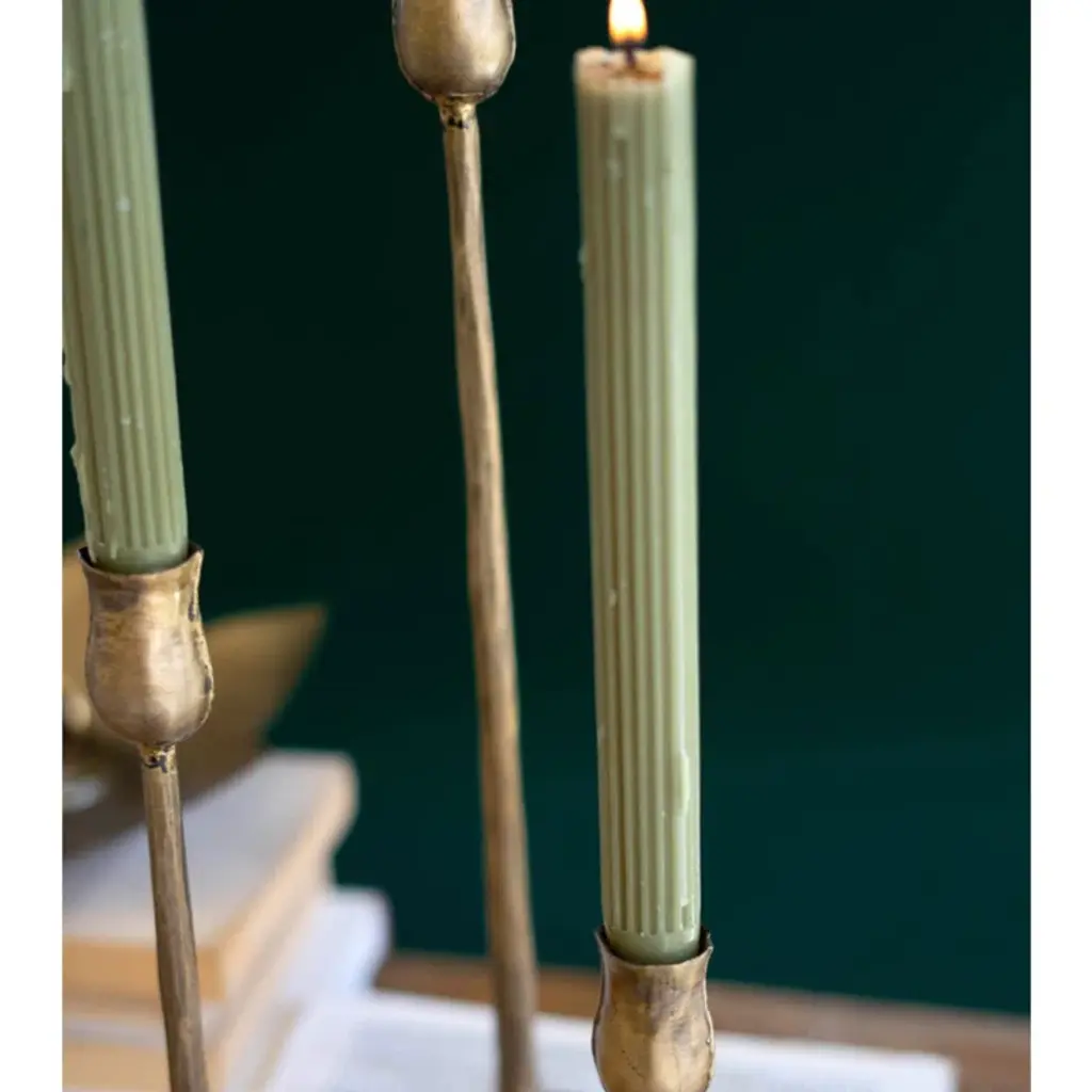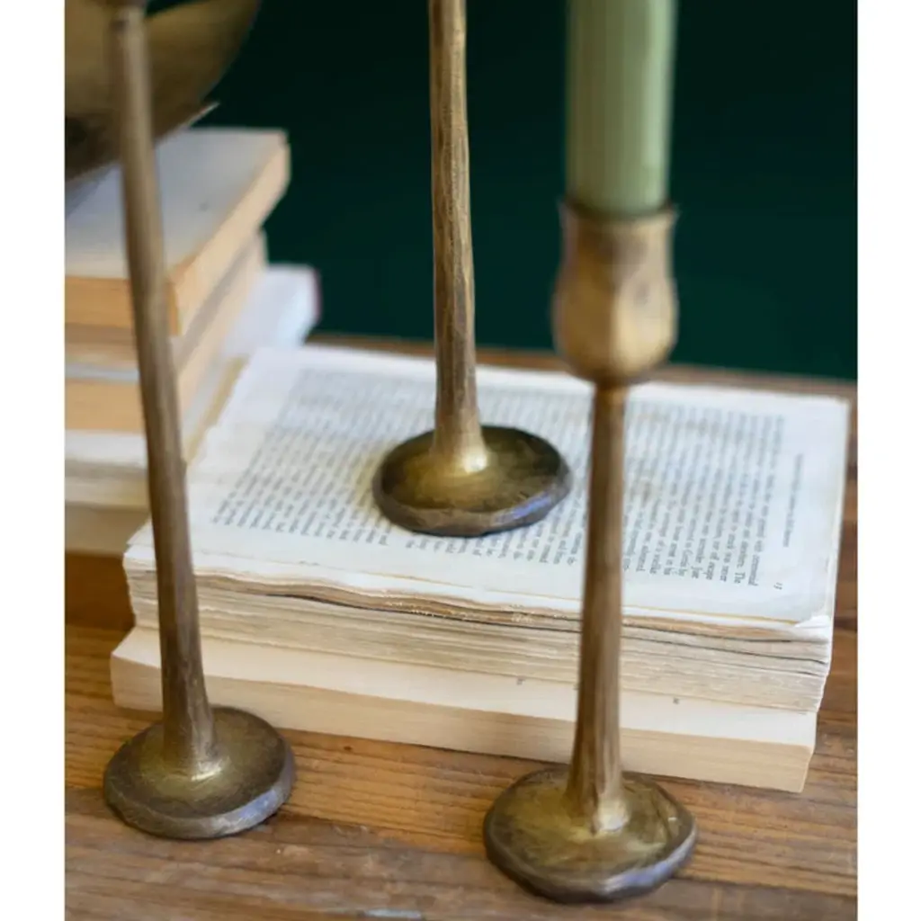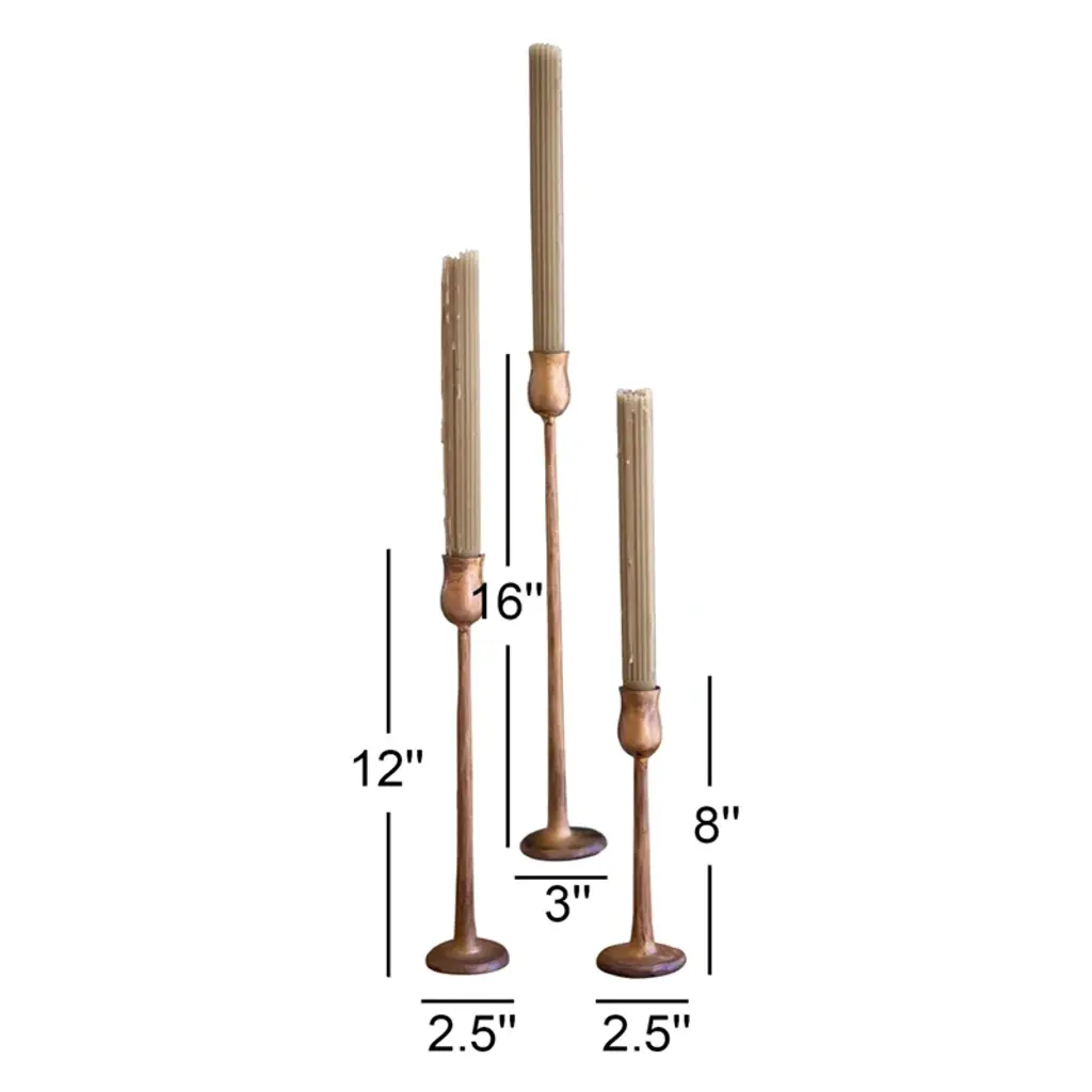 Add this set of three copper candle holders to your mantle or tabletop for height and dimension. These taper candle holders add interest to your collections or stand out independently.