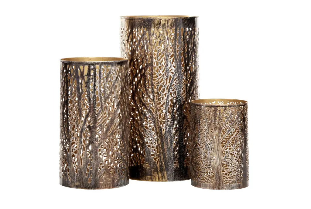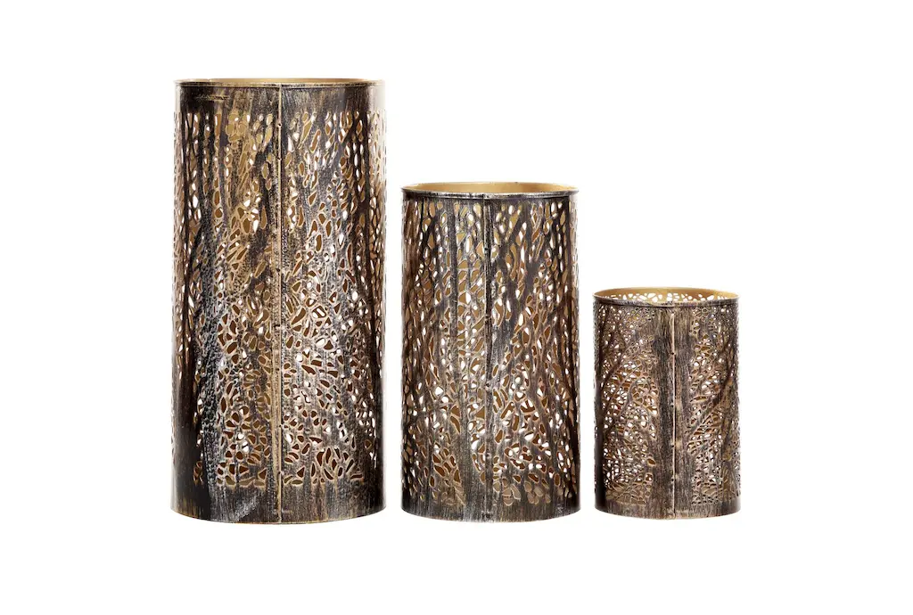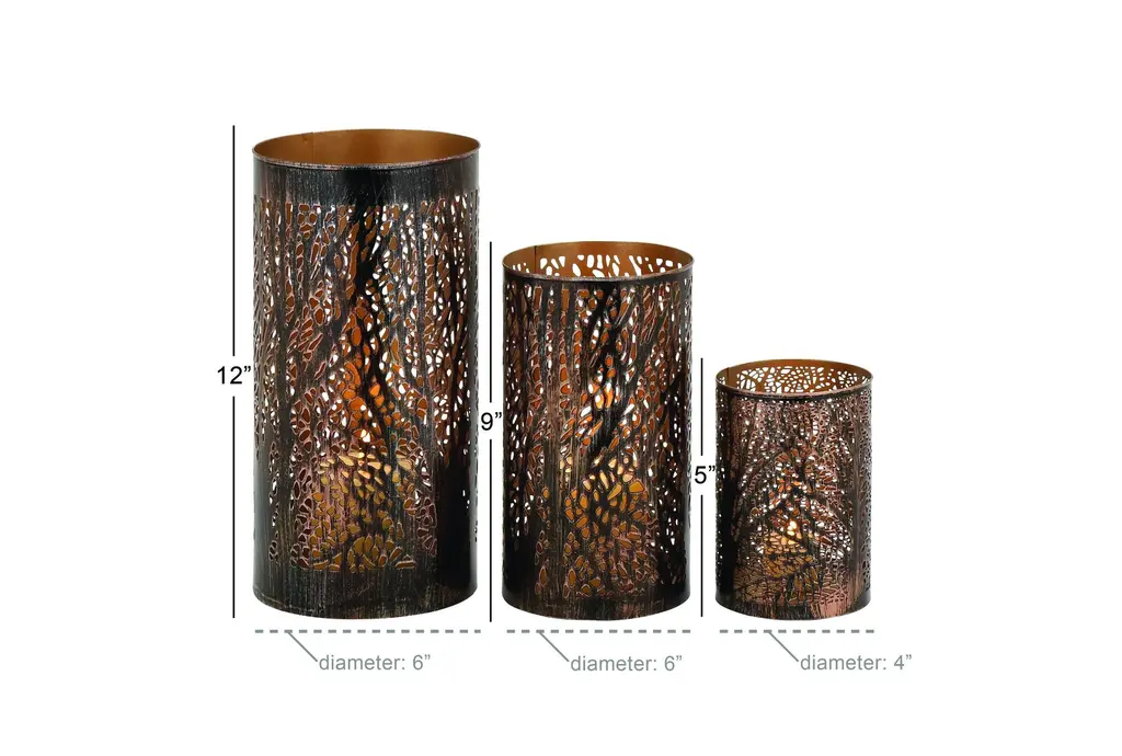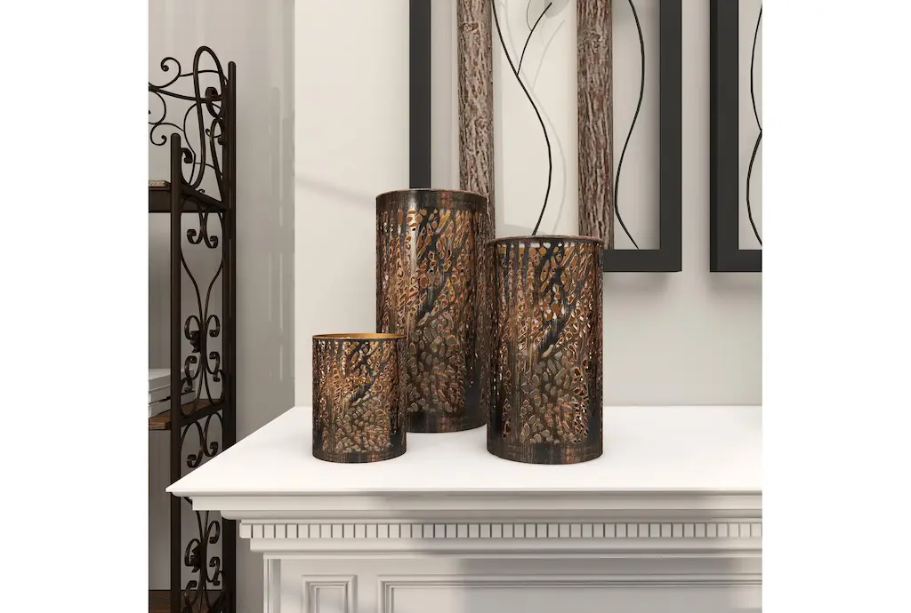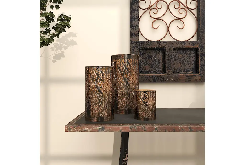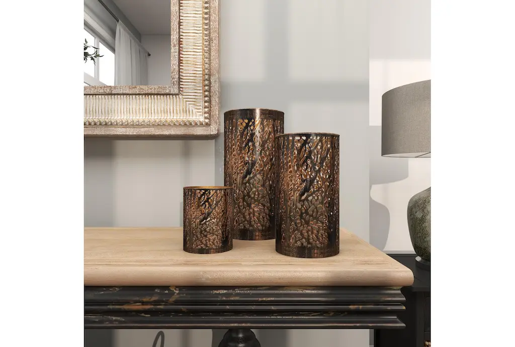 Delight your guests and make any occasion extra special by adding a lighted or flameless candle to this lantern. Made with a sturdy base, it is perfect for creating an elegant atmosphere at your table top or mantel. Add instant warmth and inviting ambiance to your home with these brown metal candle holders that are great addition to eclectic interior. Designed with felt or rubber stoppers at the base that prevent scratching furniture and table tops, as well as sliding around. Can hold 3 pillar candles, not included. This item ships in 1 carton. Please note that this item is for decorative use only. Suitable for indoor use only. This item ships fully assembled in one piece. Made in India. This bronze colored lantern candle holder comes as a set of 3. Eclectic style.