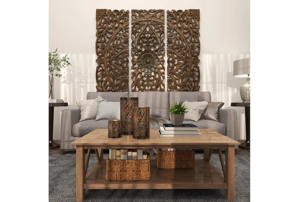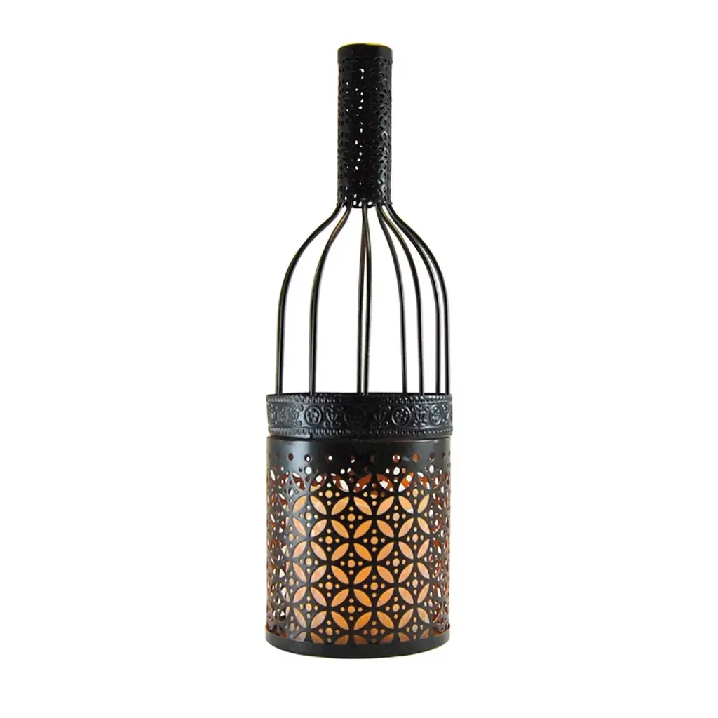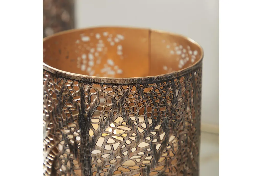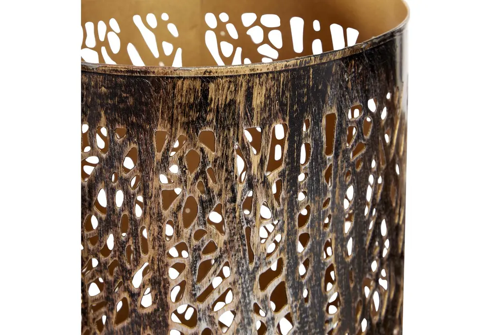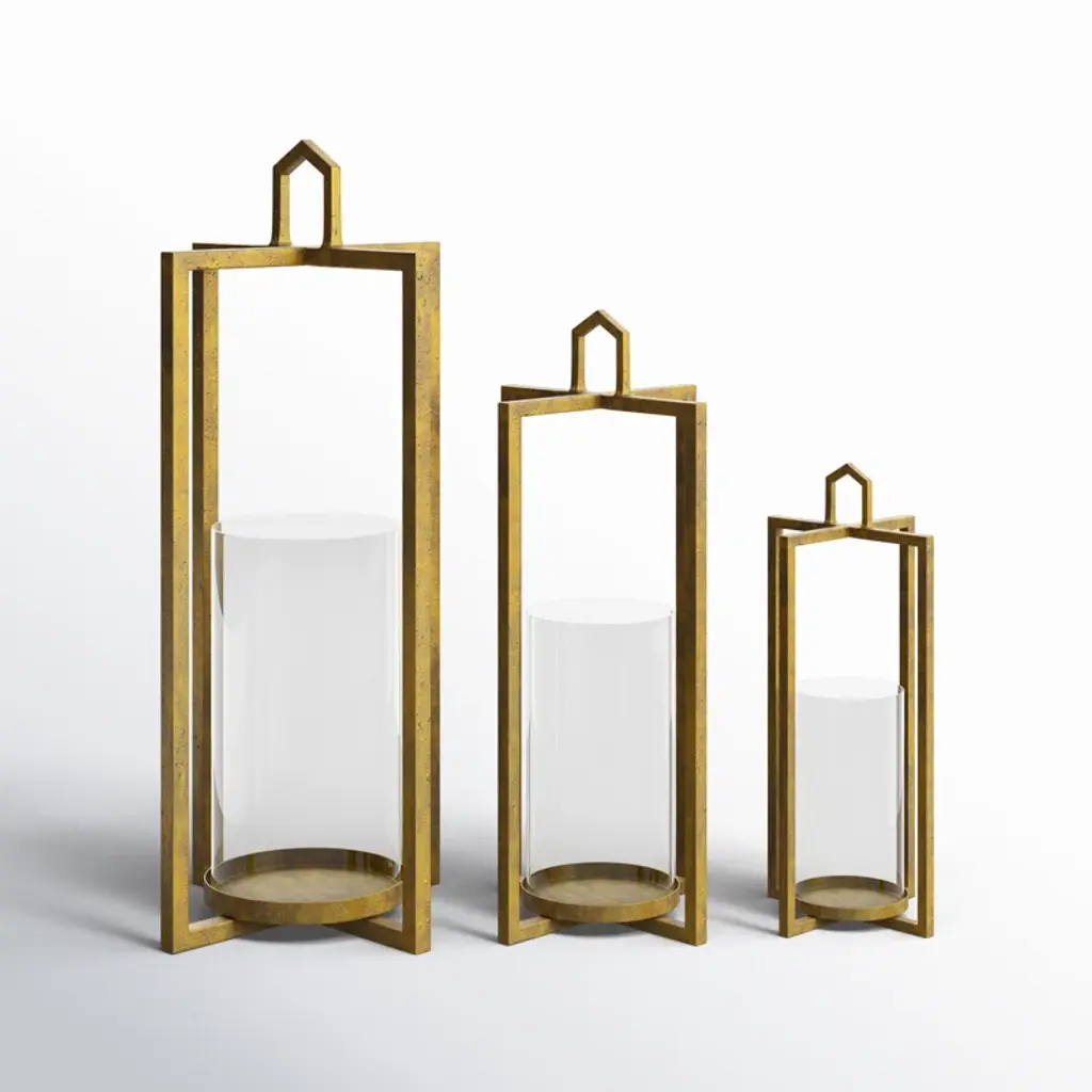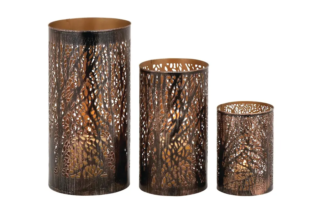 Delight your guests and make any occasion extra special by adding a lighted or flameless candle to this lantern. Made with a sturdy base, it is perfect for creating an elegant atmosphere at your table top or mantel. Add instant warmth and inviting ambiance to your home with these brown metal candle holders that are great addition to eclectic interior. Designed with felt or rubber stoppers at the base that prevent scratching furniture and table tops, as well as sliding around. Can hold 3 pillar candles, not included. This item ships in 1 carton. Please note that this item is for decorative use only. Suitable for indoor use only. This item ships fully assembled in one piece. Made in India. This bronze colored lantern candle holder comes as a set of 3. Eclectic style.
