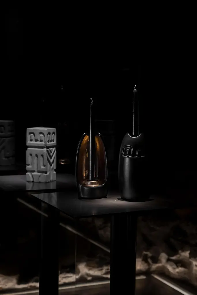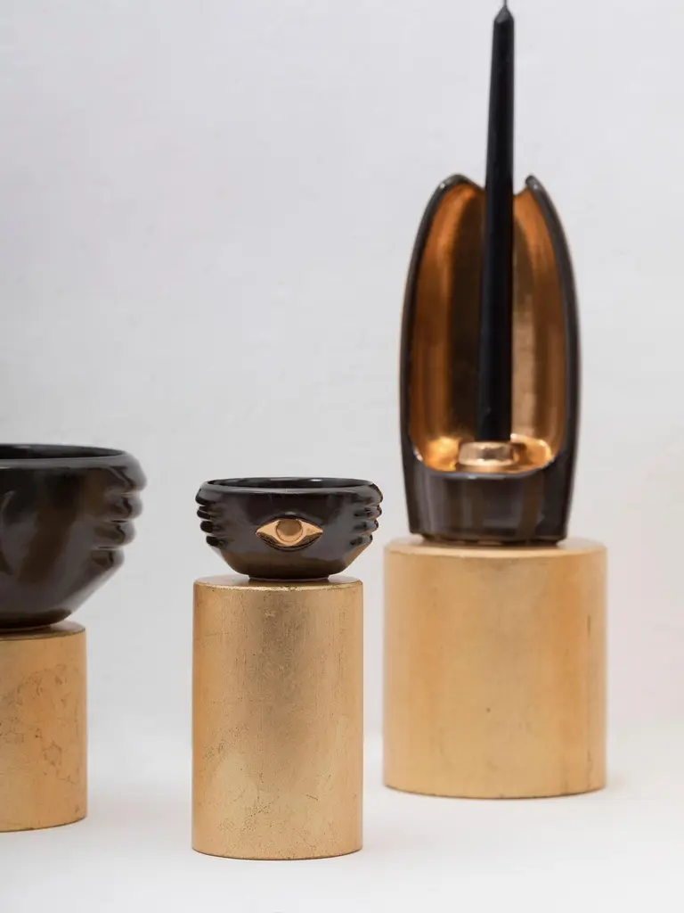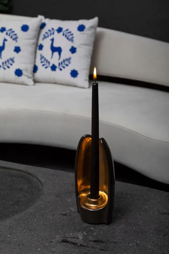 Decorative slip casted ceramic candleholder finished with a rich black or dark green glaze, highlighted with gold luster details, and ivory wax candles.An exploration of El Absoluto (4000 - 1800 BC), a carved-stone monolith with six facets, gazing in all directions, denoting expansion and depth.In an unprecedented collaboration, the distinguished pre-Columbian art museum, Museo Casa del Alabado, has invited ANDEAN to design a limited edition collection that bridges the past and present. ANDEAN X Museo Casa del Alabado breathes new life into ancient artifacts from the museum’s permanent collection. Housed within the historic confines of one of Quito's oldest structures, Museo Casa del Alabado is a repository of 21 distinct cultures that once thrived in ancient Ecuador.The ANDEAN X Museo Casa del Alabado collection pays tribute to Ecuador's ancient heritage of materials, craftsmanship, and iconography by thoughtfully reimagining artefacts from its permanent collection into beautiful home accessories for contemporary living—a manifestation of ANDEAN's mission to preserve and celebrate Ecuador’s diverse cultural legacy.The collection features organic humanized forms meticulously handcrafted in durable slip-casted ceramics, adorned with a durable matte black glaze reminiscent of the traditional barro negro. Delicate accents in gold luster capture the cultural essence of the pre-Columbian era in form and detail, conveying the significance of gold and the sun in the region’s ancestral communities.Item comes with 12 SETS of complimentary candlesARTISANS:Palo Santo Taller: Ceramic Hand-building and Slip CastingJaneth Muñoz: Traditional Candle Making