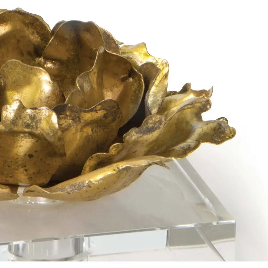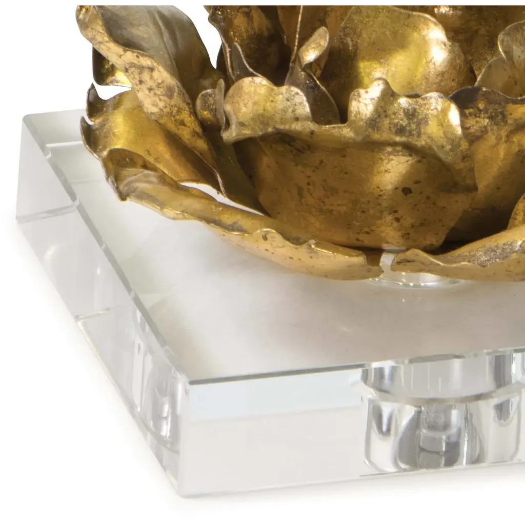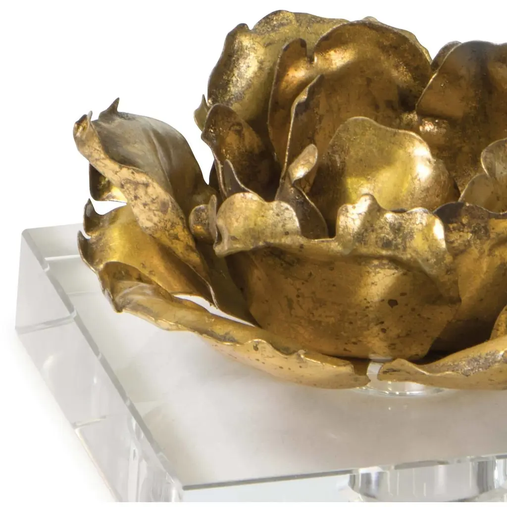 Boasting gold blossom-like accents, this piece is a forward-thinking work of art. Placed on top of a crystal base completes the glamorous look. For added elegance, a single tapered candle can be inserted into the center of the flower to illuminate your space.