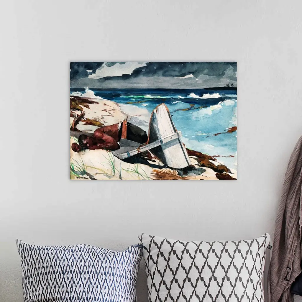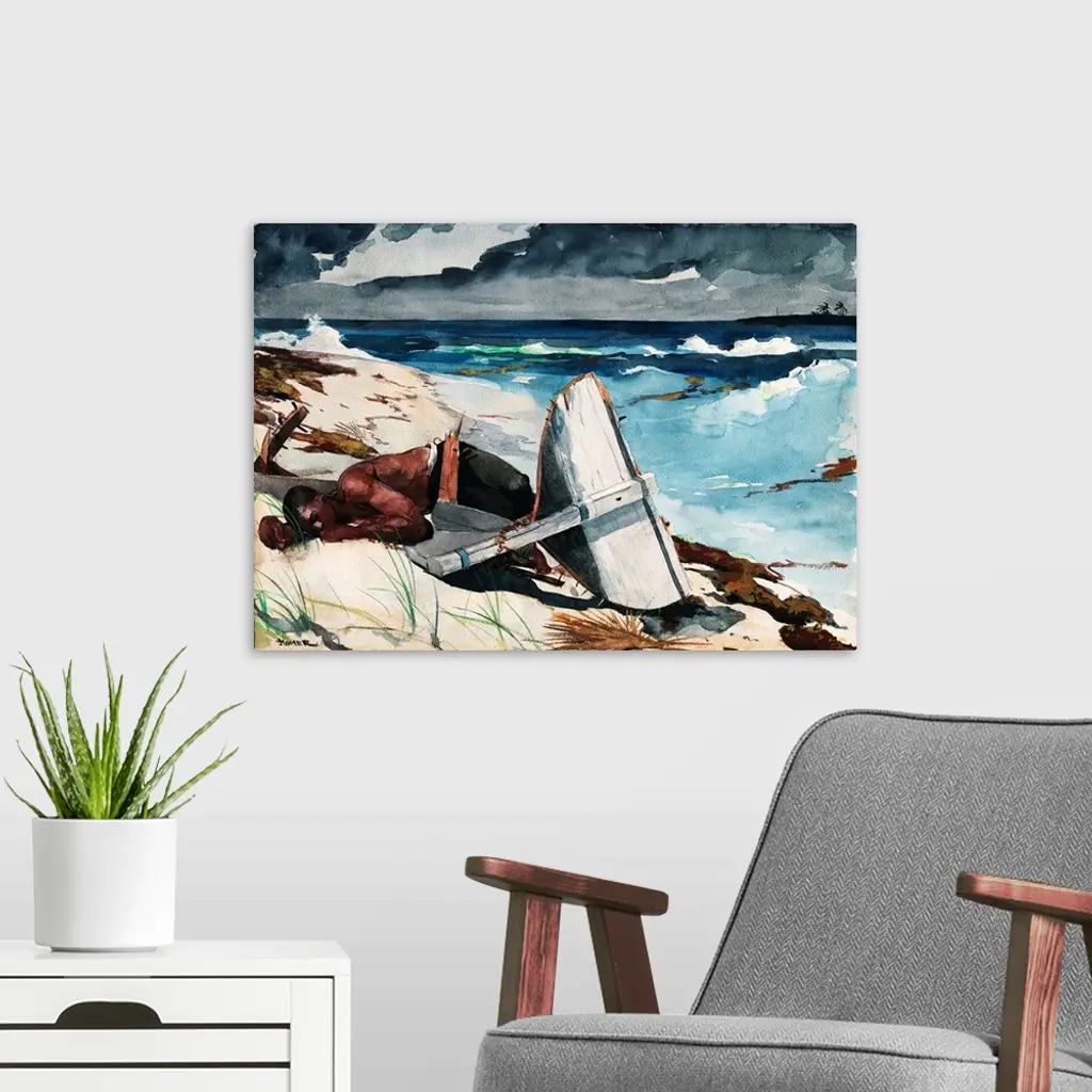 Revered as America's master of watercolor, Winslow Homer did not begin working in the medium until the mature age of thirty-seven. As a watercolorist, Homer adapted his practice to the diverse locales he visited. His sojourns in the tropics took him to the Bahamas, Bermuda, Cuba, and various locations in Florida. In each new environment, the self-taught artist pushed the flexible medium in new directions as he applied his increasingly sophisticated understanding of color and light to a new set of atmospheric conditions. This compelling watercolor was painted during Homer's second trip to the Bahamas in the winter of 1898 - 99. Depicting a luckless man washed up on the beach, surrounded by fragments of his shattered craft, the work demonstrates the artist's fascination with the rapid and dangerous weather changes of the region. Here sunlight glints through gradually thinning storm clouds. Homer employed thickly applied opaque red and yellow pigments for the seaweed tossed on the sand, creating a contrast with the thin washes and fluid brushstrokes that he used to render the receding waves.