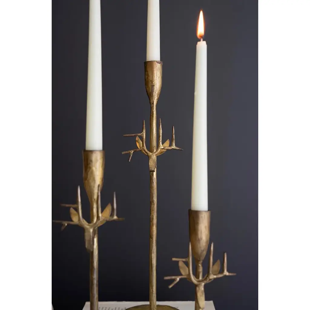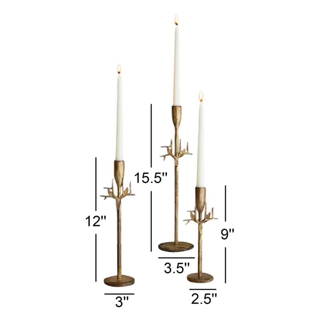 Make room for this set of three deer antler taper holders. Use them for the holiday or the hunting lodge. With forged iron construction and an antique gold finish, this set is made in India.