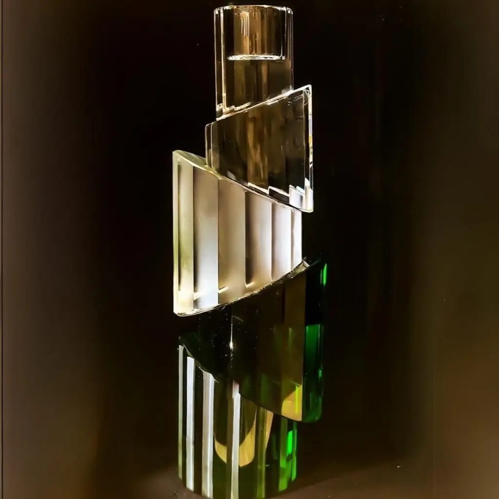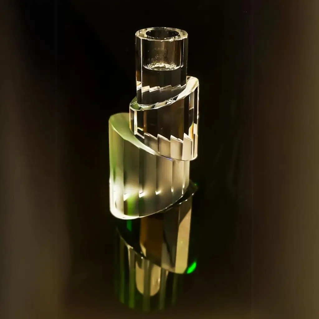 all' Eden is a stunning hand-cut crystal tea light holder that seamlessly blends intricate craftsmanship with architectural innovation. This modern crystal candlestick pushes the boundaries of high-end home decor and introduces a new language to crystal candle holders. The asymmetrically attached green and clear crystal parts create an eccentric yet harmonious piece of elegance in contemporary aesthetics. Crafting this exquisite Arcaicó crystal candleholder was a labor of love, requiring meticulous attention to detail and innovative techniques to achieve a flawless crystal decor. all' Eden elevates any living space to museum-worthy standards. This contemporary, yet classic hand-cut crystal decor is a perfect gift idea for loved ones, including yourself, and for those seeking handmade luxury home decor and elegant accents to adorn their surroundings.