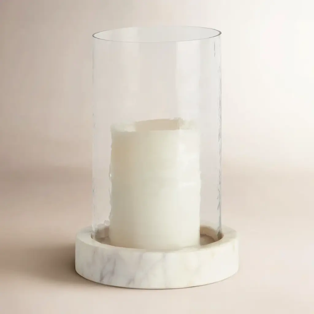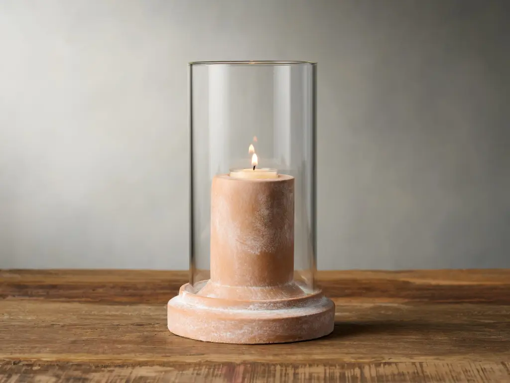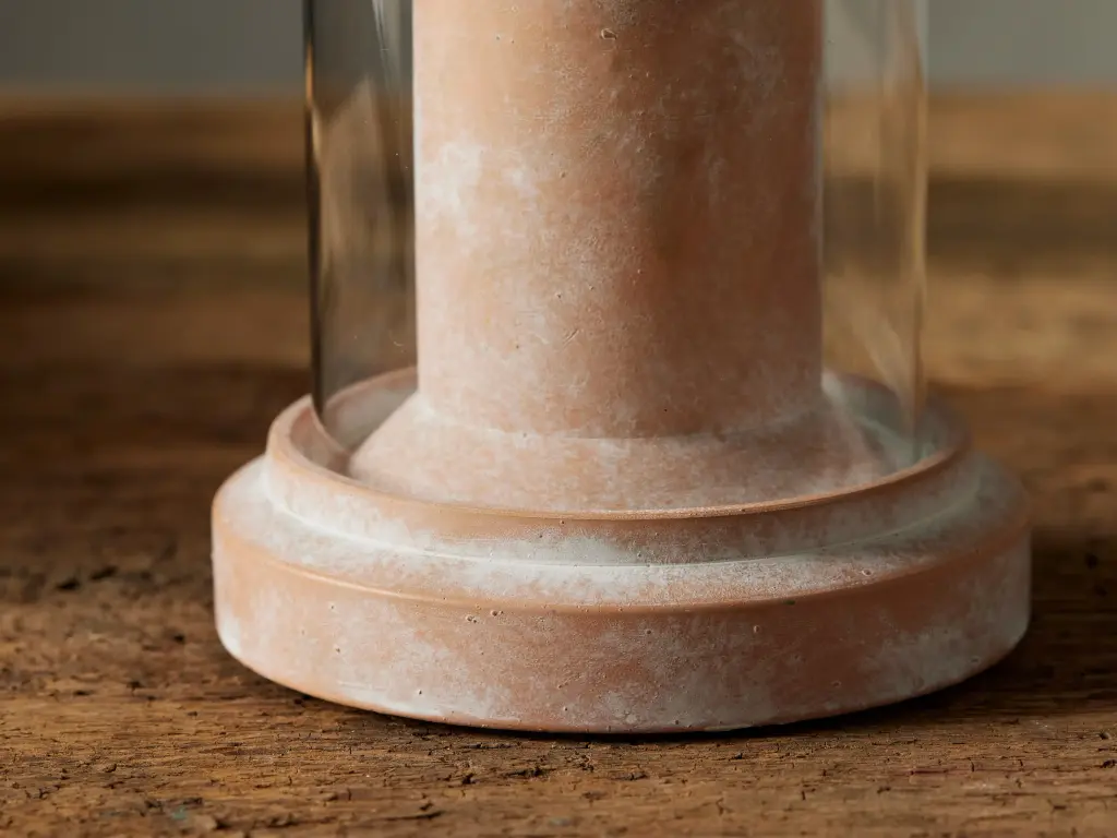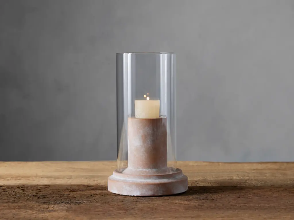 Grounded by a cement base in a terracotta finish, our Altair Hurricane is topped with an elegant glass cloche to allow your favorite candle to glow with an elevated, organic appeal.