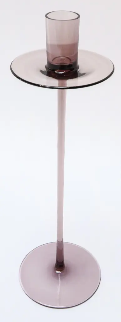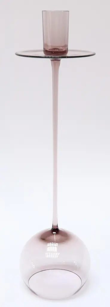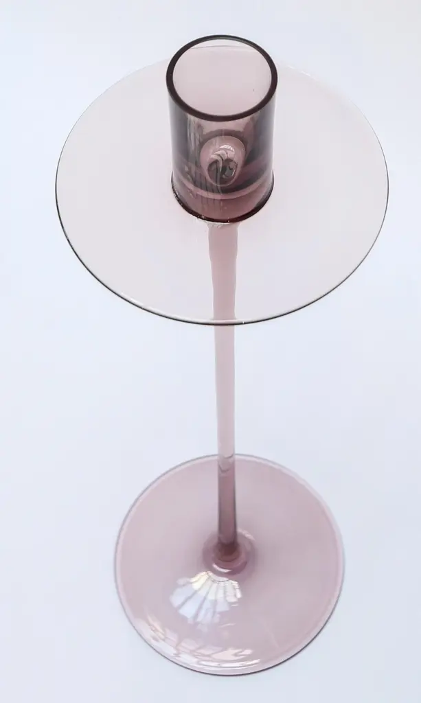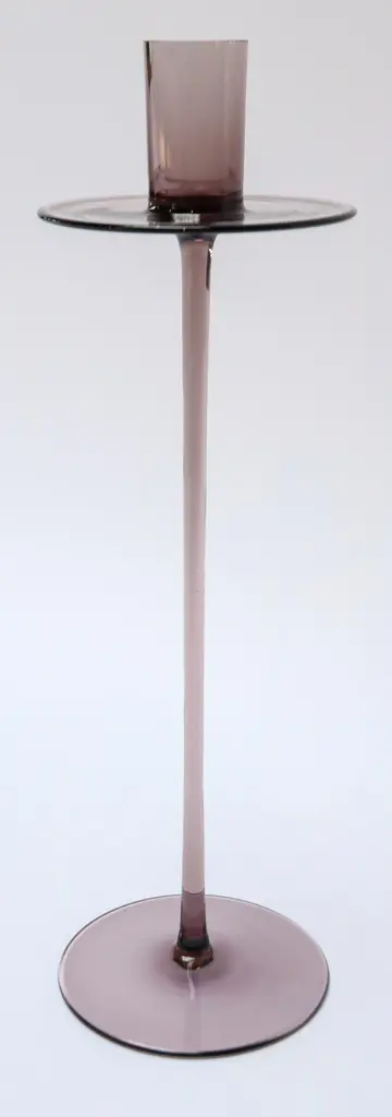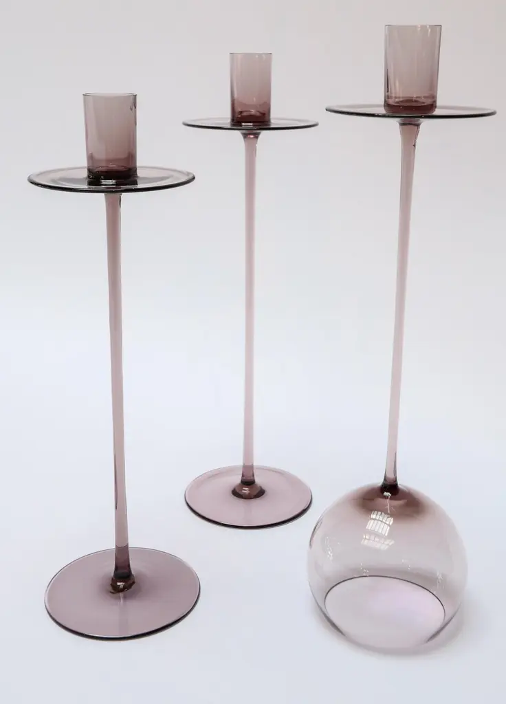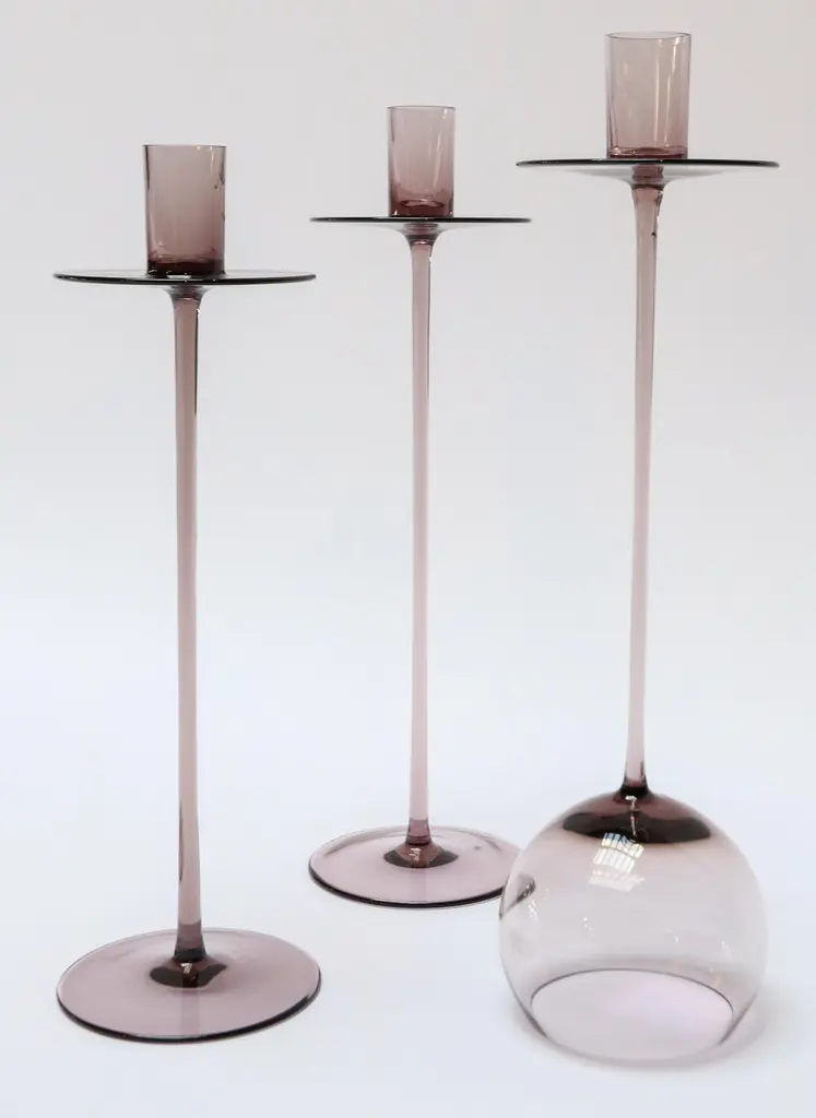 Anna Torfs Tilo glass candlesticks in plum. Available in other colors. Priced individually. Shipping from Europe not included.Measures: Tilo candlesticks low (12.75" high x 4" diameter) plum $550Tilo candlesticks middle (13.5" high x 4" diameter) plum $600Tilo candlesticks high (14.5" high x 4" diameter) plum $750.