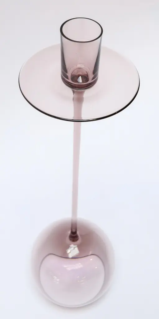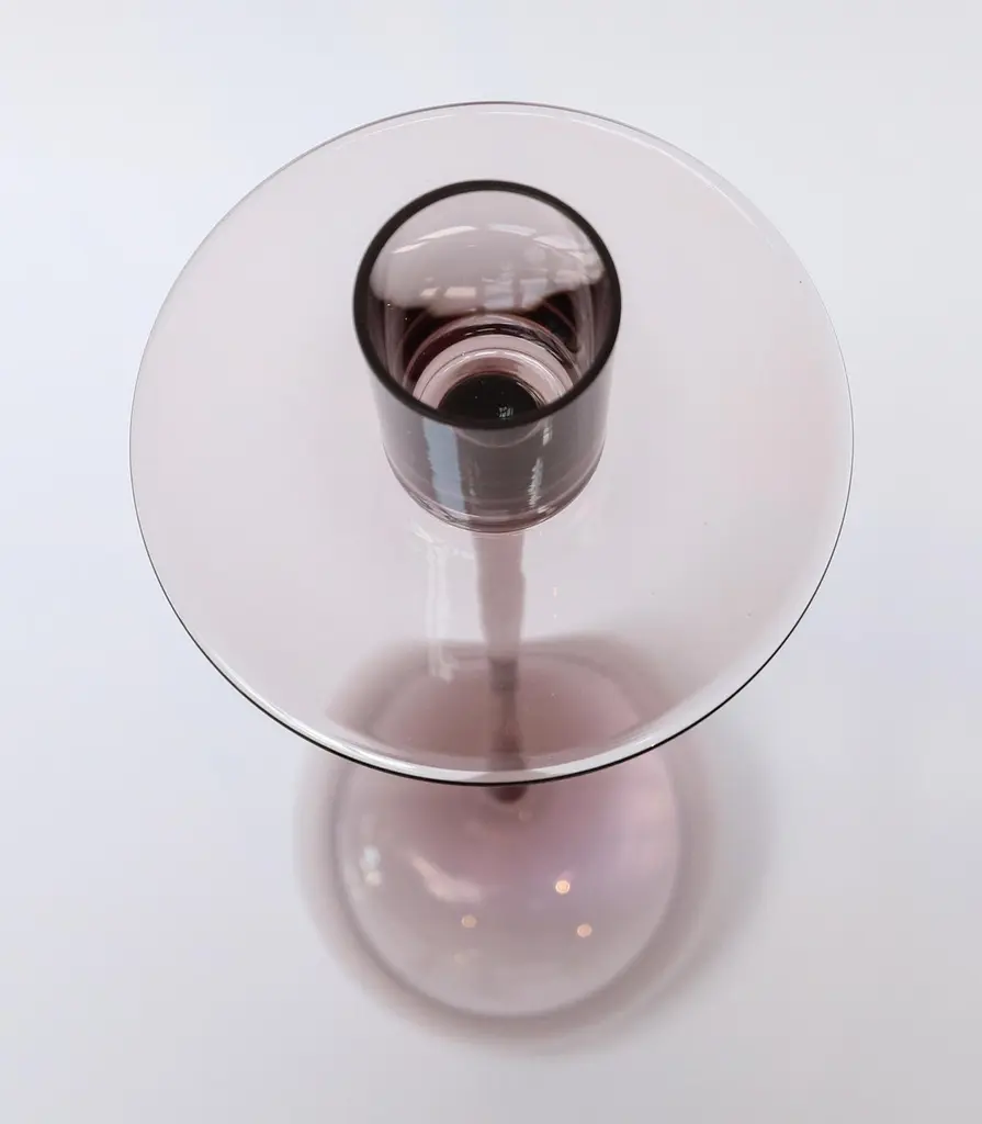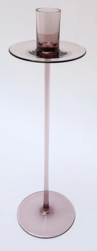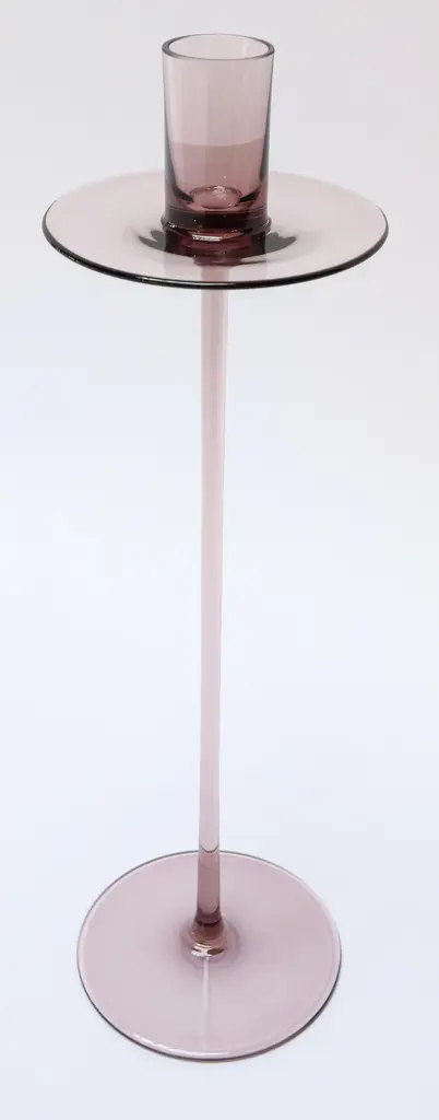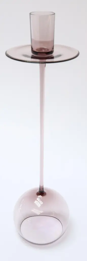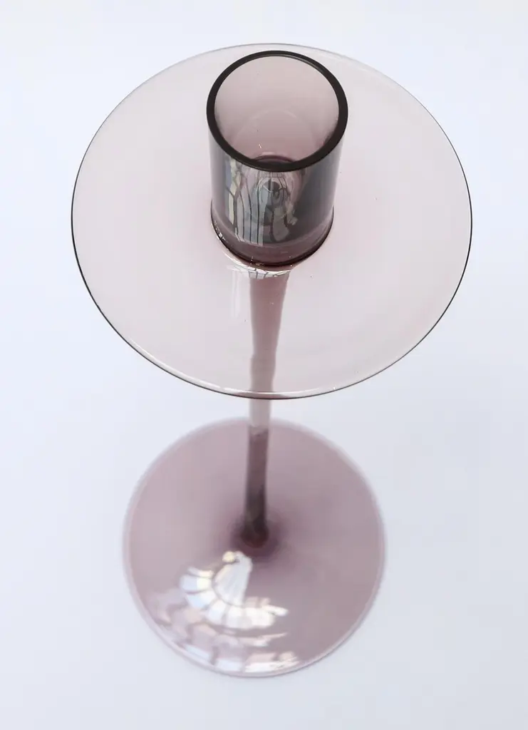 Anna Torfs Tilo glass candlesticks in plum. Available in other colors. Priced individually. Shipping from Europe not included.Measures: Tilo candlesticks low (12.75" high x 4" diameter) plum $550Tilo candlesticks middle (13.5" high x 4" diameter) plum $600Tilo candlesticks high (14.5" high x 4" diameter) plum $750.