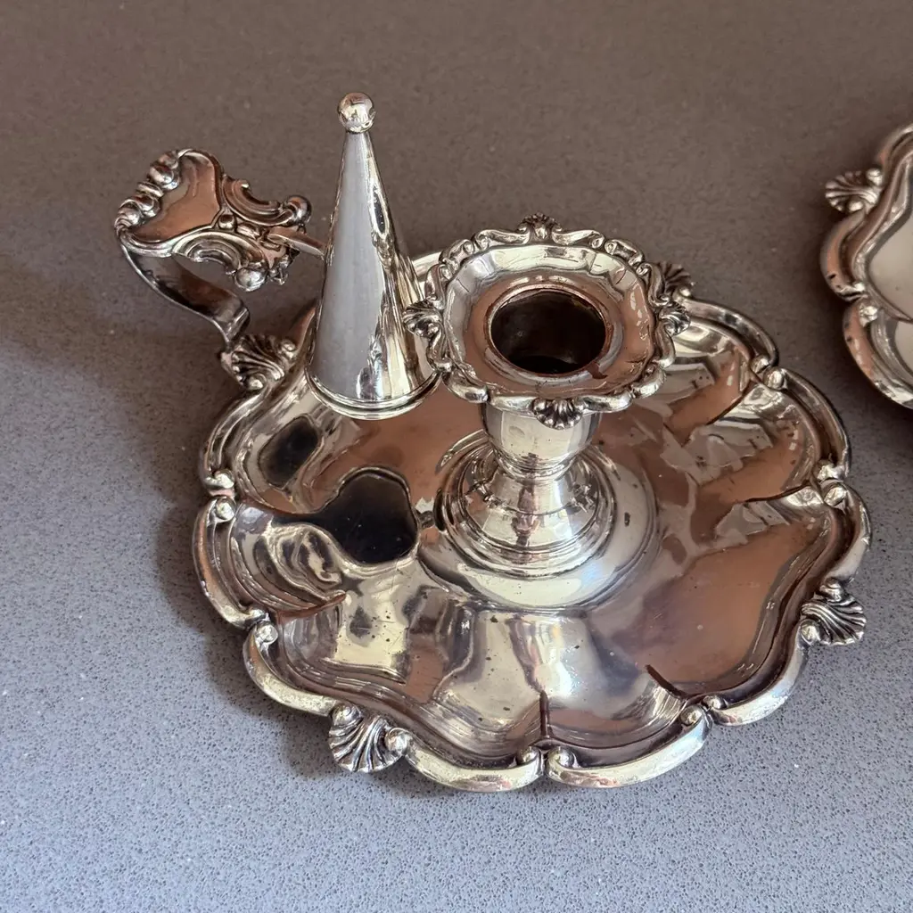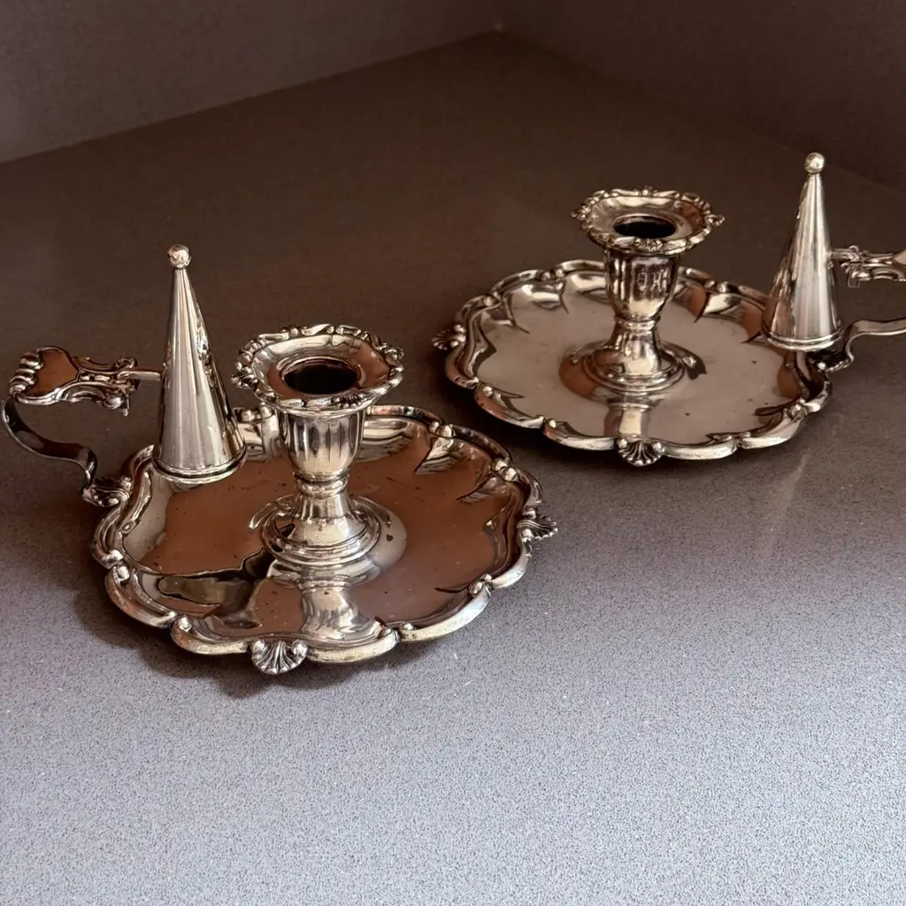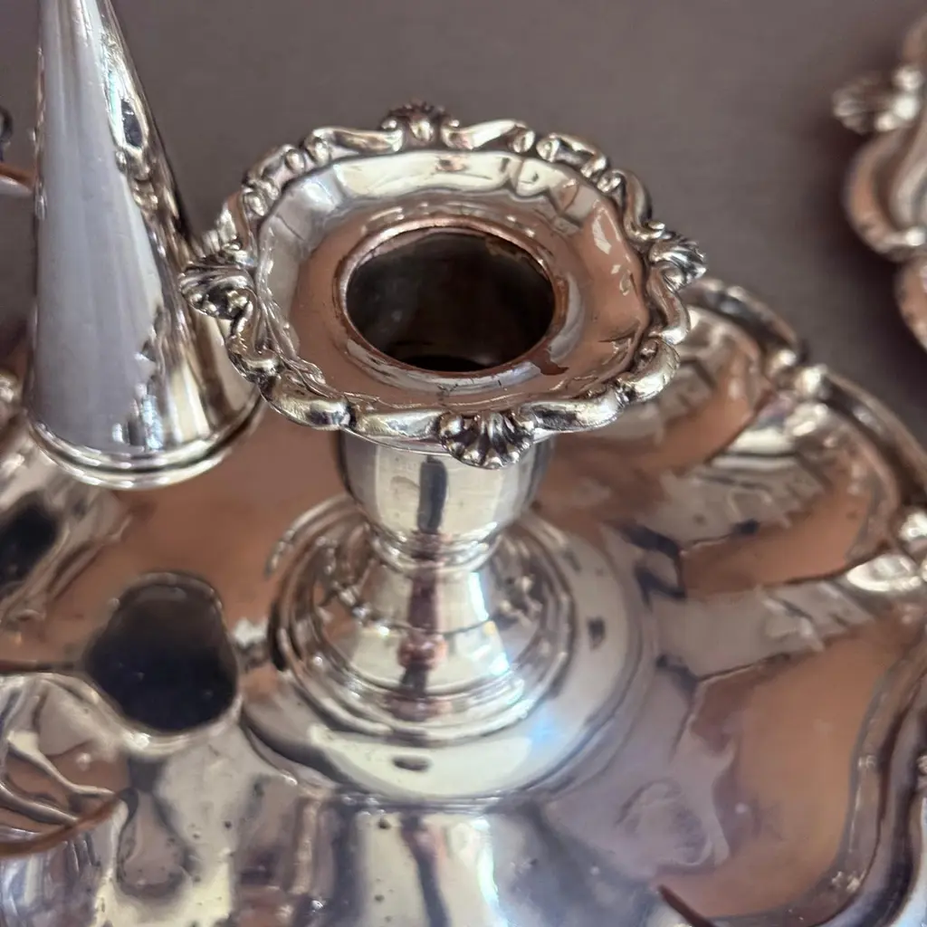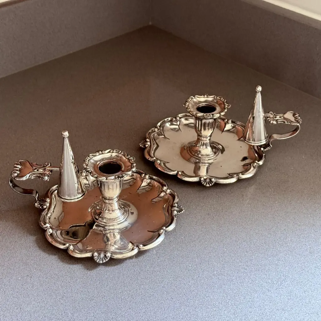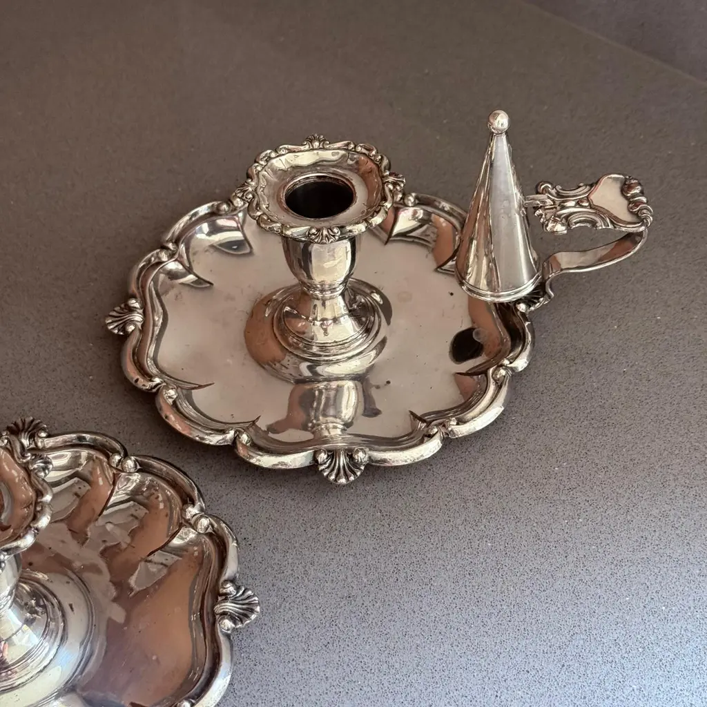A pair of refined antique silver-plated candlestick, designed with elegant proportions and ornamental detailing typical of late 19th to early 20th-century tableware. The piece features a sturdy base with decorative accents, making it both functional and highly decorative.Crafted in the Victorian / Edwardian style, this candlestick would have graced a formal dining table or parlor, providing both light and atmosphere. Today, it serves as a versatile decorative object, perfect for classic interiors, period-style dining, or as a collectible accent in a silverware display.The silver-plated surface retains its antique charm with gentle wear consistent with age, highlighting its authentic patina.Whether used for candlelight dinners, mantelpiece styling, or interior decoration, this candlestick offers timeless elegance and historical character.Key Details:Material: Silver platePeriod: Late 19th – early 20th centuryStyle: Victorian / EdwardianType: Candlestick / Candle holderCondition: Good antique condition with age-related wear (see photos)Dimensions: [Insert height and base diameter]Keywords for Visibility:antique silver-plated candlestick, Victorian silver candle holder, Edwardian silverplate décor, antique silver home accents, silver-plated candle holder, decorative silver candlestick, 19th century silver candle stand, antique silver dining accessories, collectible silver table décor, interior design candle lightingIt is in beautifully excellent condition.