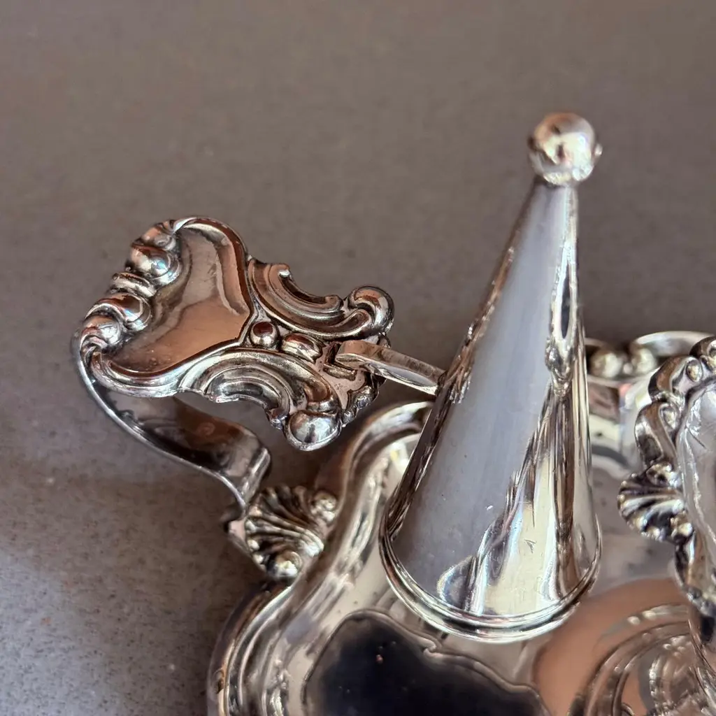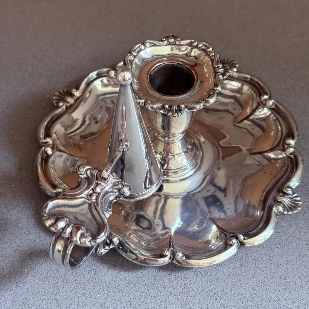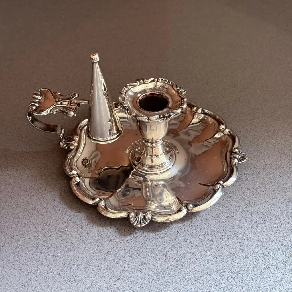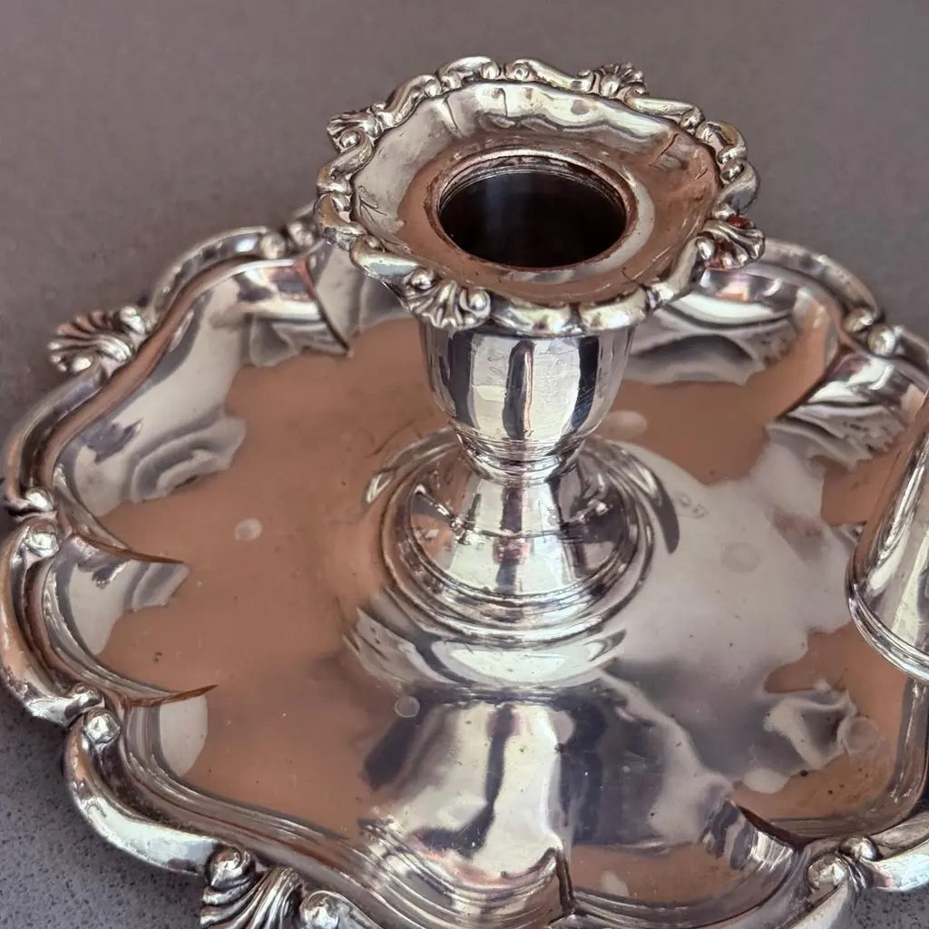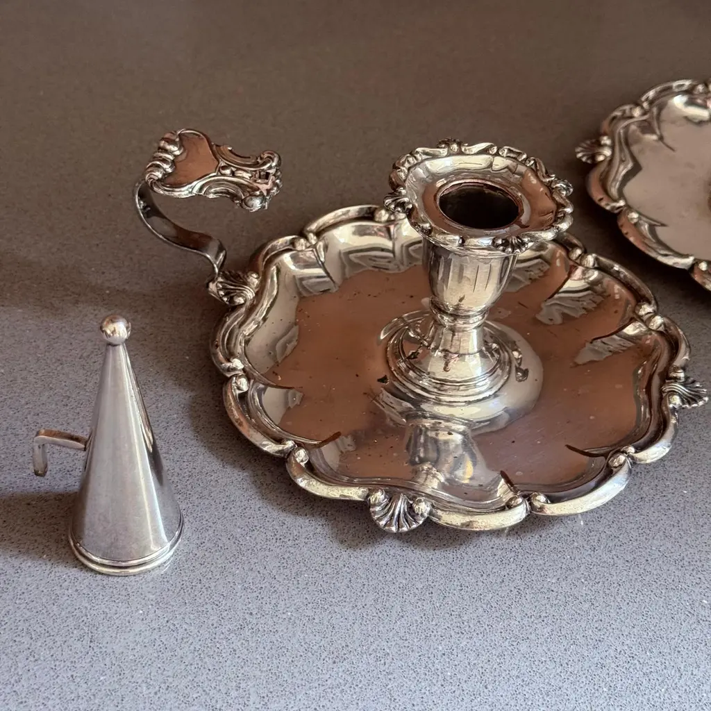 A pair of refined antique silver-plated candlestick, designed with elegant proportions and ornamental detailing typical of late 19th to early 20th-century tableware. The piece features a sturdy base with decorative accents, making it both functional and highly decorative.Crafted in the Victorian / Edwardian style, this candlestick would have graced a formal dining table or parlor, providing both light and atmosphere. Today, it serves as a versatile decorative object, perfect for classic interiors, period-style dining, or as a collectible accent in a silverware display.The silver-plated surface retains its antique charm with gentle wear consistent with age, highlighting its authentic patina.Whether used for candlelight dinners, mantelpiece styling, or interior decoration, this candlestick offers timeless elegance and historical character.Key Details:Material: Silver platePeriod: Late 19th – early 20th centuryStyle: Victorian / EdwardianType: Candlestick / Candle holderCondition: Good antique condition with age-related wear (see photos)Dimensions: [Insert height and base diameter]Keywords for Visibility:antique silver-plated candlestick, Victorian silver candle holder, Edwardian silverplate décor, antique silver home accents, silver-plated candle holder, decorative silver candlestick, 19th century silver candle stand, antique silver dining accessories, collectible silver table décor, interior design candle lightingIt is in beautifully excellent condition.