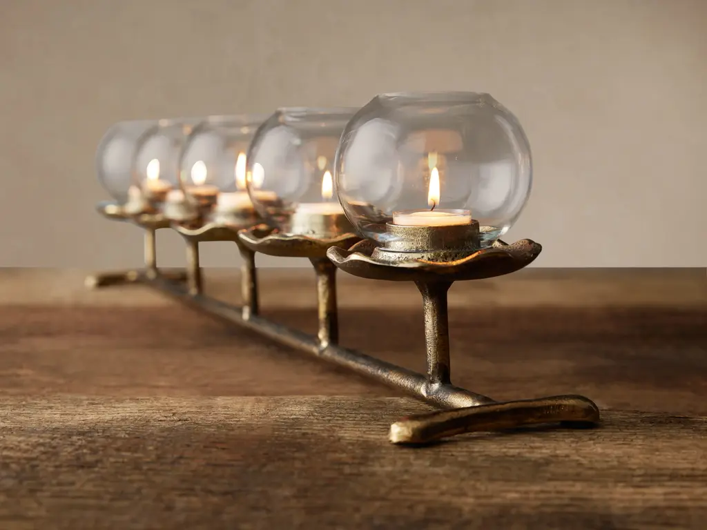 Make a statement-making display on any tabletop with our unique Artemis Multi Holder. Shaped by Indian artisans, cast from aluminum and finished in a brass tone, this multi-armed tealight holder creates a rustic, handcrafted aesthetic. Crafted in India cast from aluminum. Features an antique brass finish. Recommended for tealight use only.