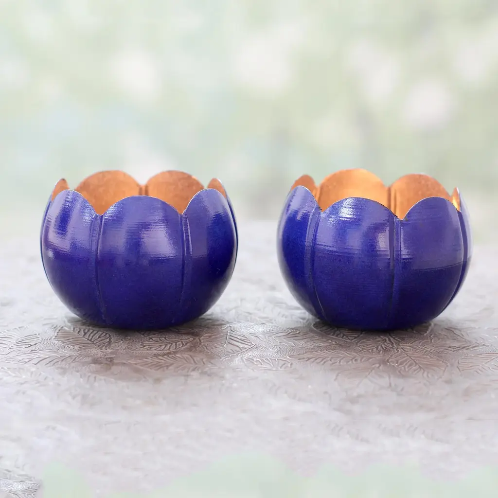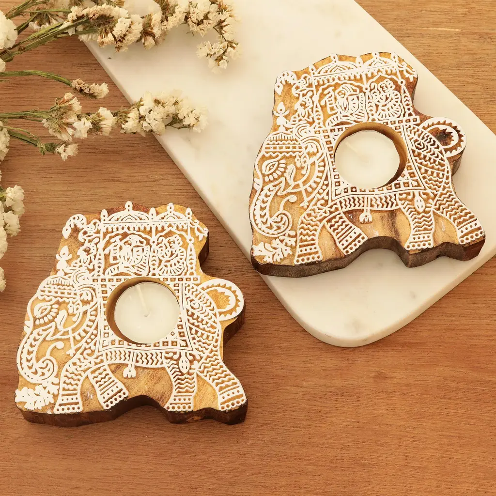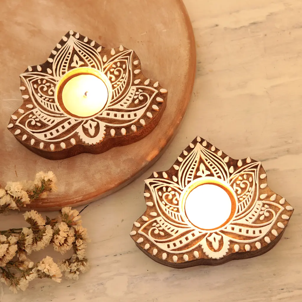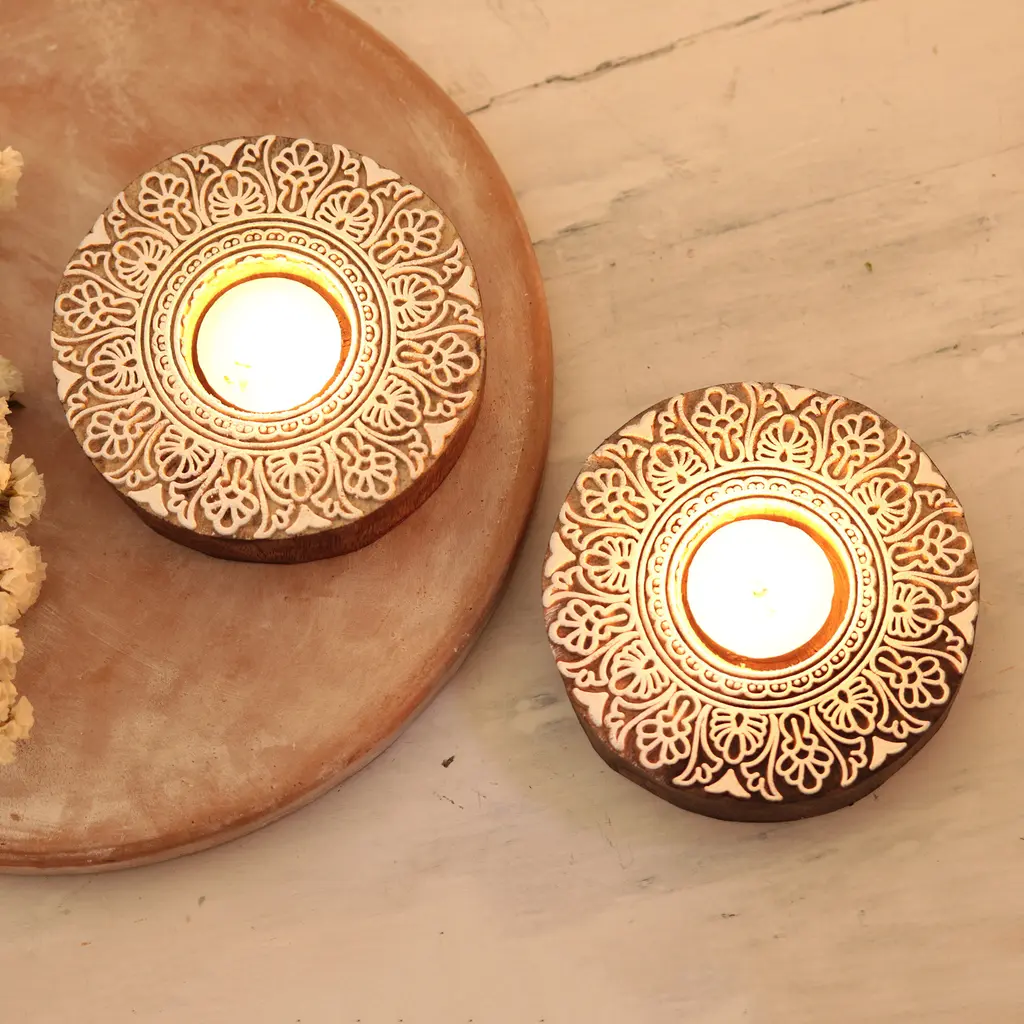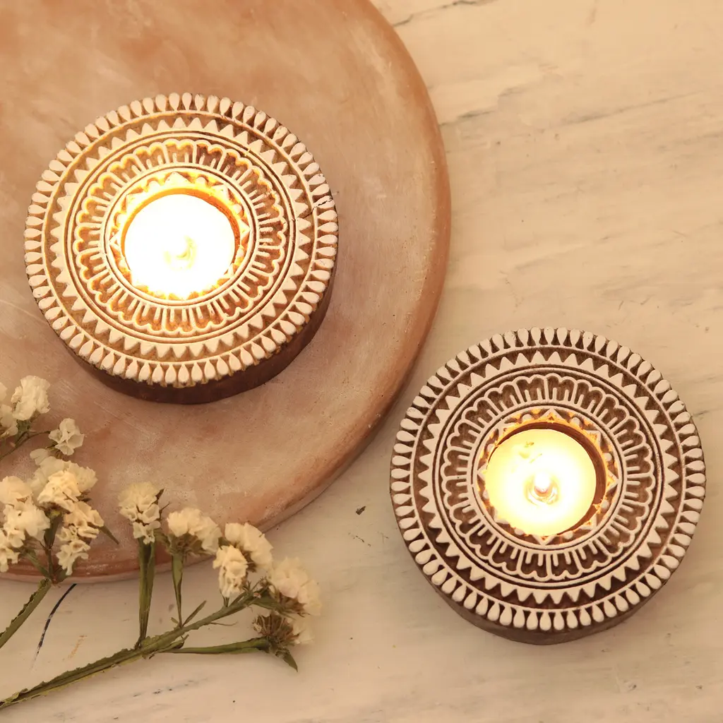 Artisan Crafted Mango Wood Tealight Candle Holders (Pair)- Ignite The Light
