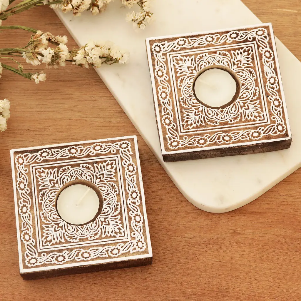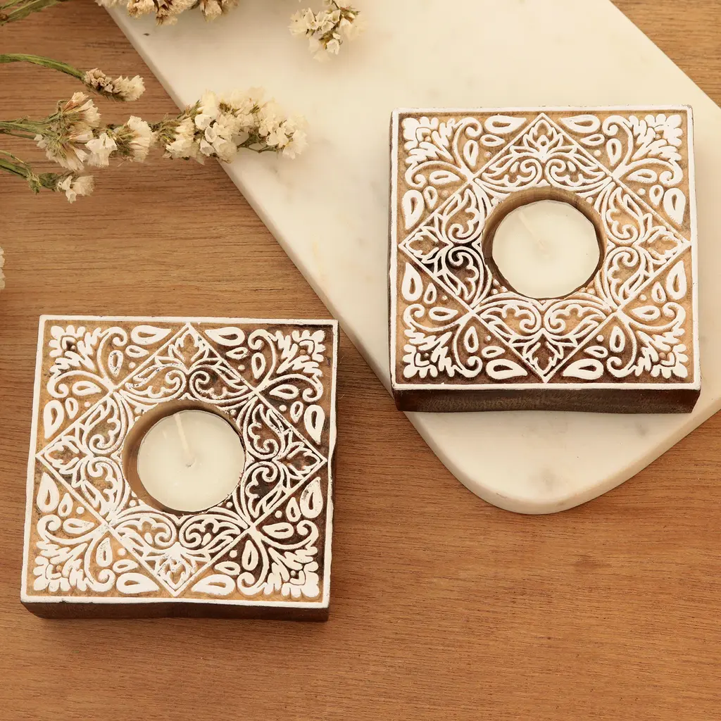 With their raised, floral designs, Tariq Khan's pair of tealight candle holders are inspired by traditional block-printing used widely throughout East Asia. Carved in relief by Indian artisans, the hand-chiseled designs are painted white, contrasting beautifully with the natural mango wood below.