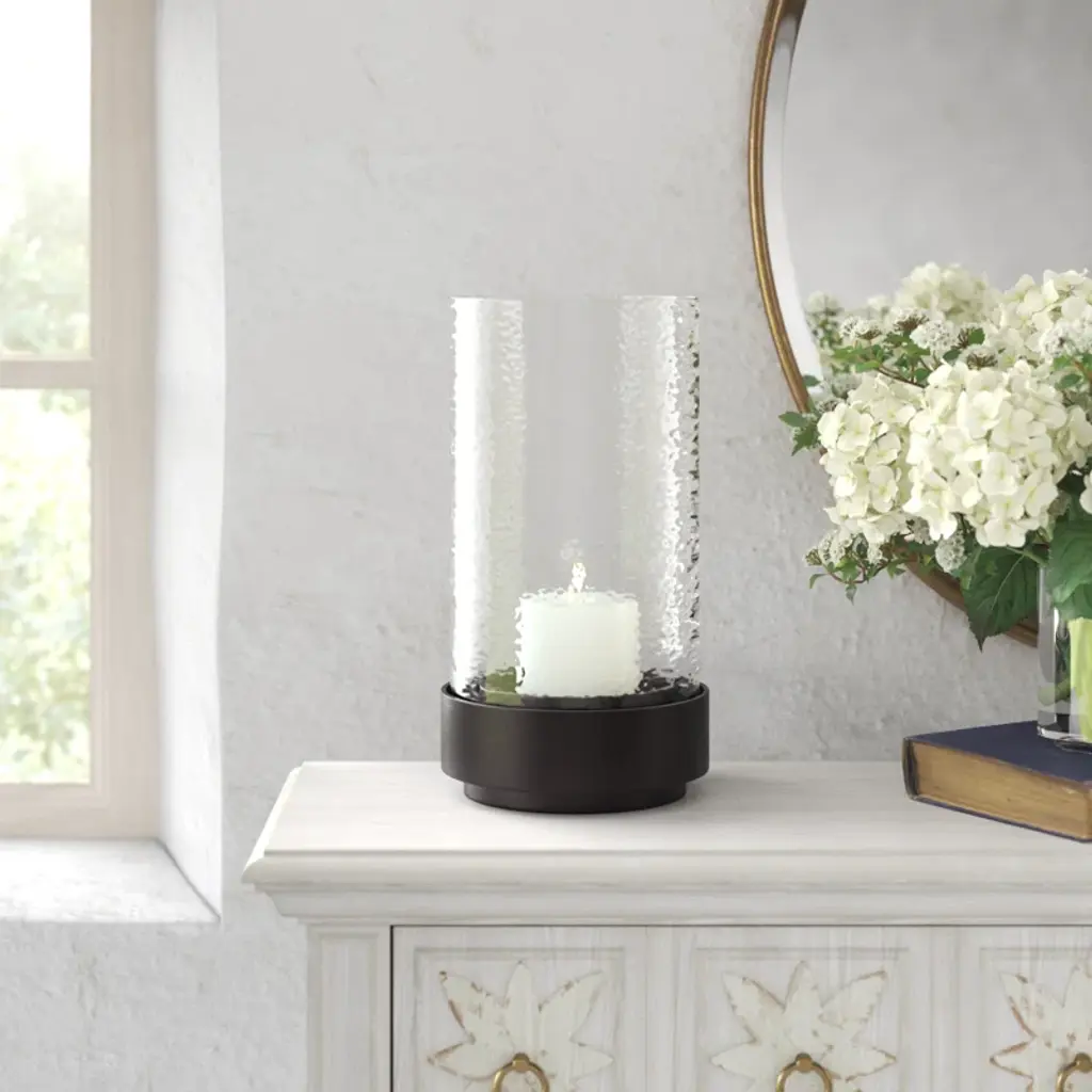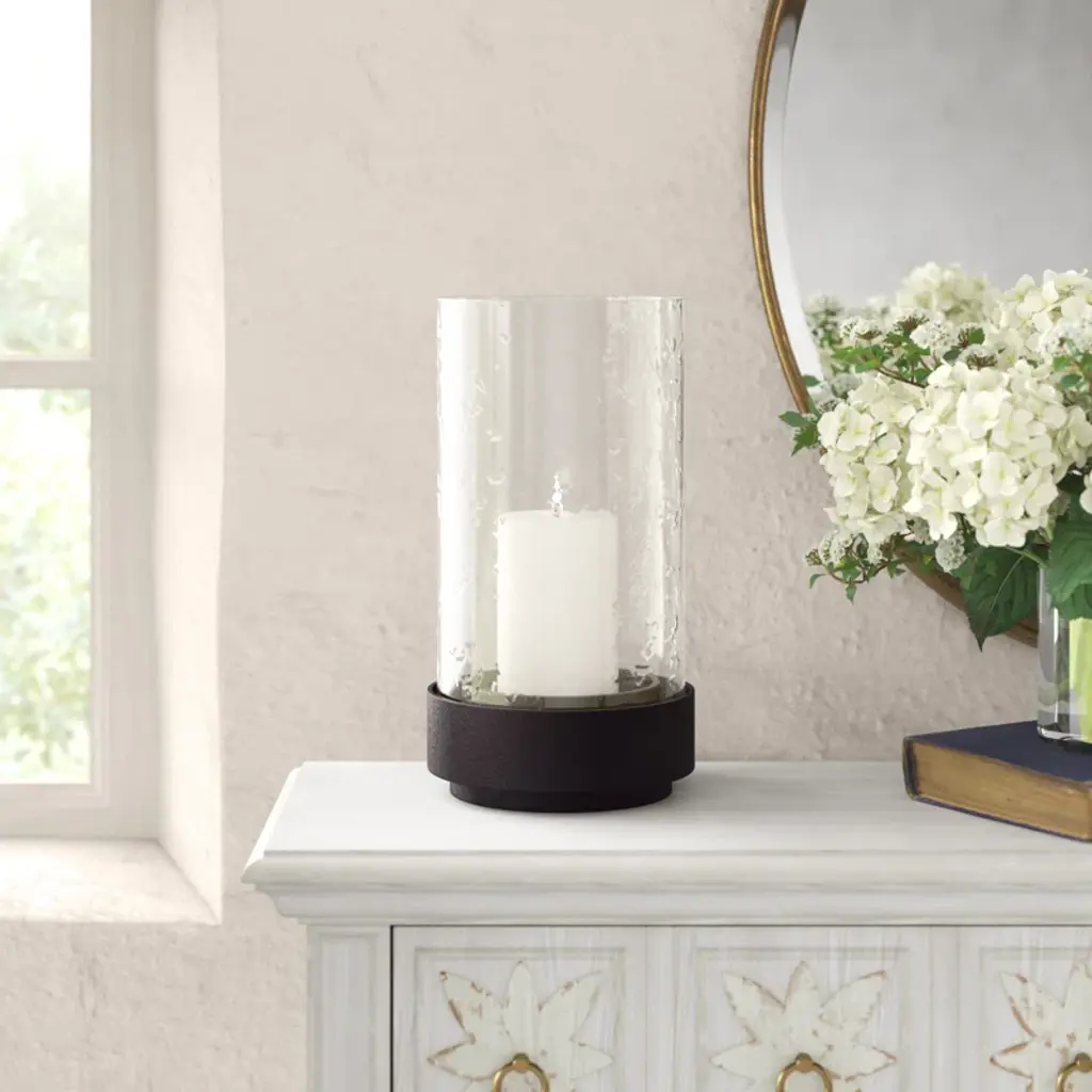 Architectural in design, a simple glass form fits into a grooved metal base. Its warm weathered patina makes it perfect for the industrial modern space.