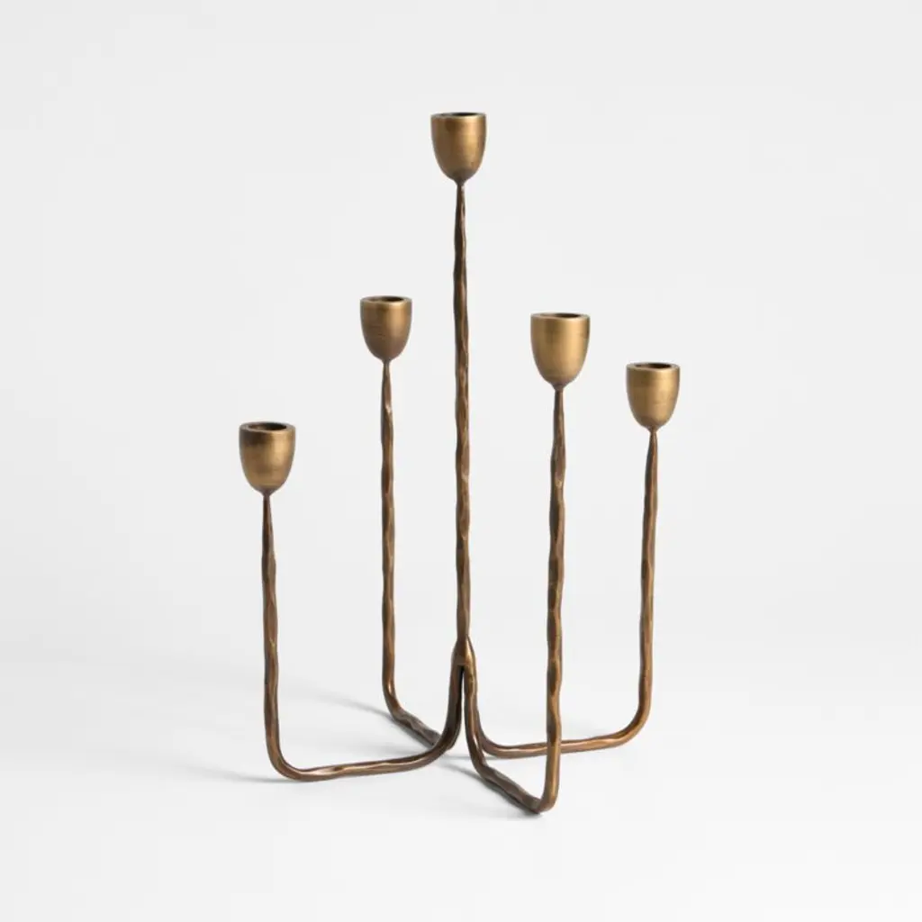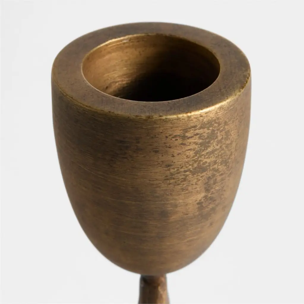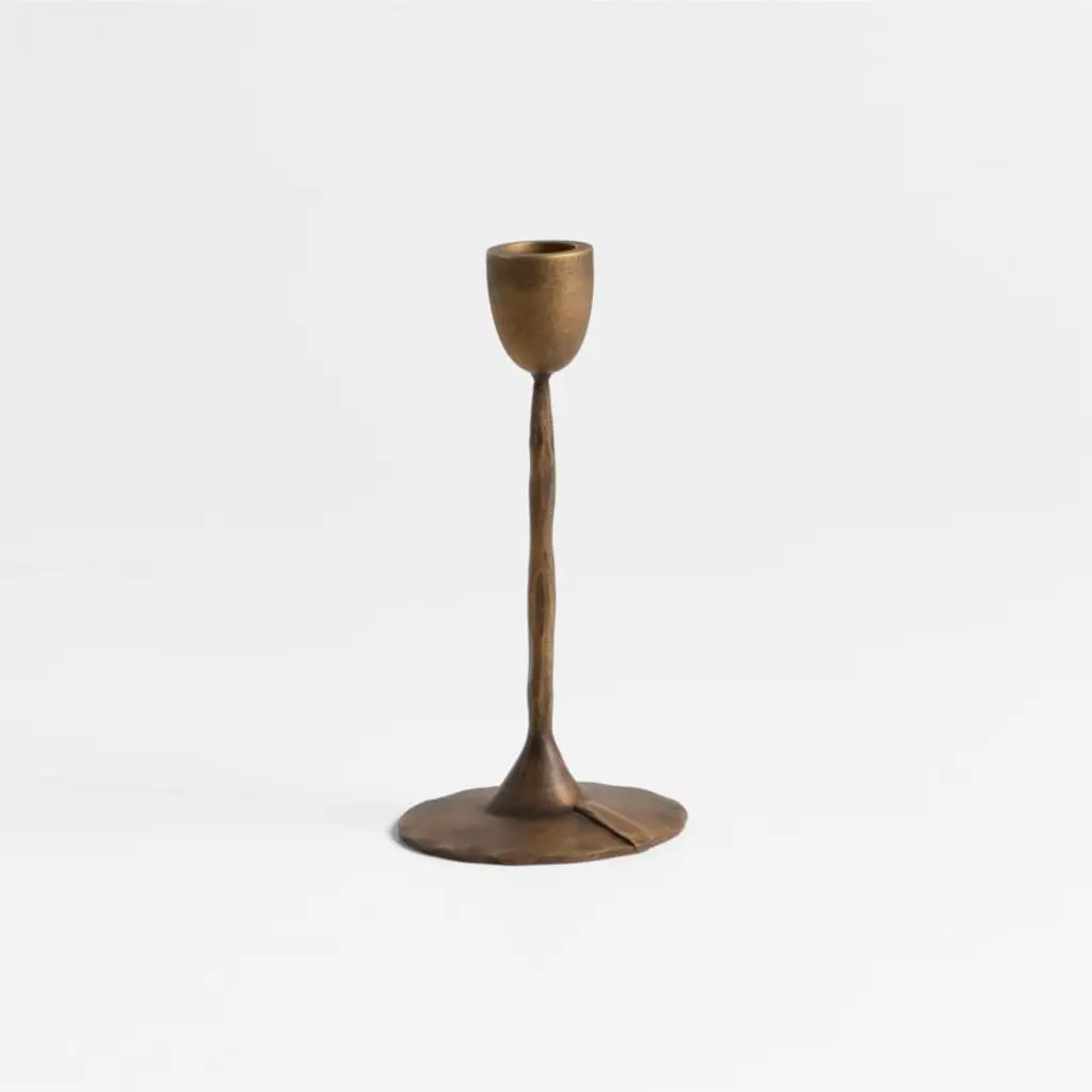 Hand-forged texture and an aged brass finish give our small Barteau candle holder the look of a found antique, while the minimalist shape and unexpected proportions are purely modern. Topped with a substantial support for a taper, the ultra-slender upright flows into a flared base. The gleaming candlestick reflects light to create fascinating, flickering illumination on a dining table, mantel or dresser.