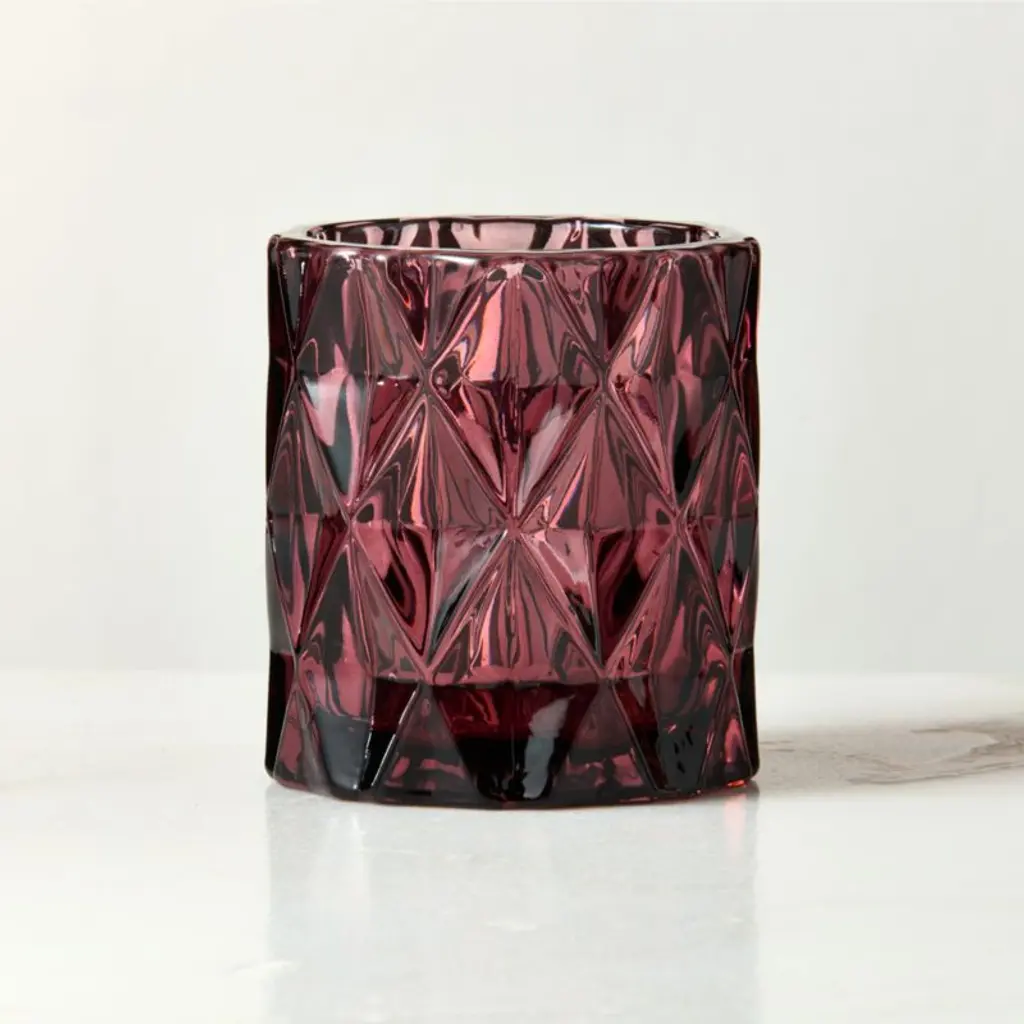 Red faceted glass gives these tealight candle holders that traditional cafe look we love. Each facet is illuminated by flickering candlelight, casting a warm, dynamic glow. CB2 exclusive.