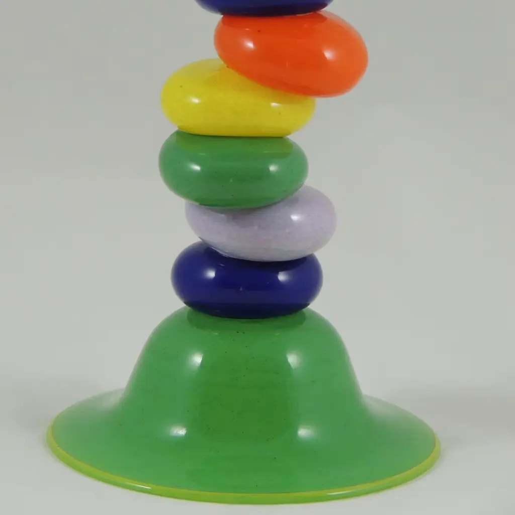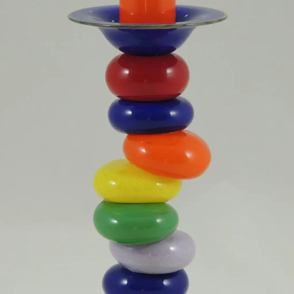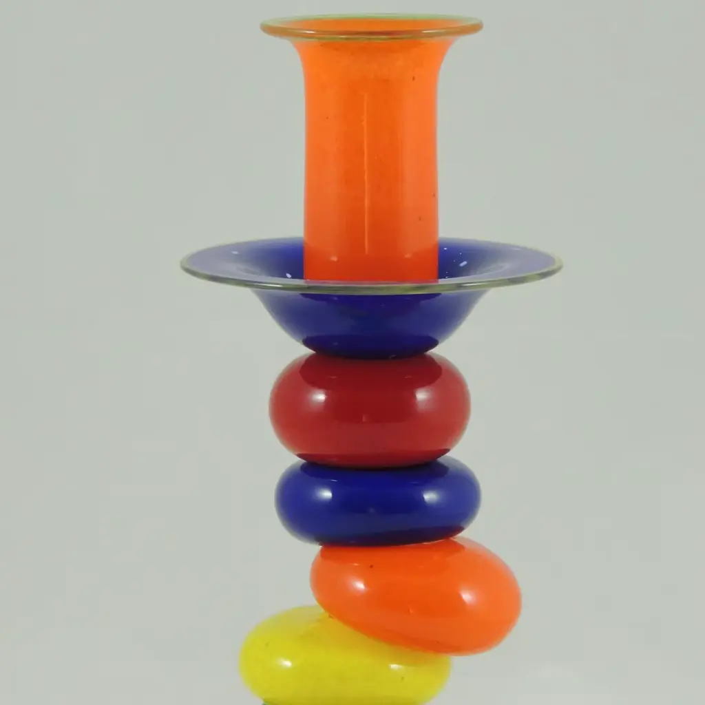This striking multi-colored candle holder in Murano glass is part of the "Bilico" collection, which was introduced at the first International Exhibition Aperto Vetro in 1998 and designed by Luciano Gambaro. Maestro Matteo Tagliapietra makes each object using matte-colored glasses. The base and top are mouth-blown.