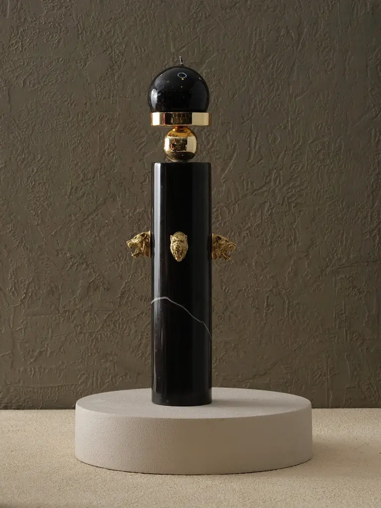 Channeling strength and sophistication, the Black Marble Tiger Head Candle Holder is a bold centerpiece for discerning interiors. Crafted from sleek black marble, the cylindrical base features intricate brass tiger head accents on each side—evoking a sense of regal guardianship. A golden sphere and plate cradle your candle, creating a dramatic vertical silhouette. Perfect for statement styling on mantels, consoles, or formal dining settings.