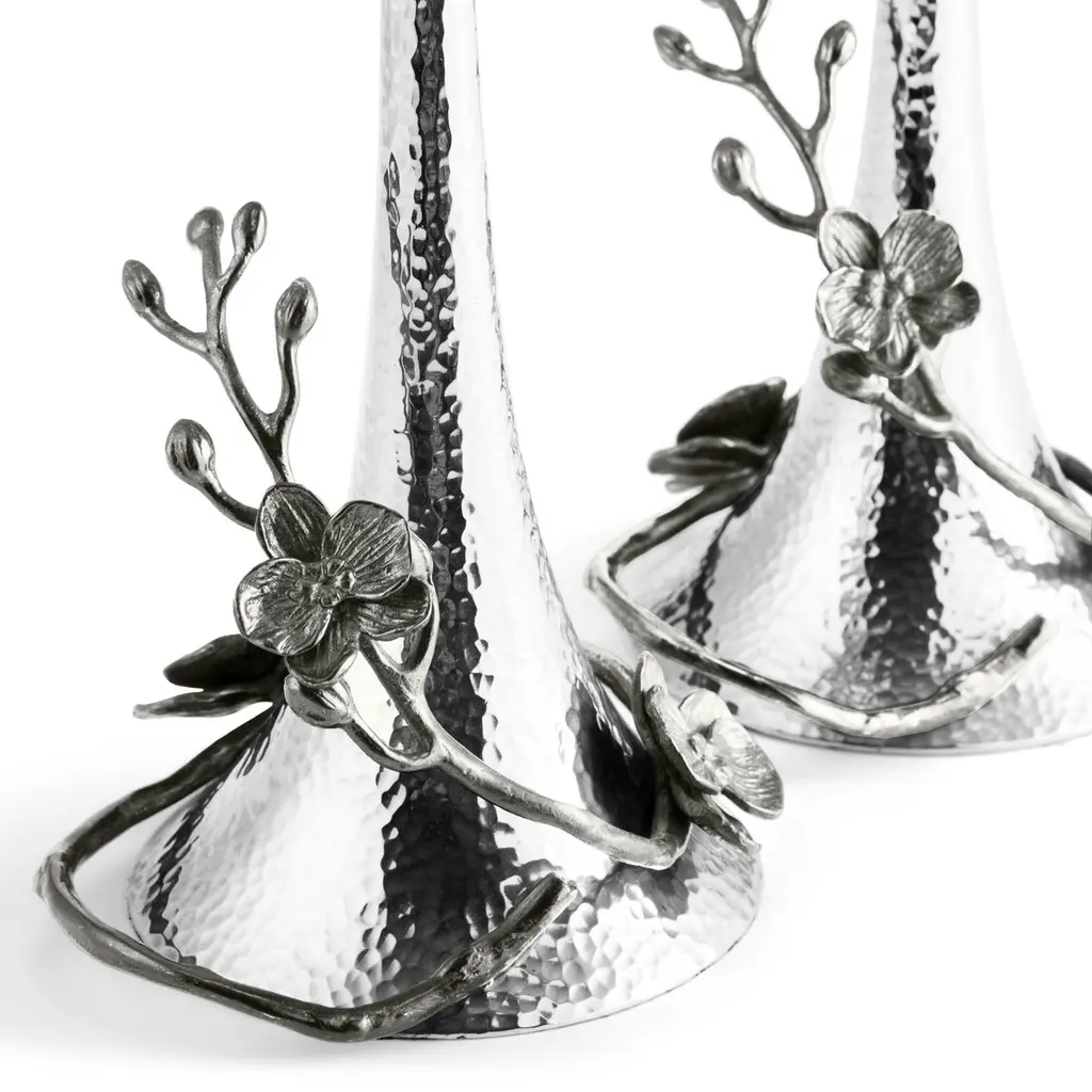 Pair of black orchid candlesticks, made from high-quality silver-plated metal with a patina finish.Enhance the elegance of your home with these Black Orchid candleholders, crafted from silver-plated metal with a patina, featuring a floral motif reminiscent of the orchid flower. Symbolising purity and grace, this collection captures the delicate nature of orchids while expressing a quality of mystery and sensuality. Perfect for adding an artistic touch to your décor.Candle holder: 14.0 cm L x 13.3 cm W x 27.9 cm HSet of 2Holds one 1.91 cm diameter candle (sold separately)