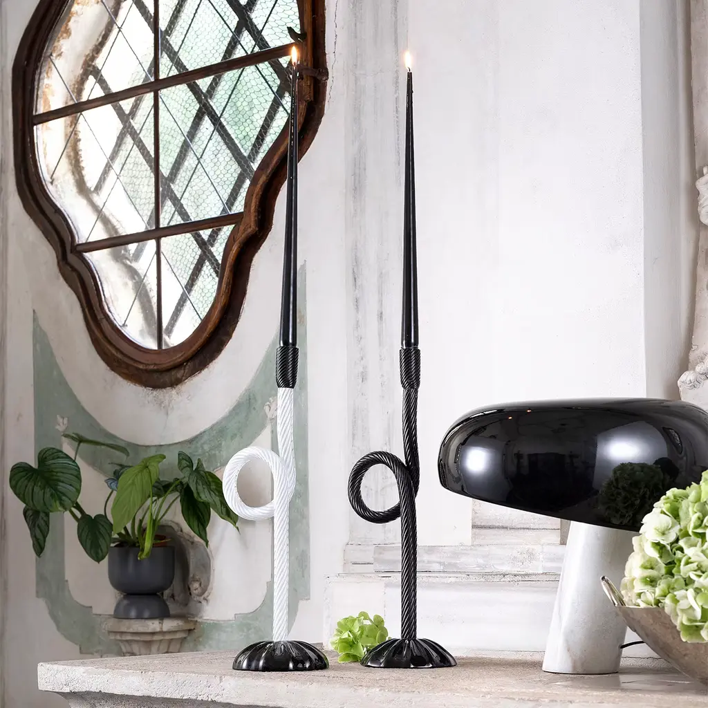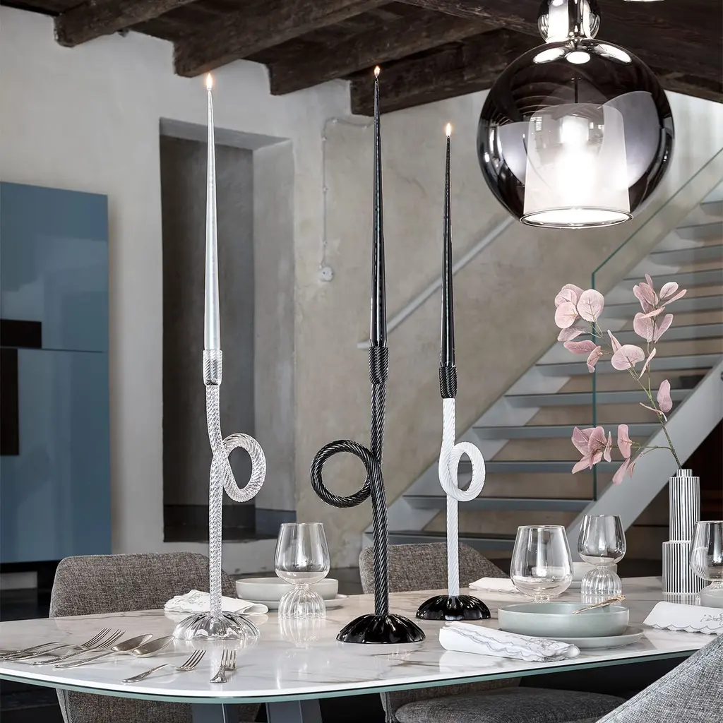This candlestick holder is a tribute to Venice. The Knots and ropes are part of Venetian everyday life. This original and contemporary collection of candlestick holders is a physical demonstration of how complex Murano glass blowing and modeling production breath is here. Eclectic and unique design to beautify the scenography of living ambiance, highlighting the historical feature of the Venetian lagoon. The candle is not included.