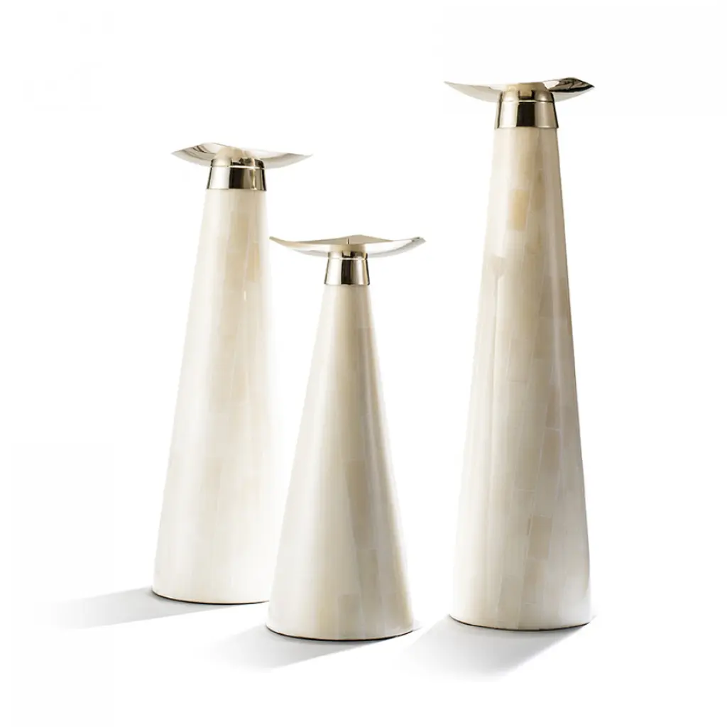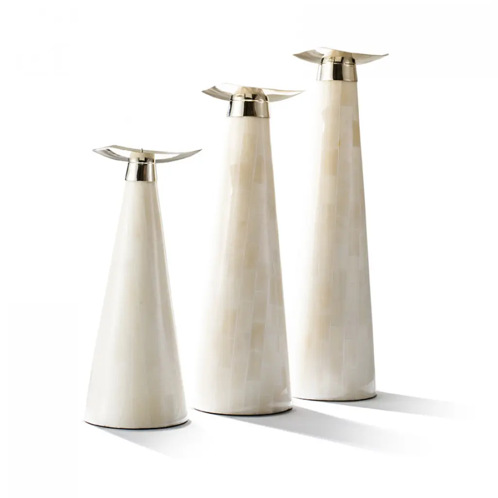 - Handcrafted set of 3 candleholders made of cow bone & wood from Colombia. - Bone tiles are intricately inlaid and complimented with a high-gloss lacquer finish. - Set of 3 with variable heights: 14" / 12" / 10"