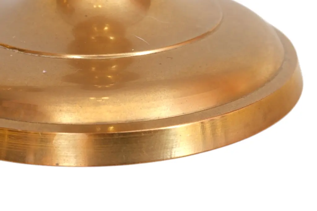 A pair of traditional style gold brass candlestick holders circa 1950. Sleek capitals, turned columns, and round bases are decorated with simple beveled lines. Dimensions per candlestick holder.