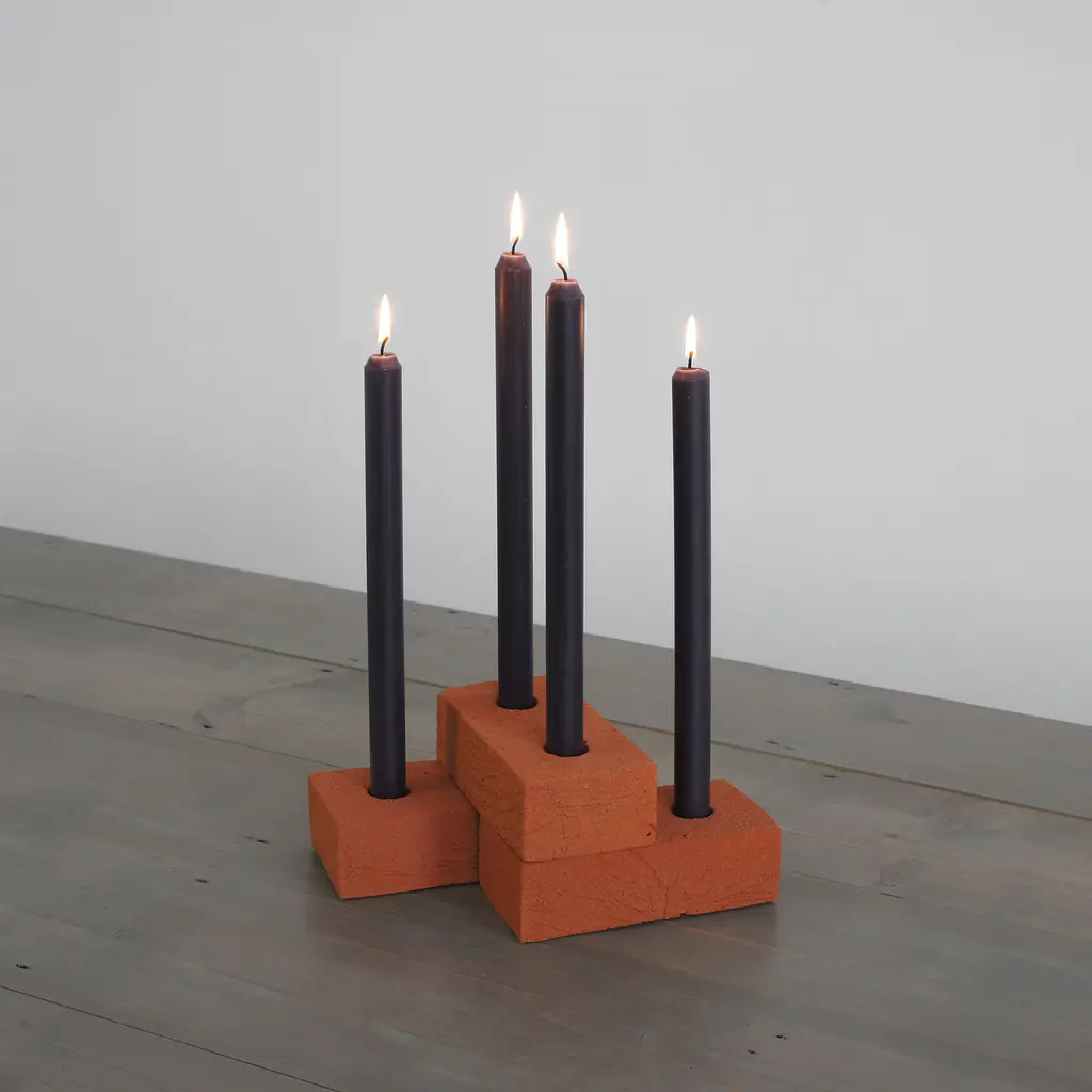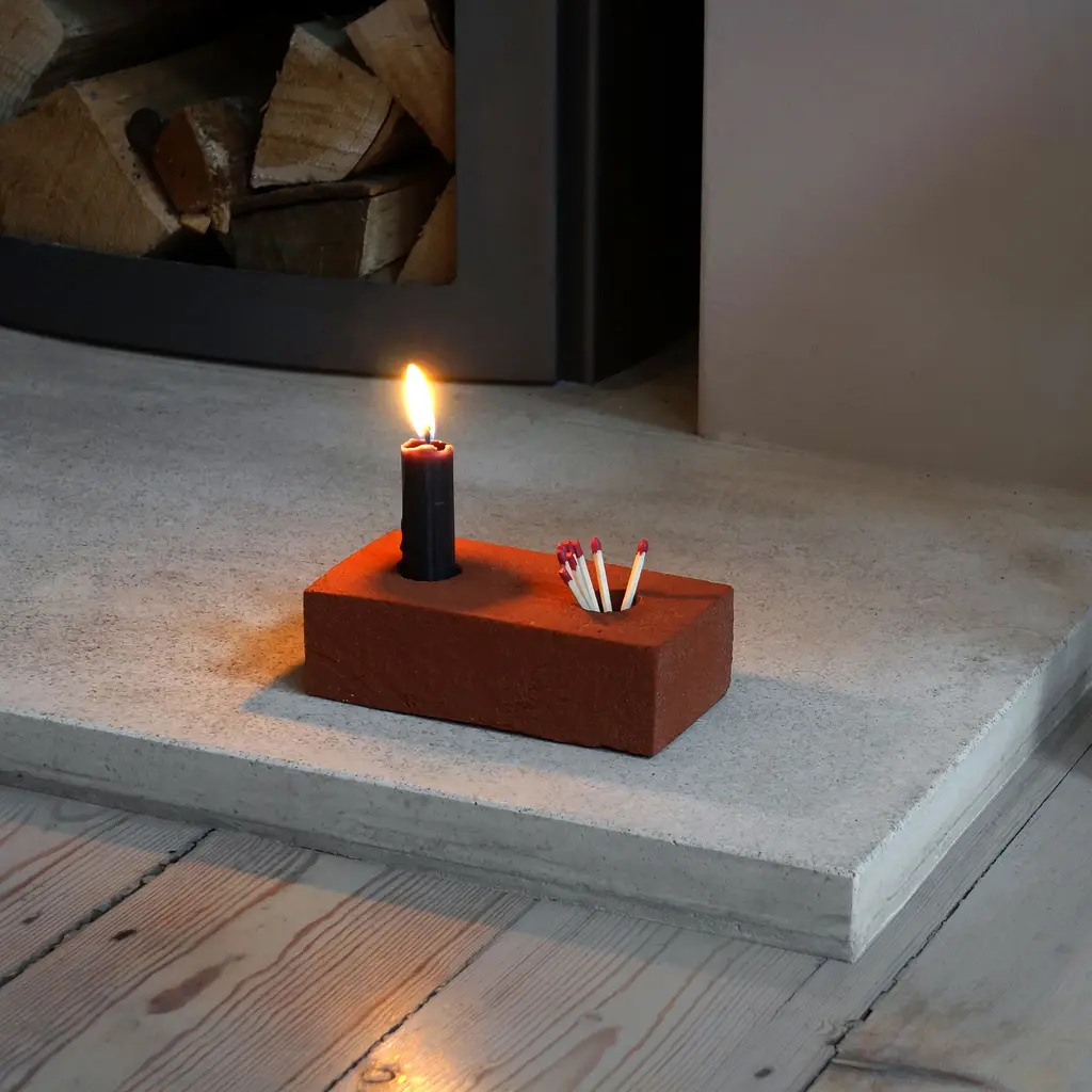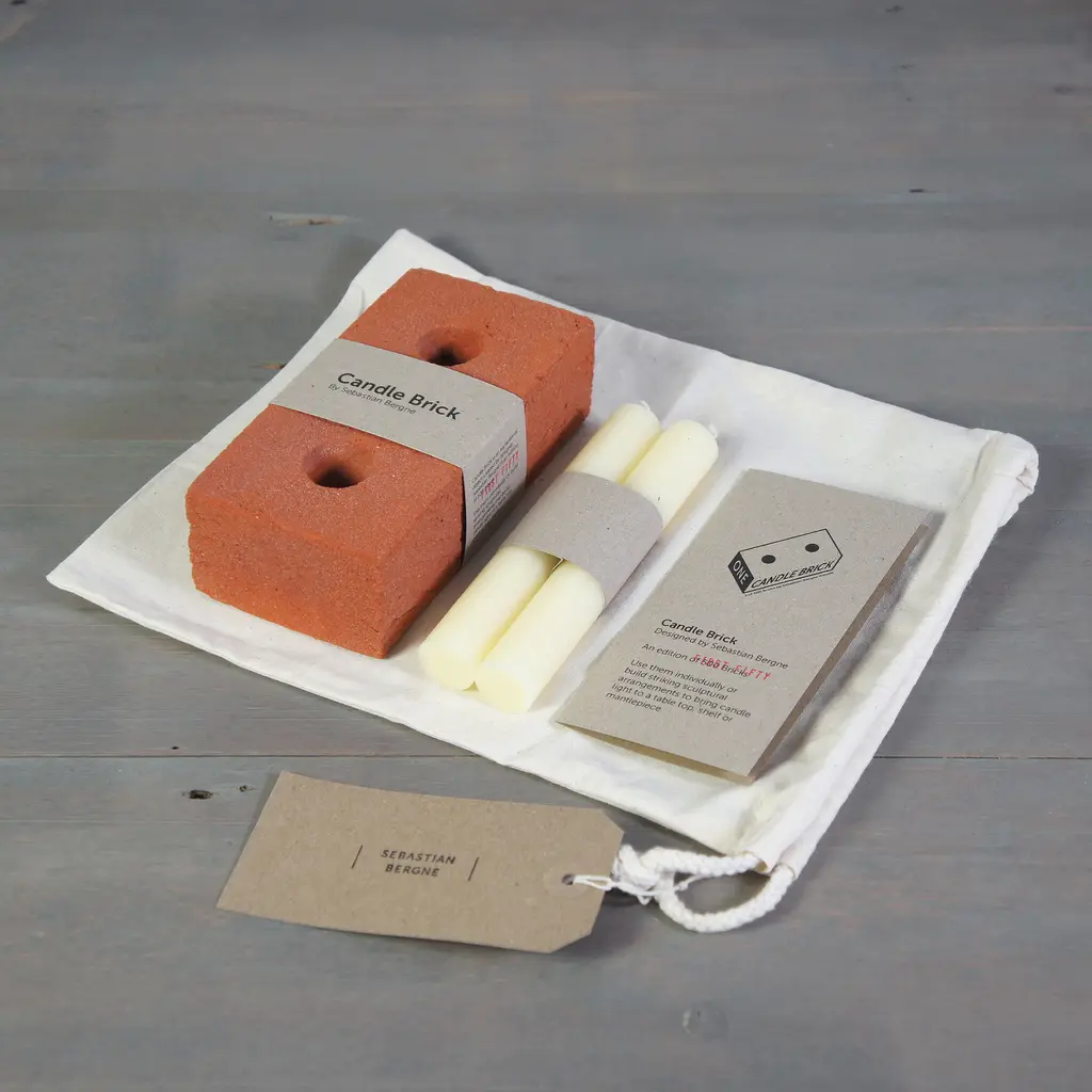 Build your own light sculpture with this brick candle holder that becomes the center of attention anywhere you place it. Created by Sebastian Bergne, Candle Brick reimagines the quintessential building material as a home accessory. Each candle holder is carefully handcrafted and features a distinctive rough texture and a warm color. Two openings provide room for candles or for one candle and matches. This product can be used on its own or in a sculptural composition with stacked bricks in different positions holding candles of different heights, for example. Either way, this brick candle holder is an eye-catcher anywhere, whether you want to use it to brighten a dining table, shelf, windowsill, or bar area. Candle Brick is part of a limited series. Made in London, UK, it comes unglazed with a sealed surface.