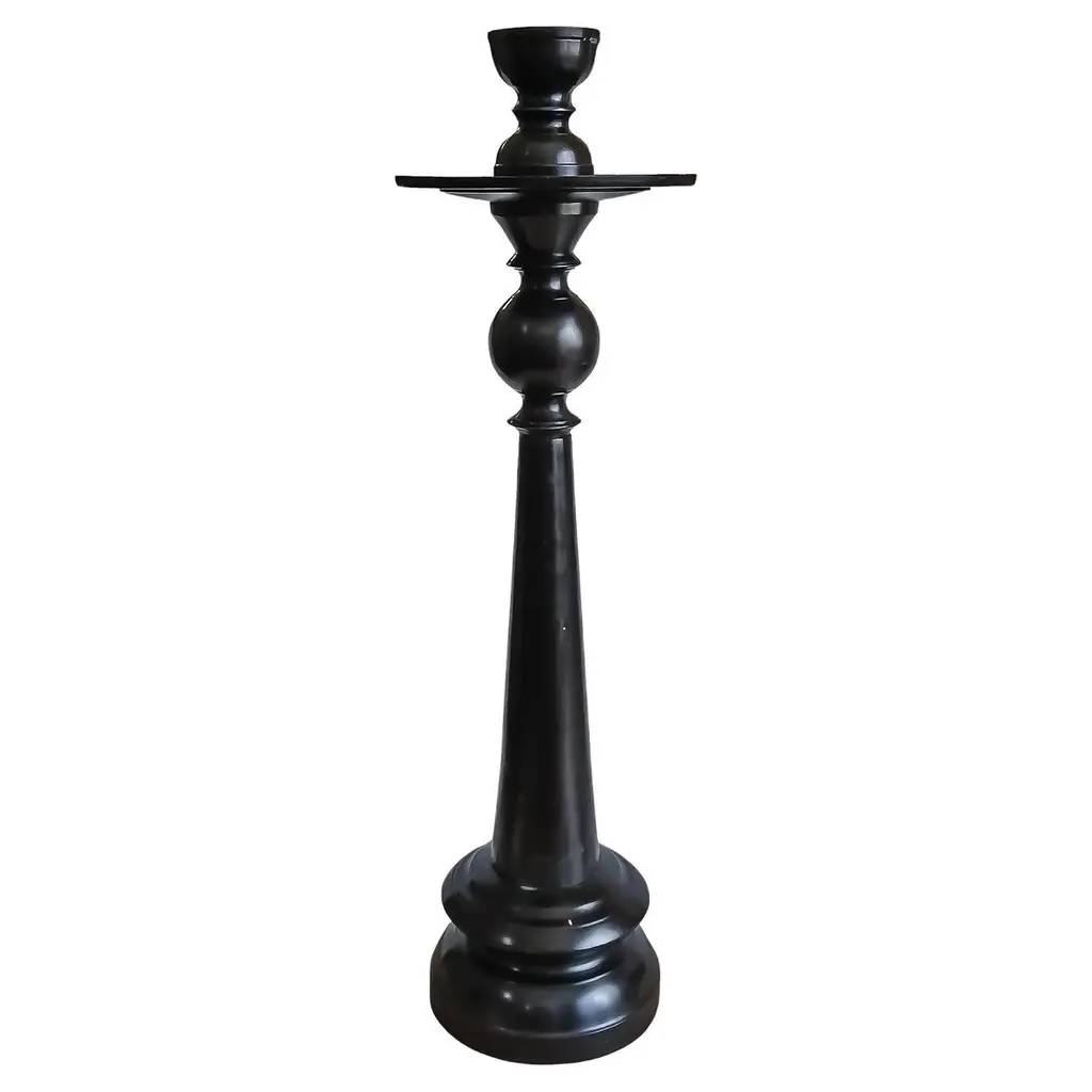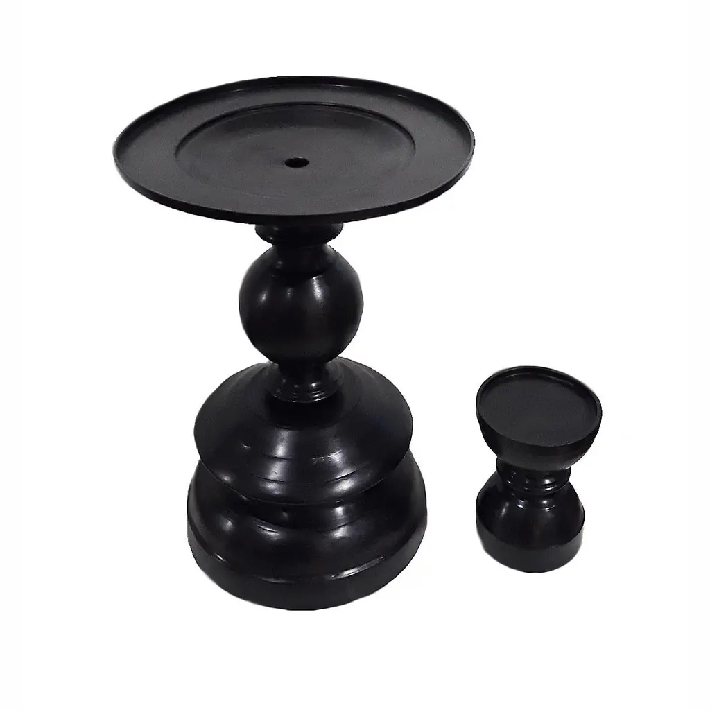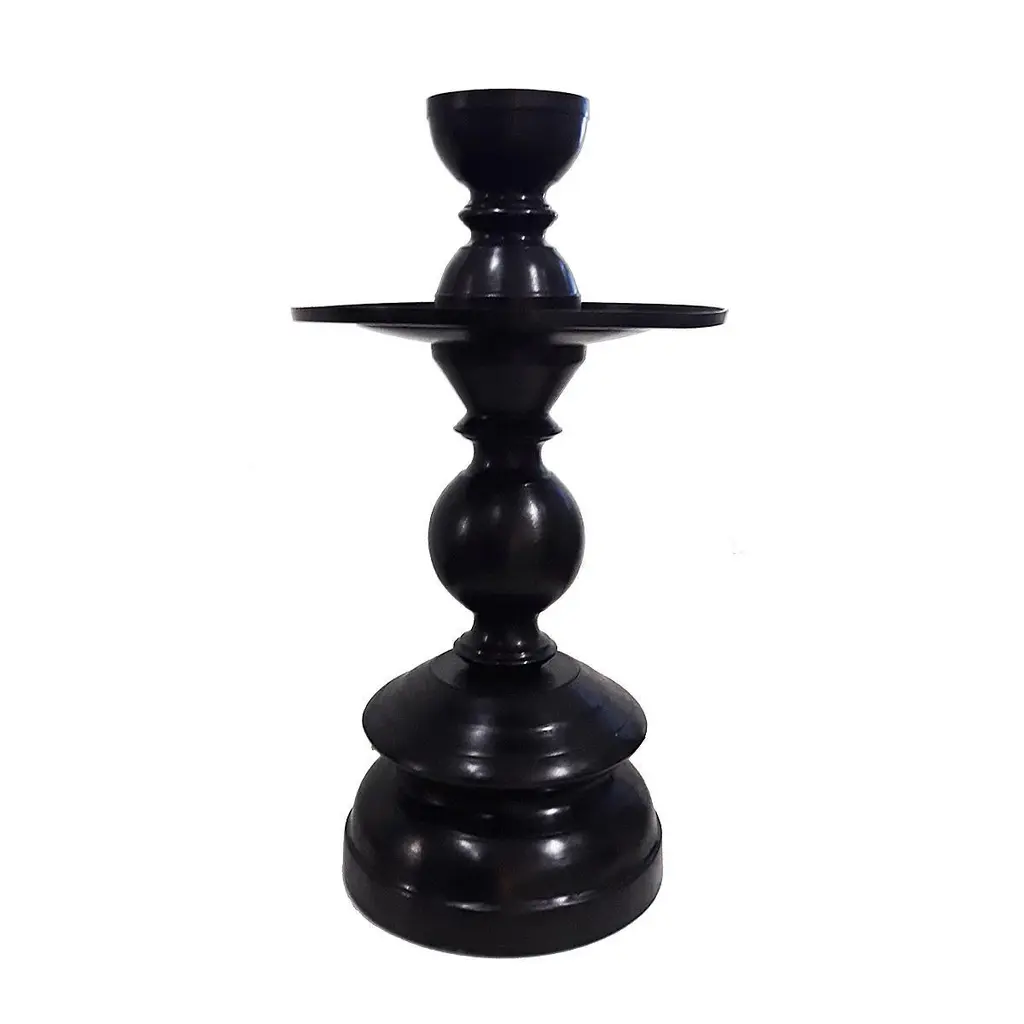 A medium-sized candlestick in forged bronze, black finish. Contemporary. The 9.5-inch diameter top plate is designed to hold large size candles, and includes a removable top that holds smaller size candles. 17.5 inches tall, with a 9-inch base. A dramatic accent for any ambient in home decor.