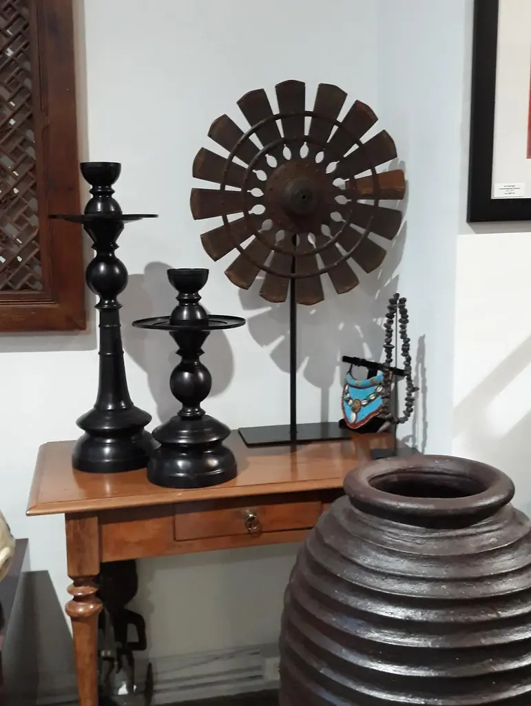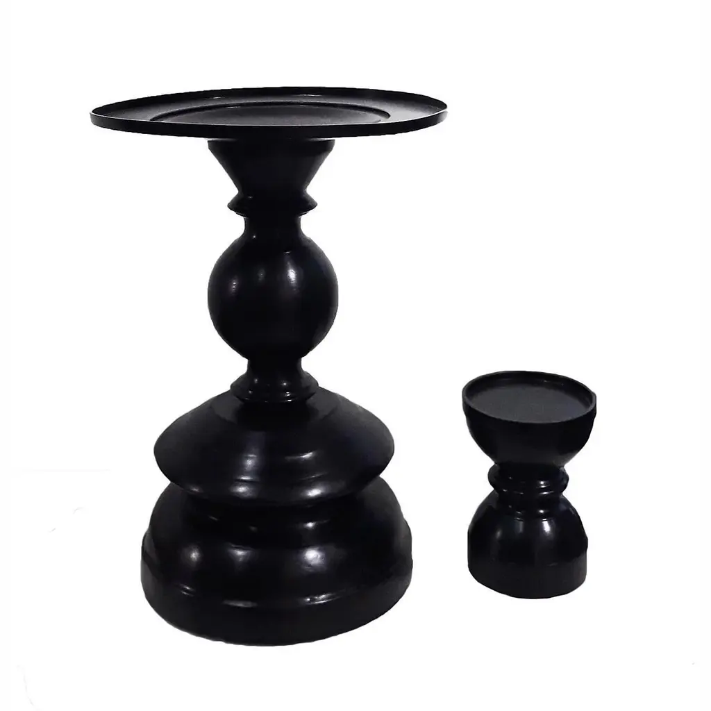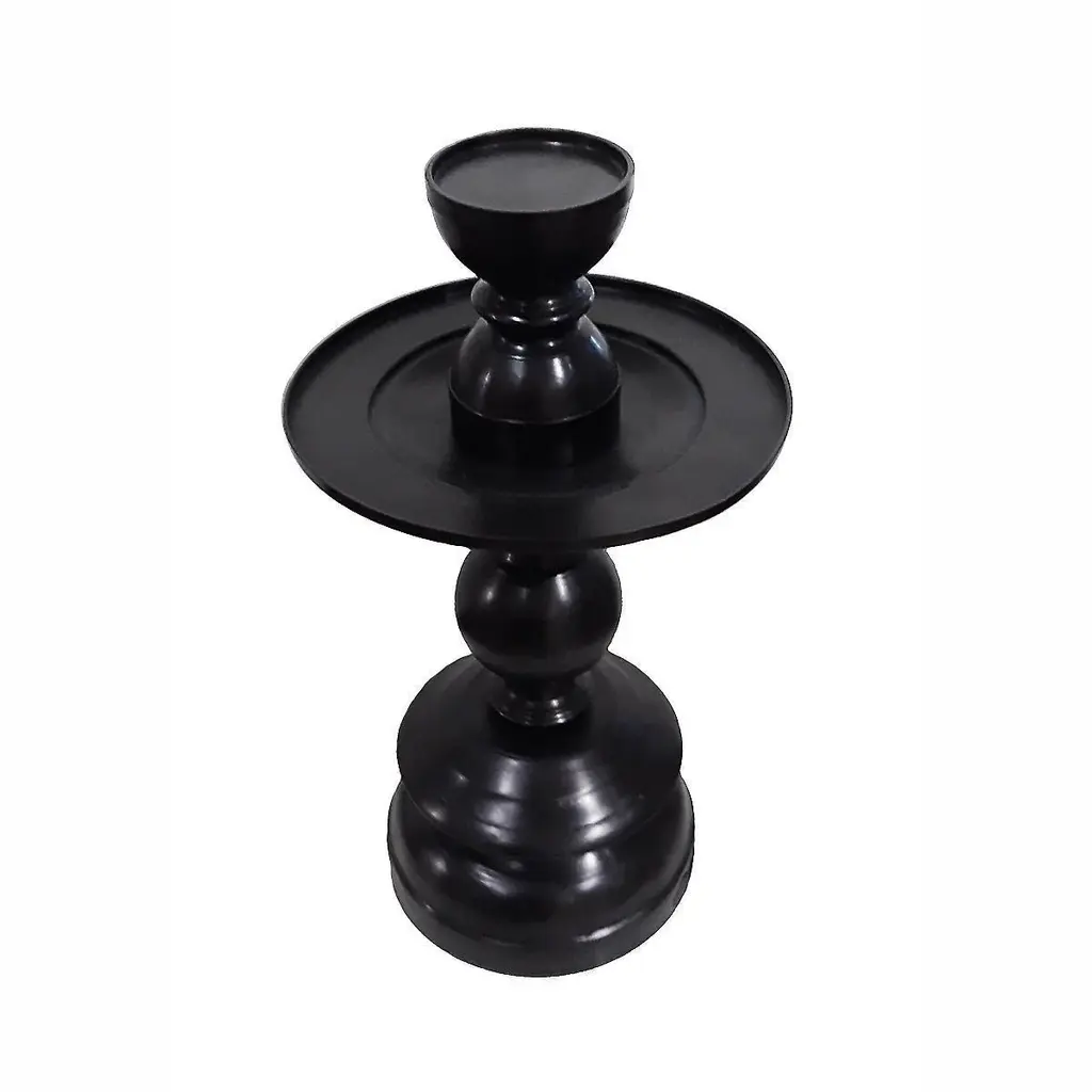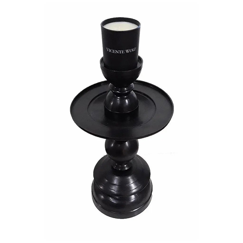 A medium-sized candlestick in forged bronze, black finish. Contemporary. The 9.5-inch diameter top plate is designed to hold large size candles, and includes a removable top that holds smaller size candles. 17.5 inches tall, with a 9-inch base. A dramatic accent for any ambient in home decor.