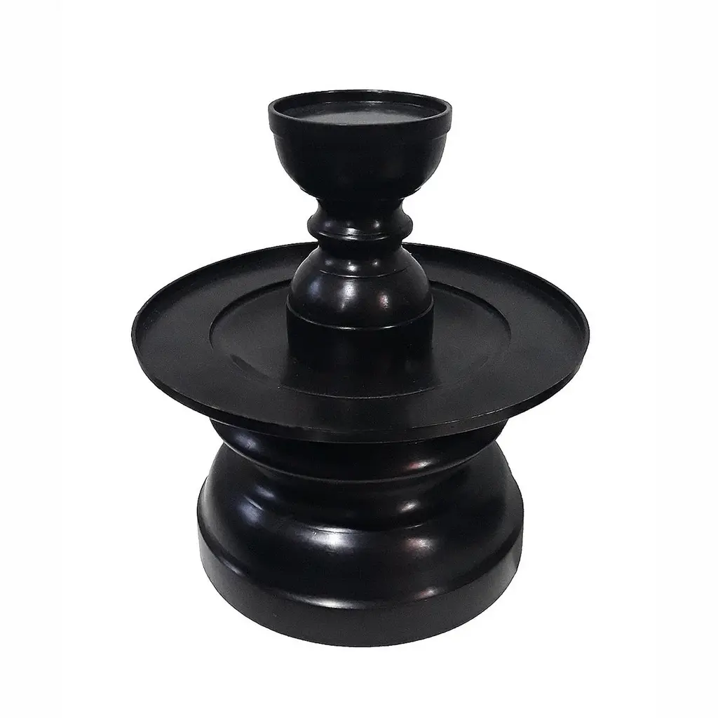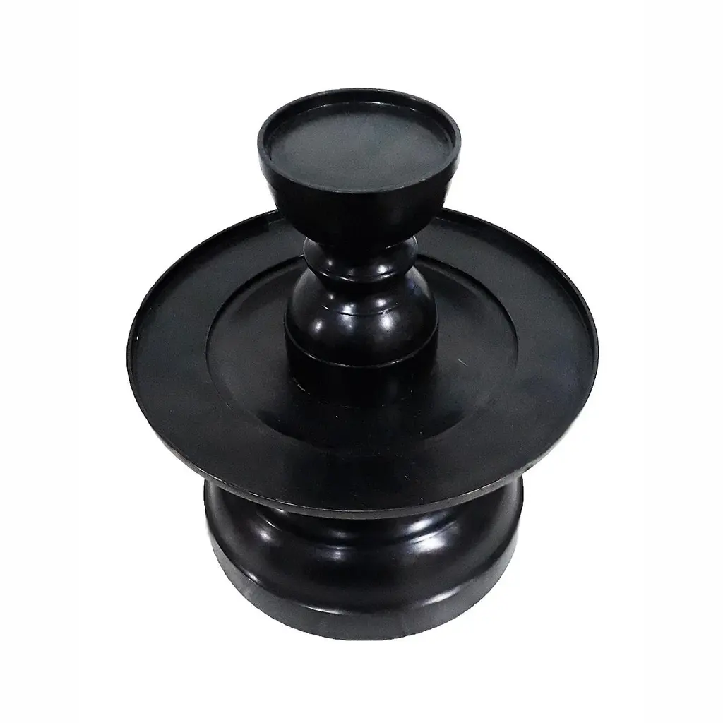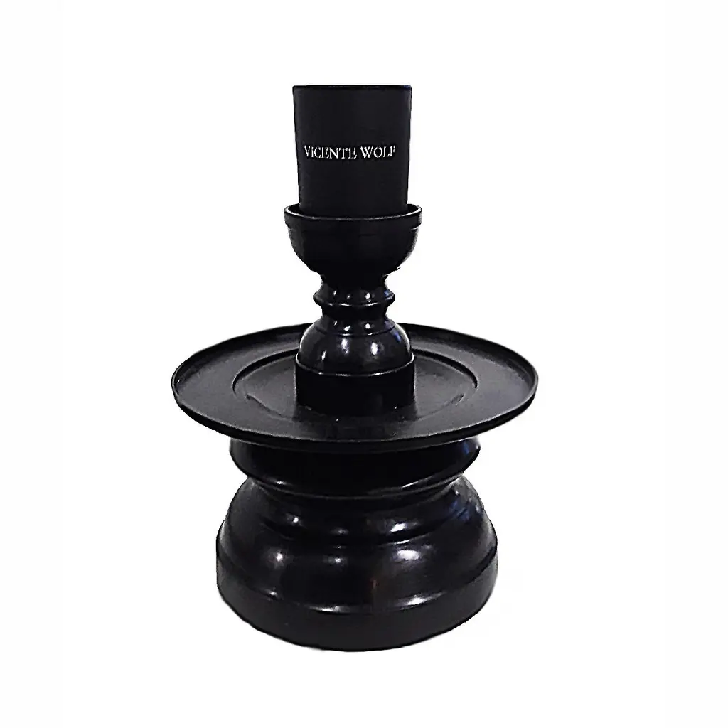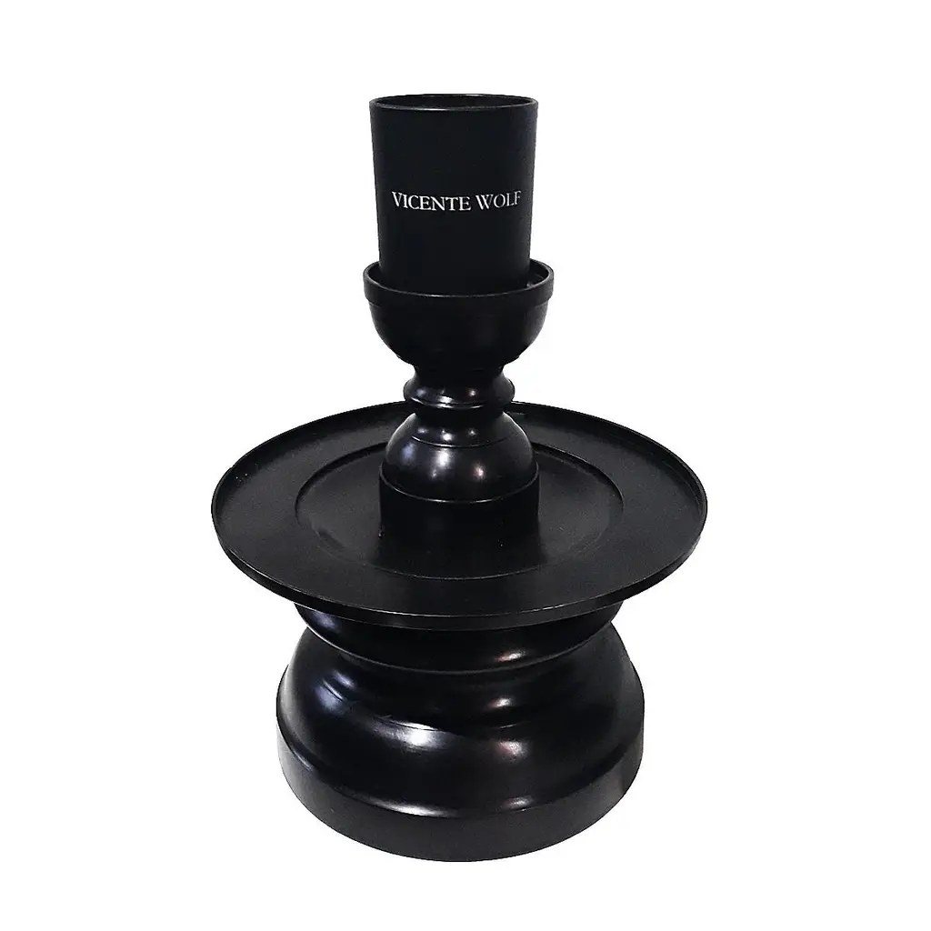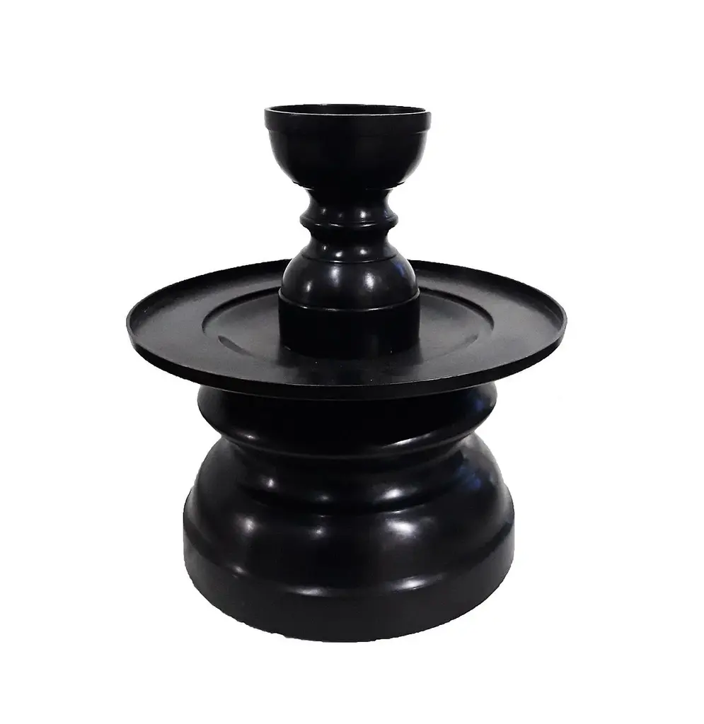 A short candlestick in forged bronze, black finish. Contemporary. The 9.5-inch diameter top plate is designed to hold large size candles, and includes a removable top that holds smaller size candles. 17.5 inches tall, with a 9-inch base. A dramatic accent for any ambient in home decor.