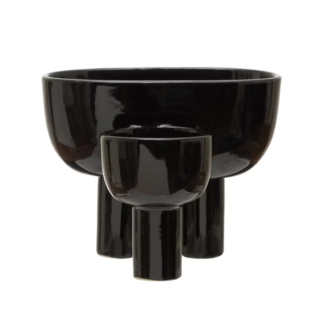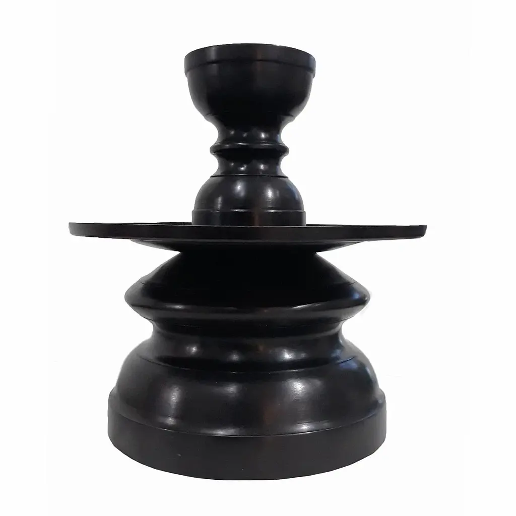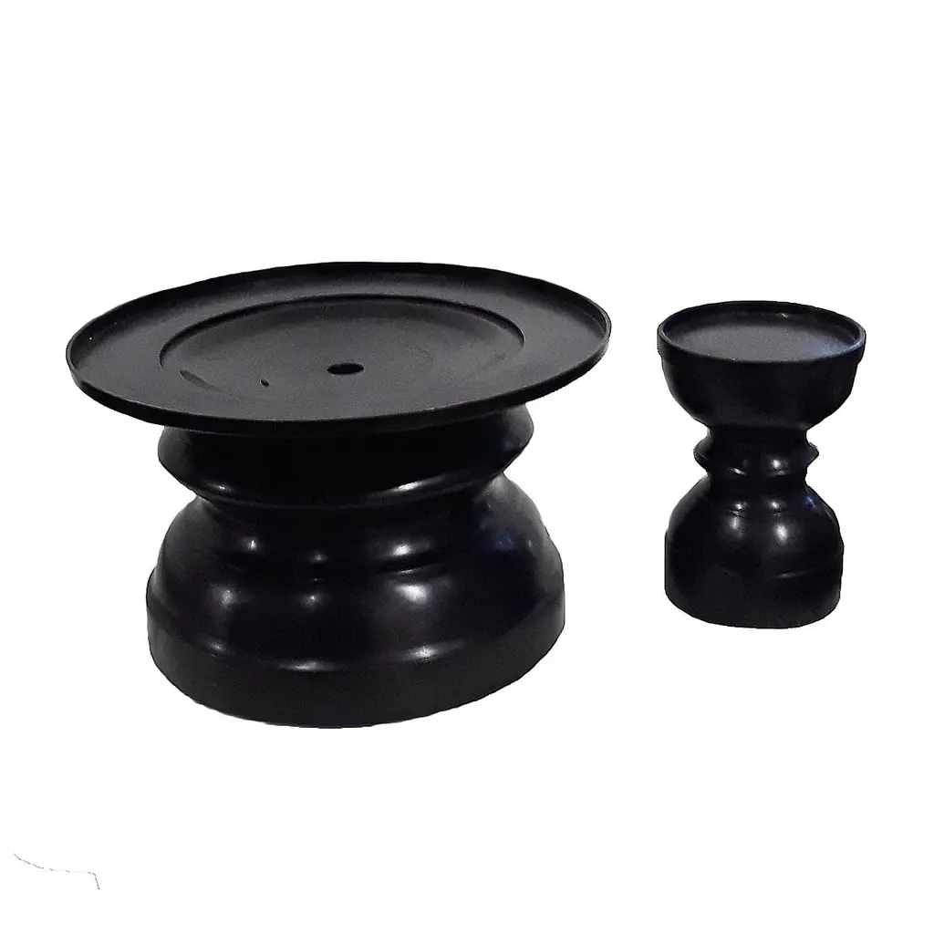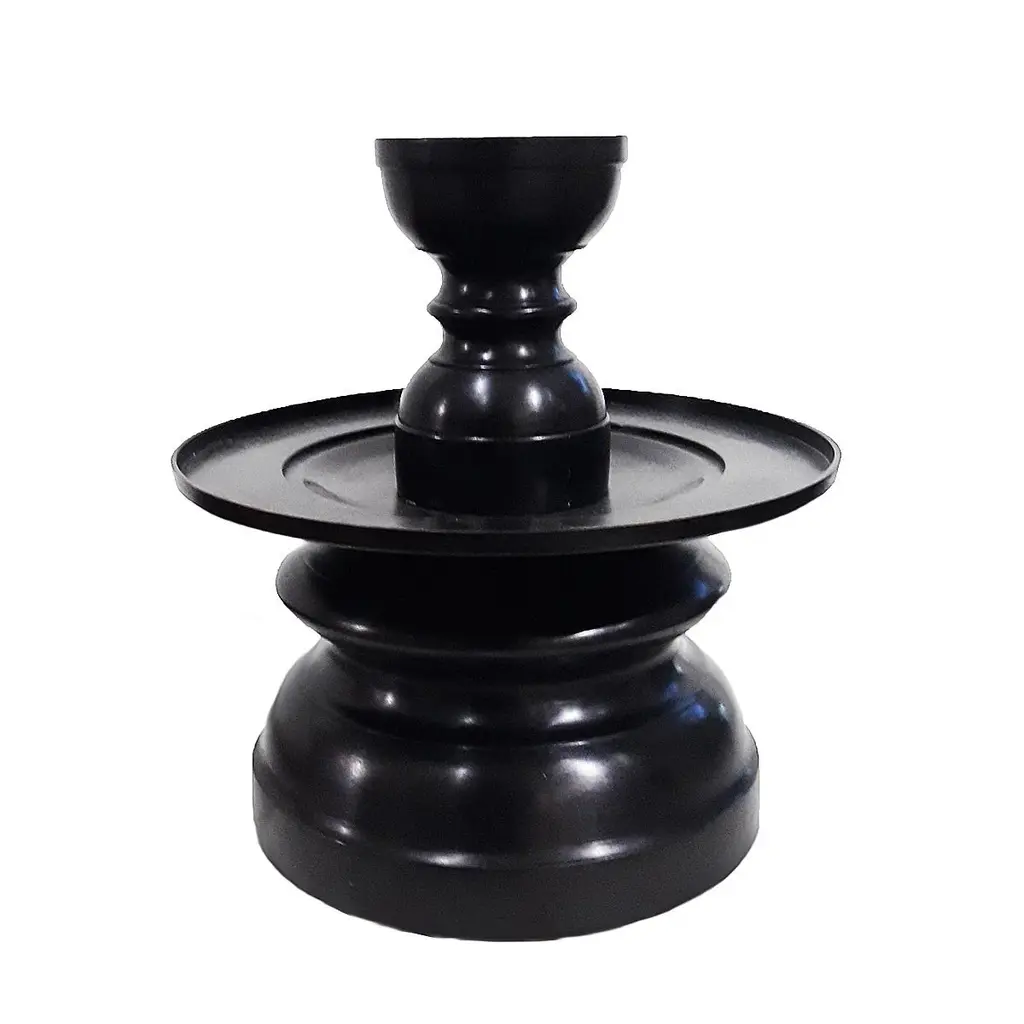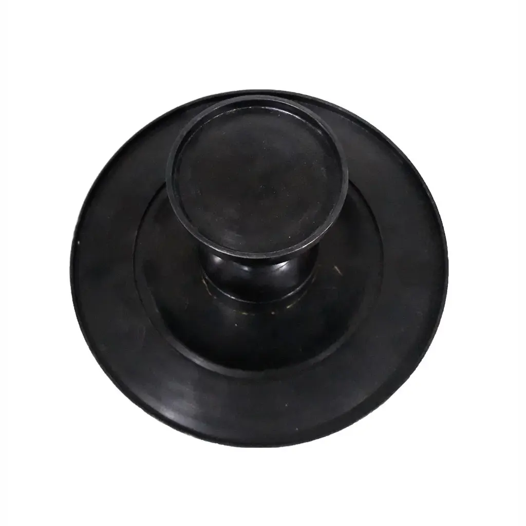 A short candlestick in forged bronze, black finish. Contemporary. The 9.5-inch diameter top plate is designed to hold large size candles, and includes a removable top that holds smaller size candles. 17.5 inches tall, with a 9-inch base. A dramatic accent for any ambient in home decor.