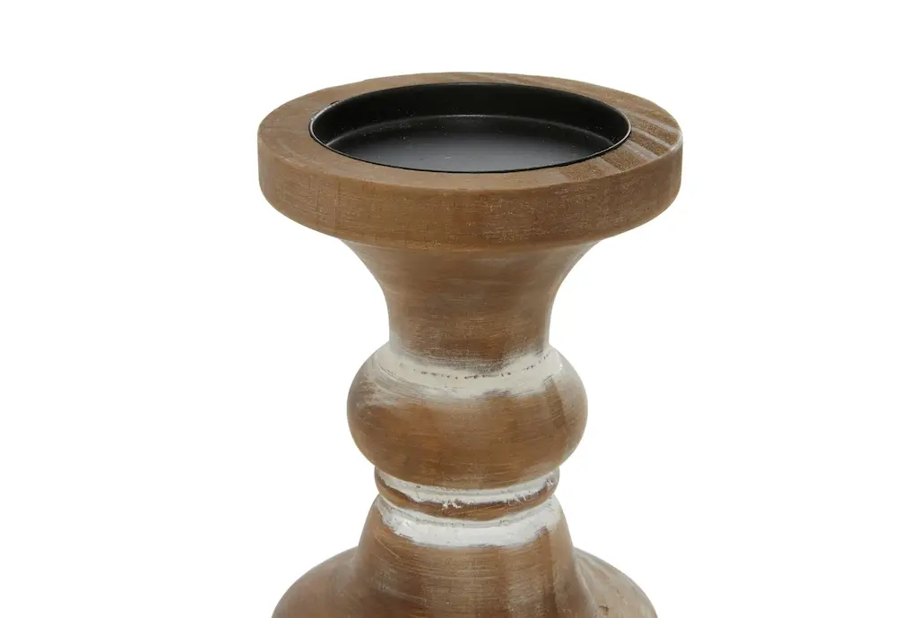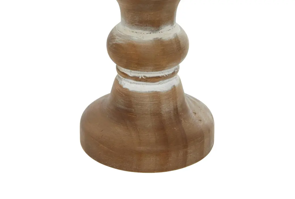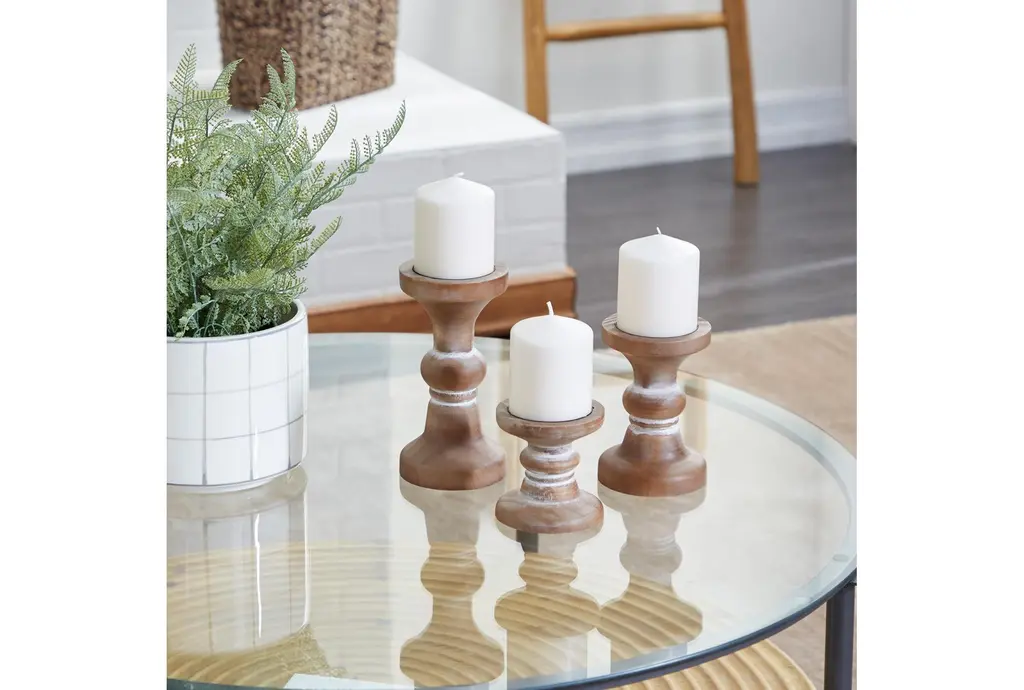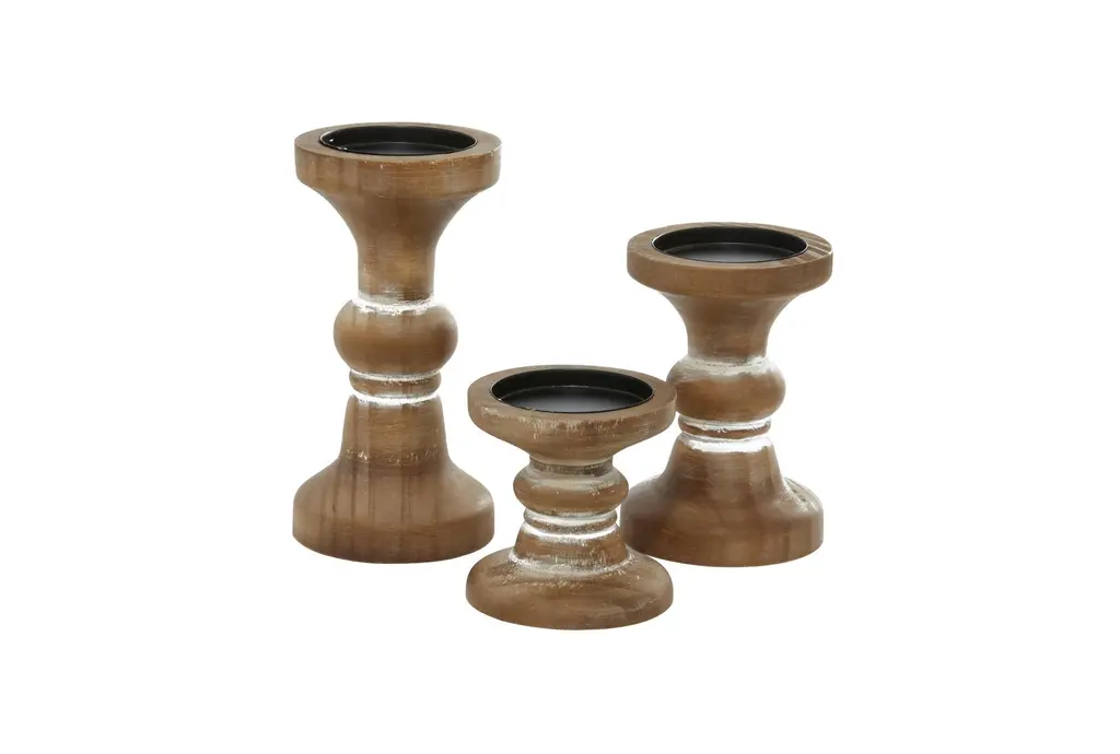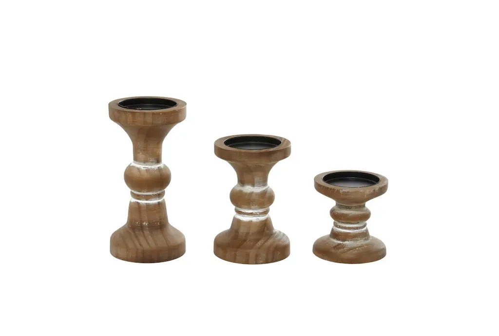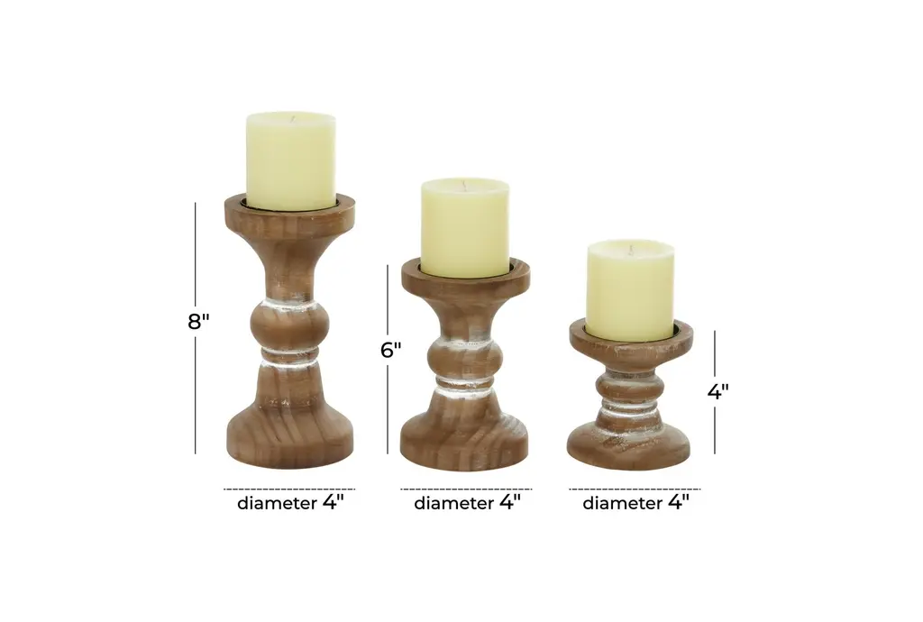 Give your space a radiant illumination with these beautifully crafted candle holders. Made with a sturdy base, it is perfect for creating an elegant atmosphere at your table top or mantel. Display these as a standalone or as a set of accent or centerpiece home decor suitable for any table or mantle. Designed with felt or rubber stoppers at the base that prevent scratching furniture and table tops, as well as sliding around. Can hold 3 pillar candles, not included. This item ships in 1 carton. Wood candle holder makes a great gift for any occasion. Suitable for indoor use only. This item ships fully assembled in one piece. This brown colored candle stand comes as a set of 3. Farmhouse style.