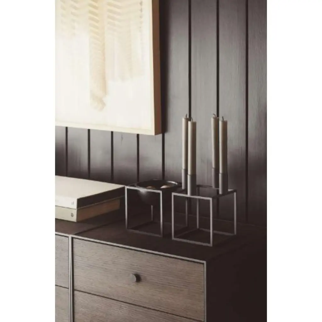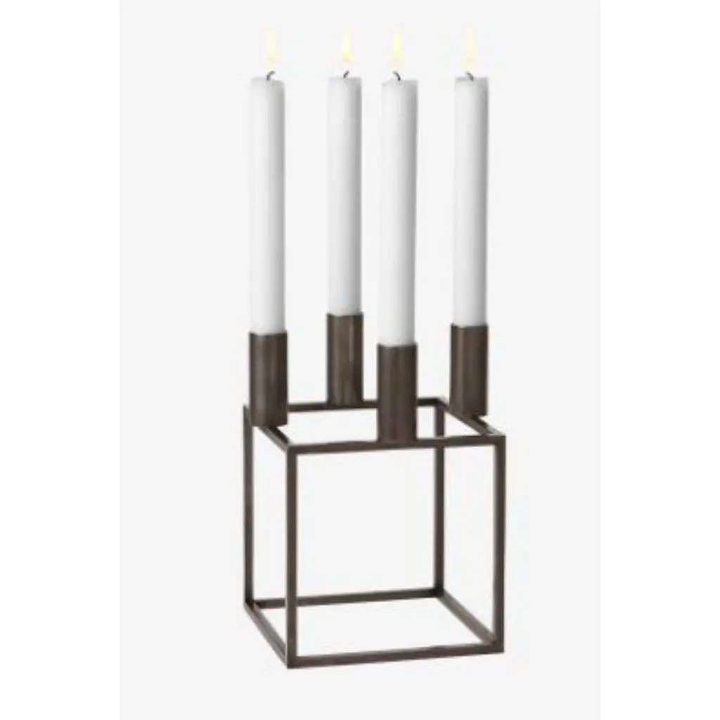 Burnished Copper Kubus 4 candle holder by LassenDimensions: D 14 x W 14 x H 20 cm Materials: Metal Also available in different dimensions. Weight: 1.50 KgA new small wonder has seen the light of day. Kubus Micro is a stylish, smaller version of the iconic Kubus candleholder and is also designed by Mogens Lassen. It is based on the exact same mathematical geometry as The very first Kubus Candleholder Mogens Lassen designed in 1962. Just very much smaller. Precisely half the size of Kubus 1.The black Kubus-shape frames the light beautifully and adds a mi¬nimalist expression to the table setting. Kubus Micro fits a single candle and is perfect for all kinds of festivities, where the table must be beautifully laid, and you want a very special atmosphere. The candleholder works alone in a beautiful still life or arrange several together for a greater effect.By Lassen is a Danish design brand focused on iconic designs created by Mogens and Flemming Lassen, founded by Lassens’ relatives in 2008. Brothers Mogens (1901-1987) and Flemming (1902-1984) Lassen are known as two of Denmark’s greatest architects and designers. Both were renowned pioneers of Danish functionalism and modernist architecture, honoured with numerous prestigious medals and awards. Headed by Mogens Lassen’s grandson Søren Lassen, by Lassen carries on the brothers’ design philosophy by manufacturing their iconic designs as well as products by other designers that complement the Lassen’s functionalist style. The company’s Mission is to continue the tradition of timelessness, functionality and quality, and to introduce the Lassen’s design heritage to new generations.