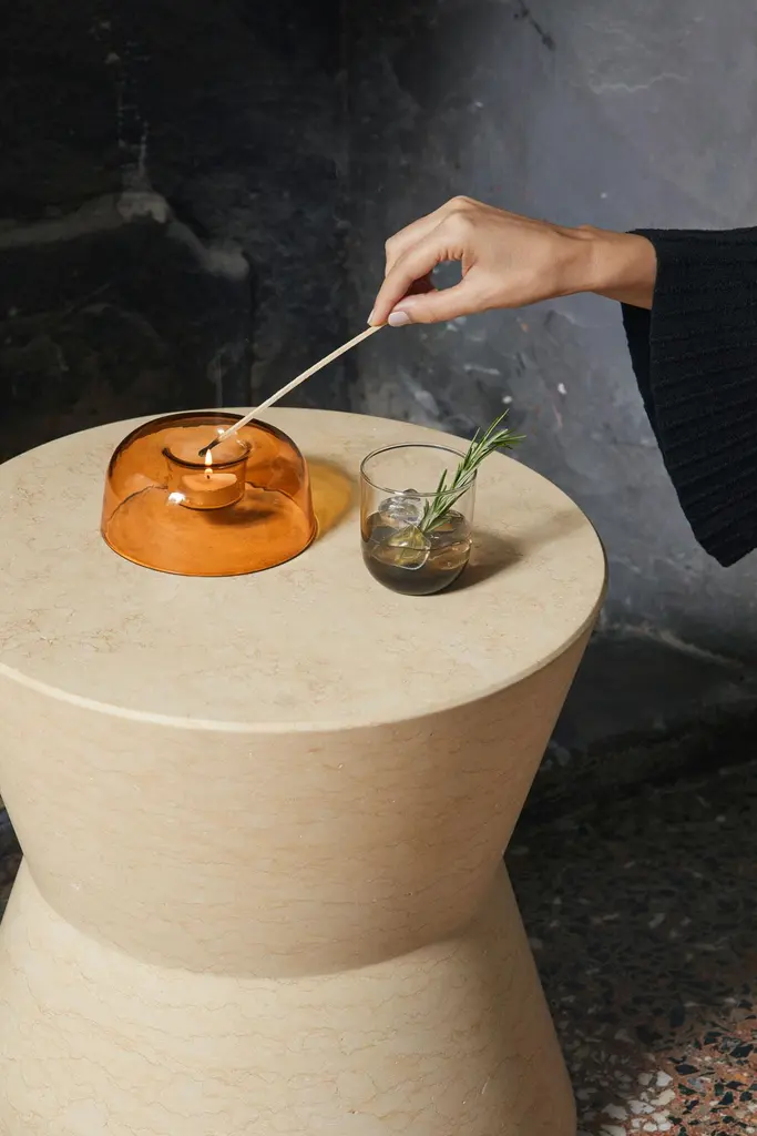 The candlelight rests gently in the center of The Light lamp holder and remains almost as if trapped inside. The blown glass of which the object is made seems to be the hollow of a hand, gently holding the light, letting it float, suspended in a few inches of emptiness; the amber color of the object perfectly matches the flame making its light even warmer and more intense. The Light is manageable and lightweight, allowing the candle to remain stable and completely separate from the tabletop. In this way, the wax cannot stain and the flame cannot come in contact with any material underneath. This piece from Paola C.'s collection, with its geometric, minimalist yet soft form, was conceived by Neri & Hu (Lyndon Neri and Rossana Hu) in 2019 as part of The Society Collection, a family of products where each object has its own specific identity in dialogue with the form and materials of the other objects.