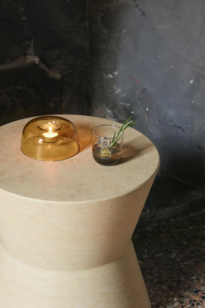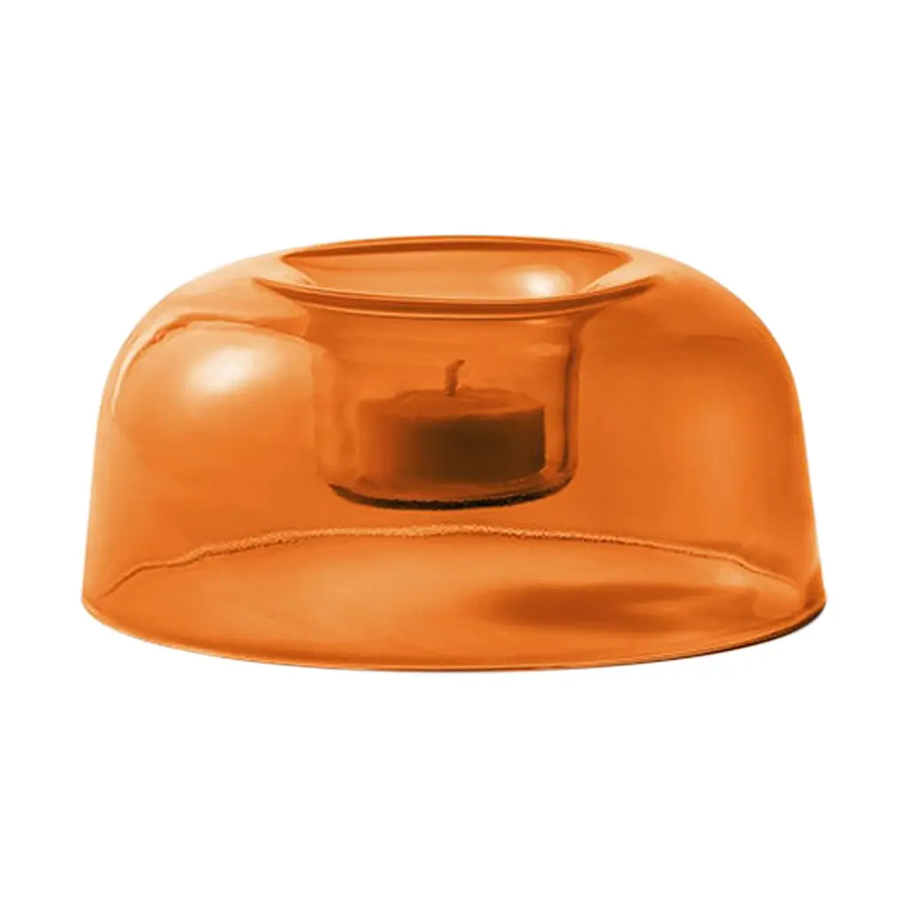 The candlelight rests gently in the center of The Light lamp holder and remains almost as if trapped inside. The blown glass of which the object is made seems to be the hollow of a hand, gently holding the light, letting it float, suspended in a few inches of emptiness; the amber color of the object perfectly matches the flame making its light even warmer and more intense. The Light is manageable and lightweight, allowing the candle to remain stable and completely separate from the tabletop. In this way, the wax cannot stain and the flame cannot come in contact with any material underneath. This piece from Paola C.'s collection, with its geometric, minimalist yet soft form, was conceived by Neri & Hu (Lyndon Neri and Rossana Hu) in 2019 as part of The Society Collection, a family of products where each object has its own specific identity in dialogue with the form and materials of the other objects.