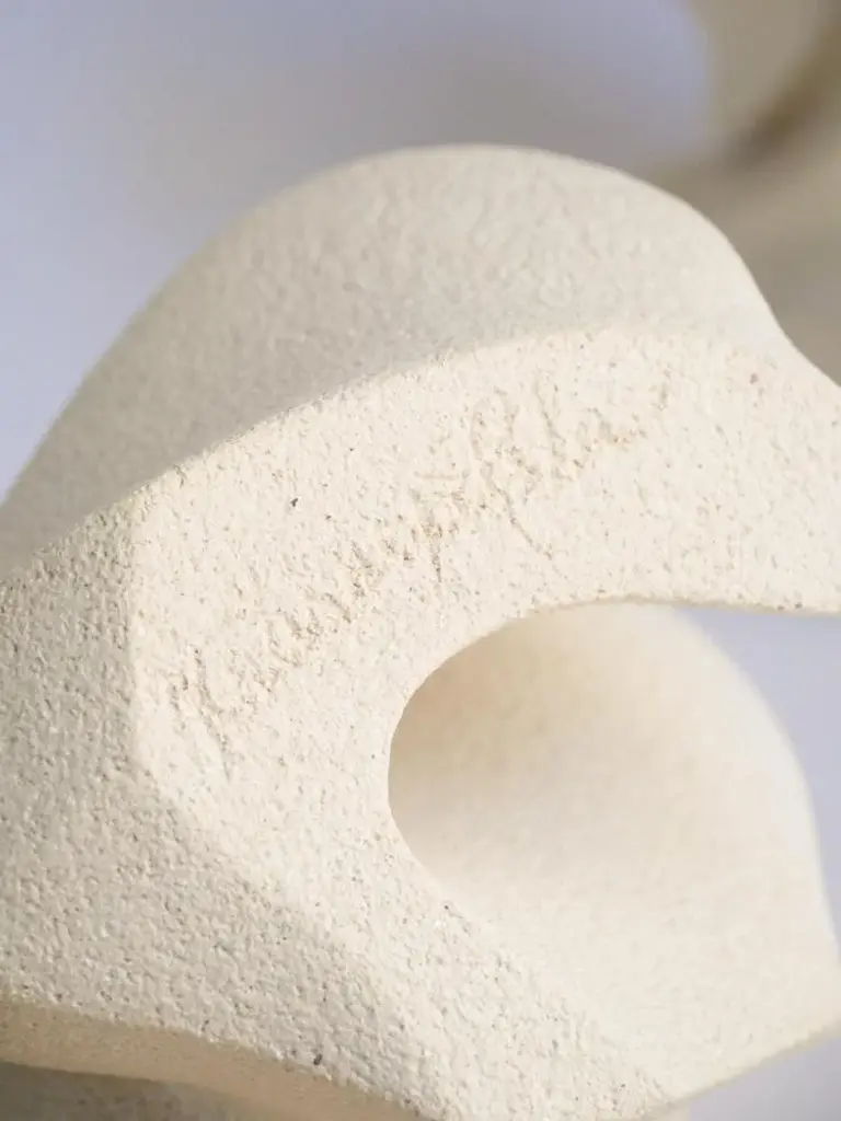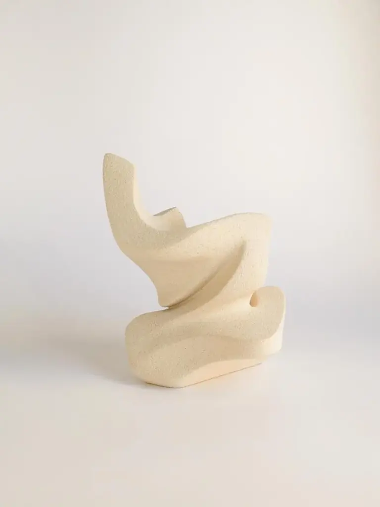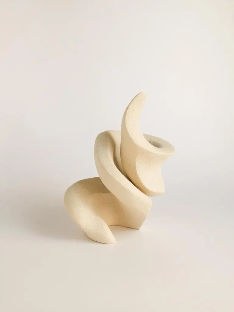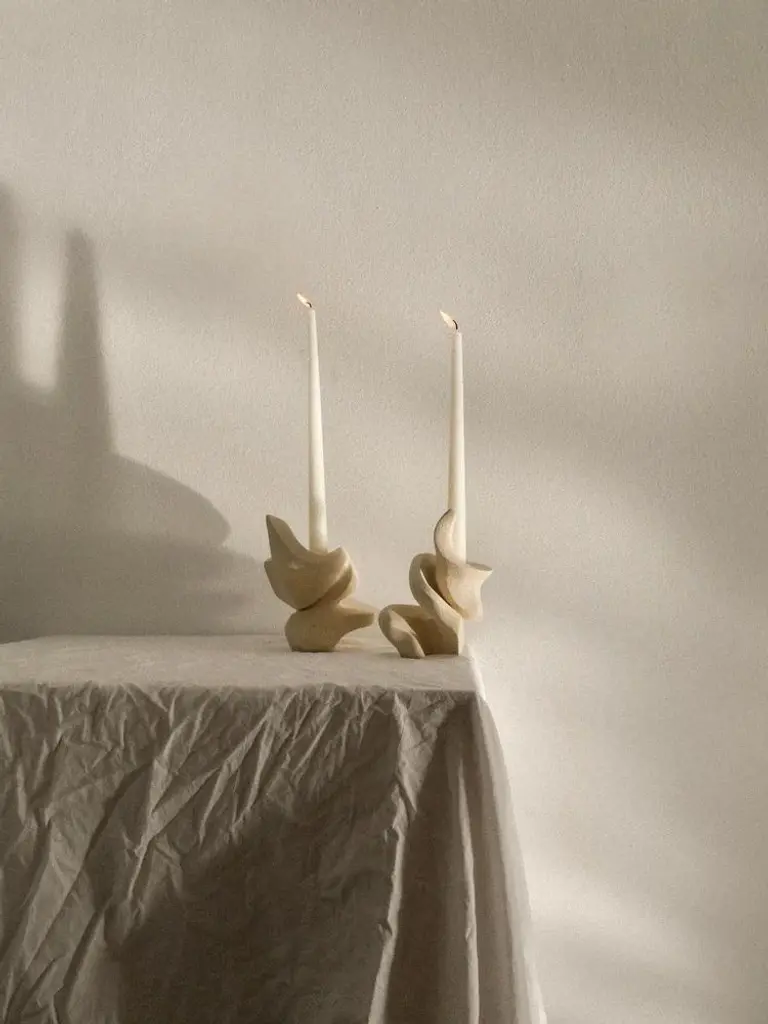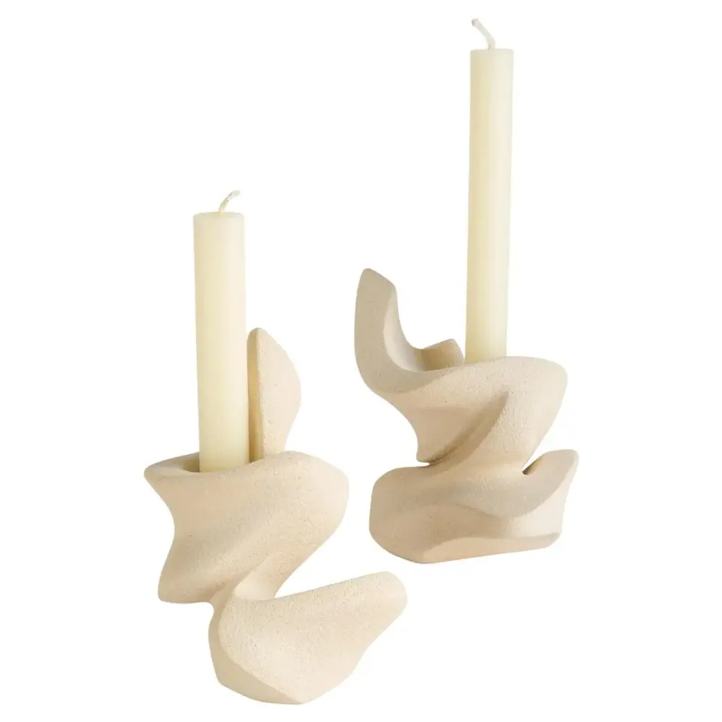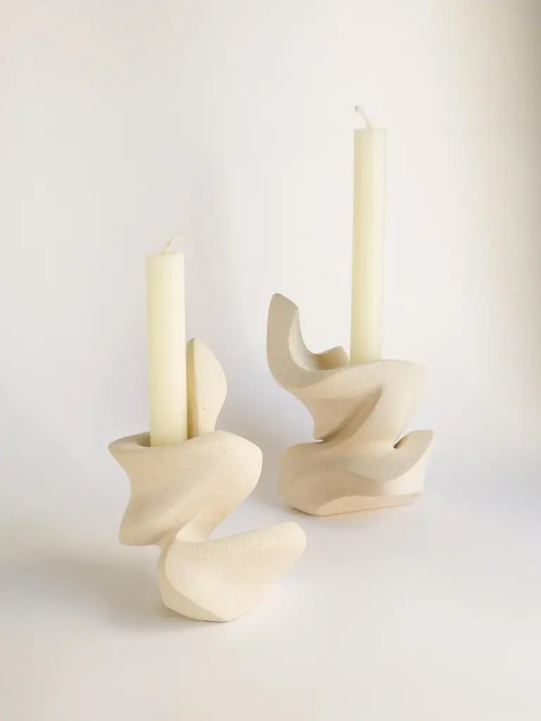 Stoneware clay set dance of light candleholder by aleksandra krasnopolska dimensions: w 12 x d 10 x h 15.5 cm, w 12 x d 12 x h 15 cm materials: stoneware clay. Light glazewash appliedwith an airbrush. Weight: 0,8 kg and 1 kg.