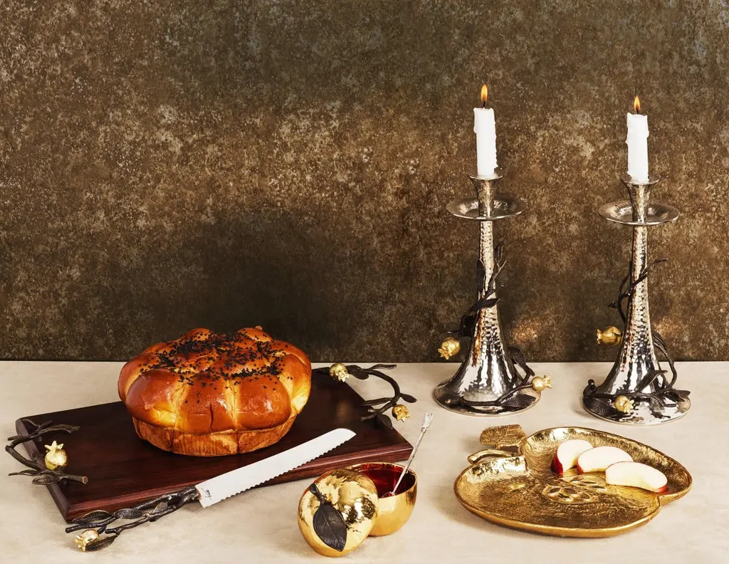 Candleholders With Pomegranate Decorations, Silver, Oxidised And Gilded Metal.