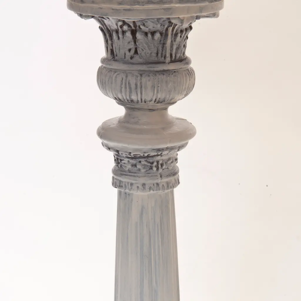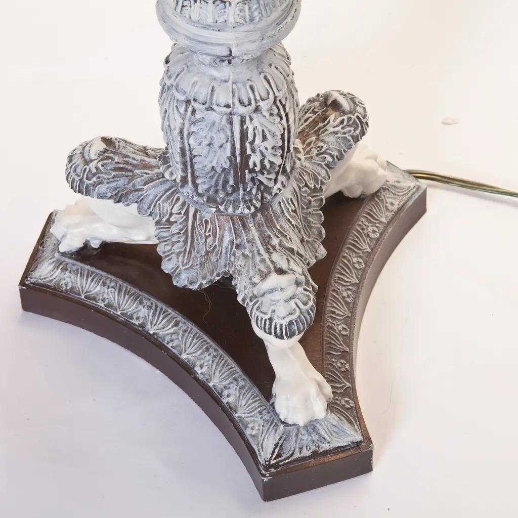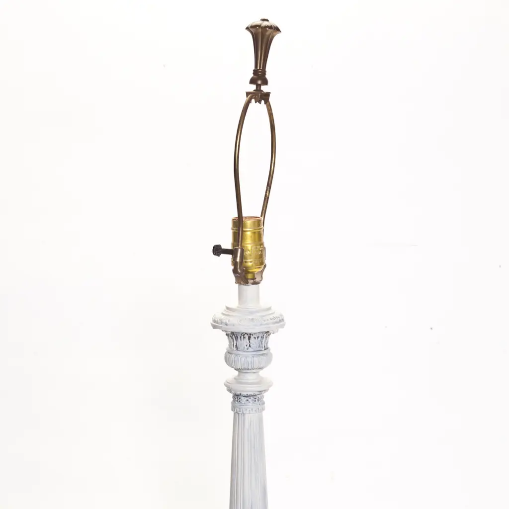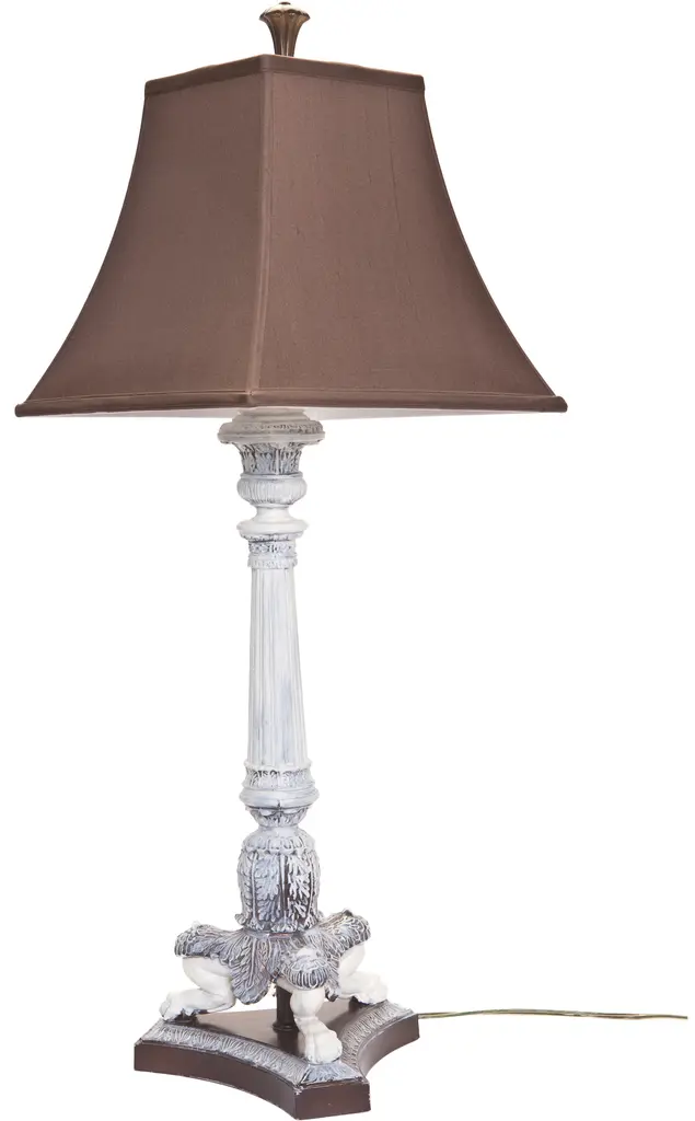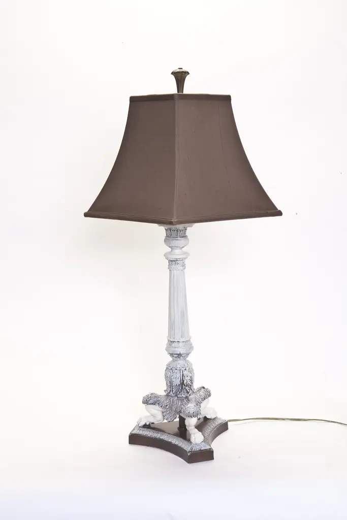 Elegant candlestick lamp sits on a triangular base and features hand painted lions paws at the base of the classical column. Square bell silk shade is included. Deep bronze finish with white lacquer accents in the Neoclassical style of mid 19thC Europe. New silk shade & hardware. Overall height is 30, with the finial.