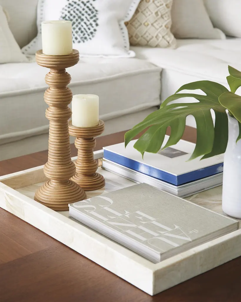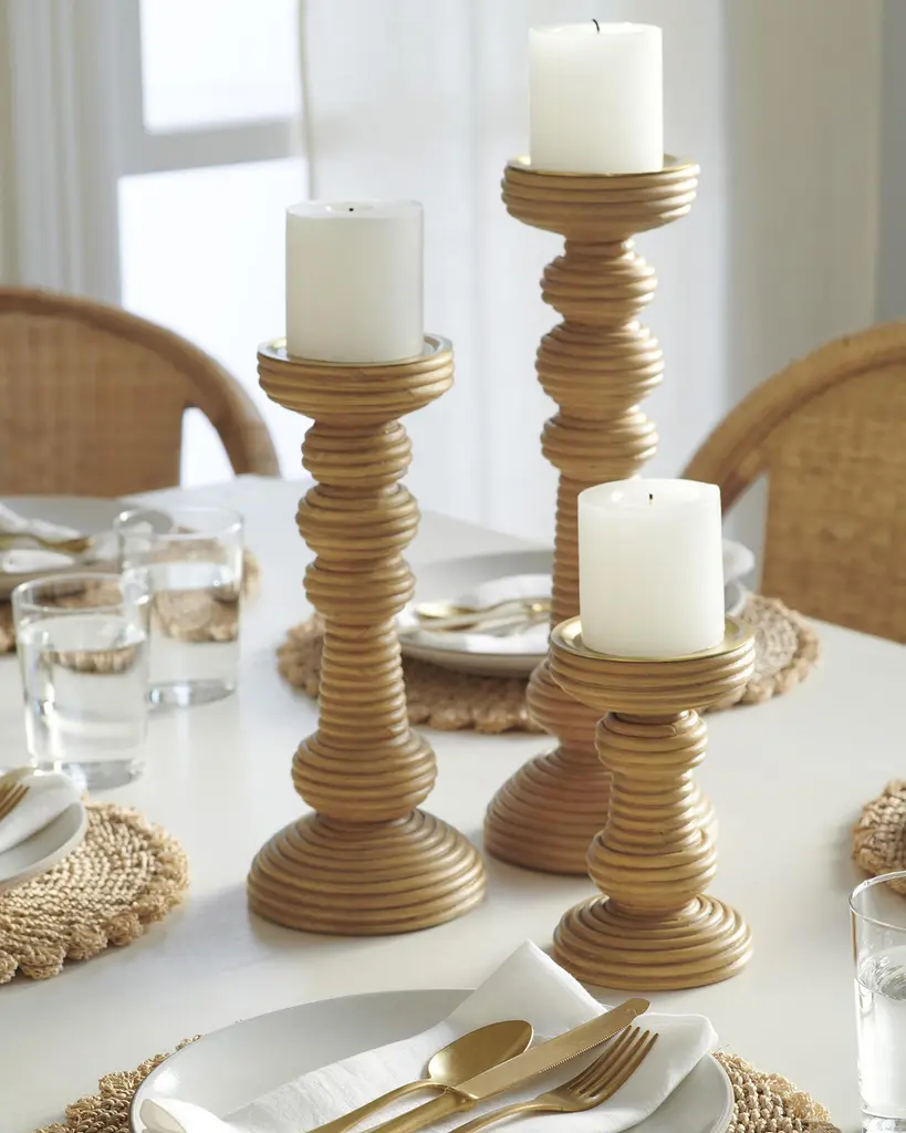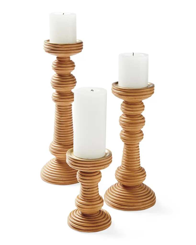 Sculptural and textural, these candlesticks make unique centerpieces and can dress up a table or mantel in no time flat. The wooden base is wrapped in natural rattan for an unexpected twist and that light, beachy vibe we love.