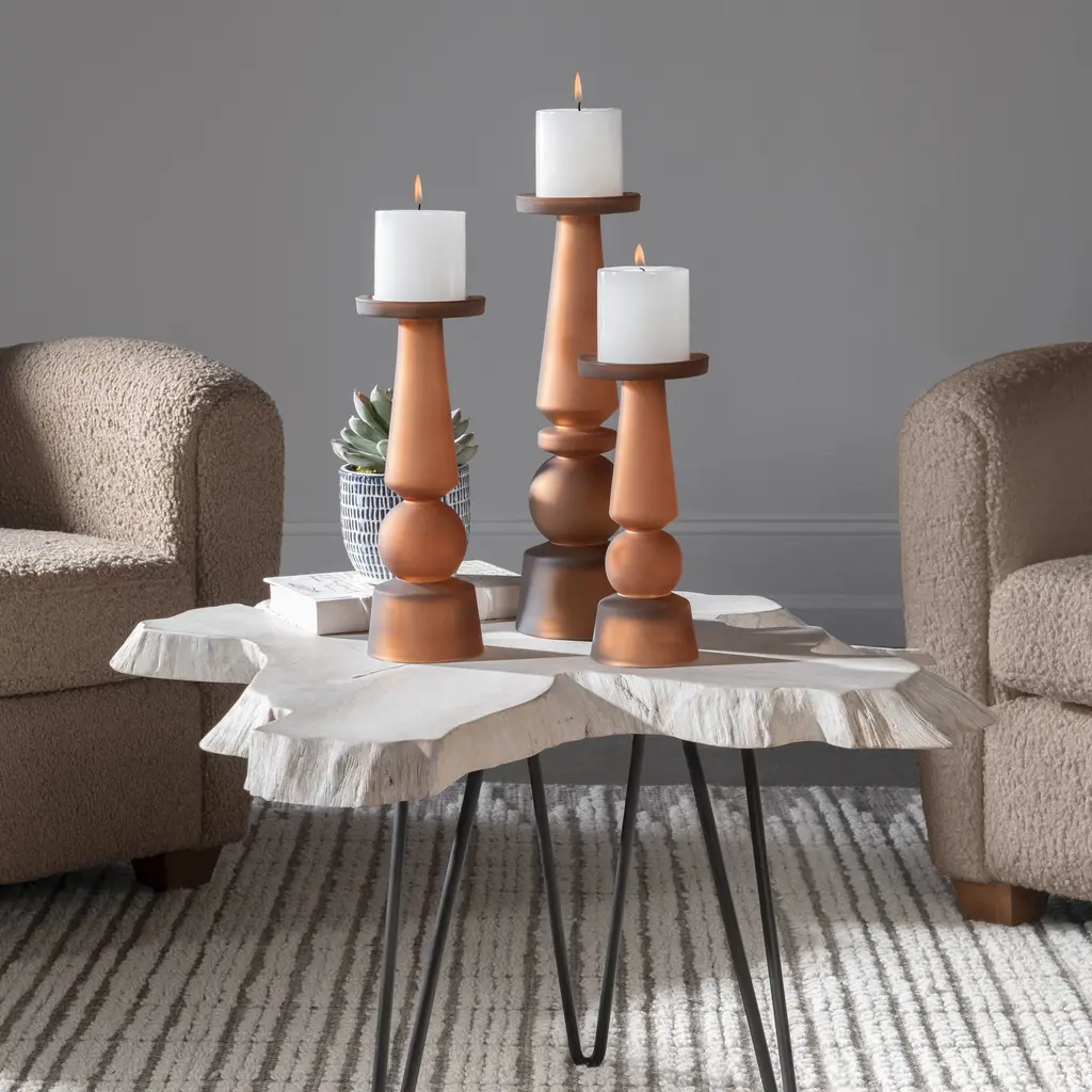 Set Of Three Candleholders Showcase Traditional Silhouettes And Are Made From A Matte Butter Rum Glass With Three 3"x 3" White Candles Included. Sizes: S-4x10x4, M-4x12x4, L-5x15x5