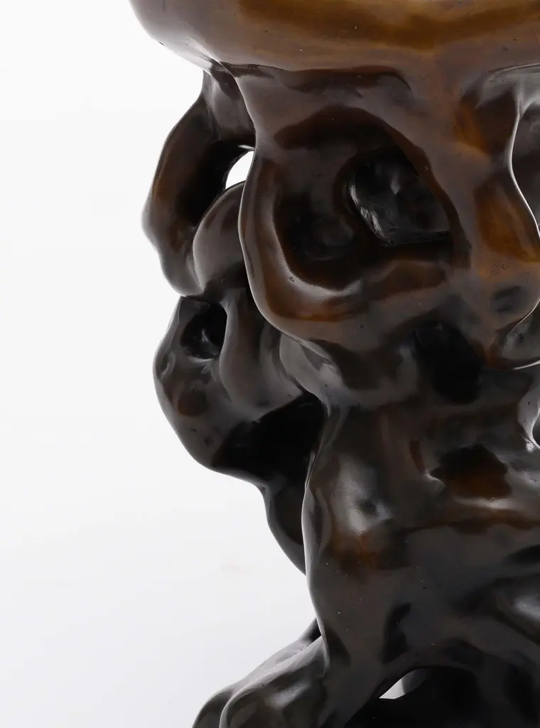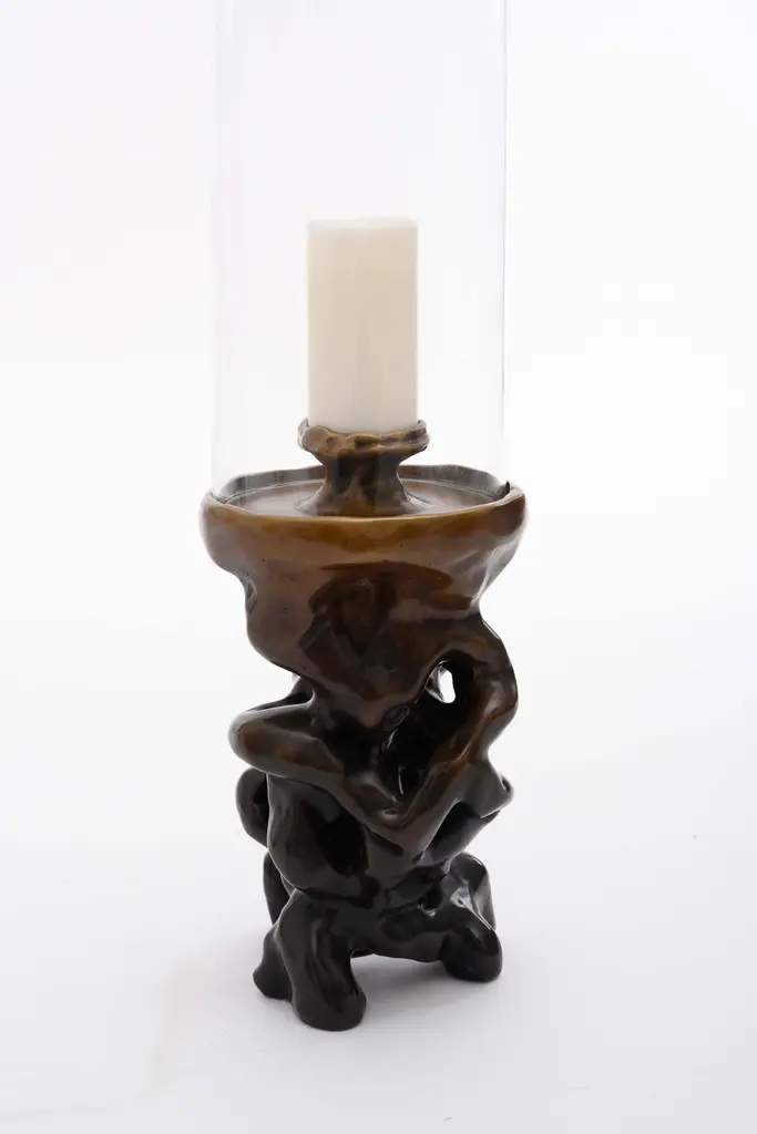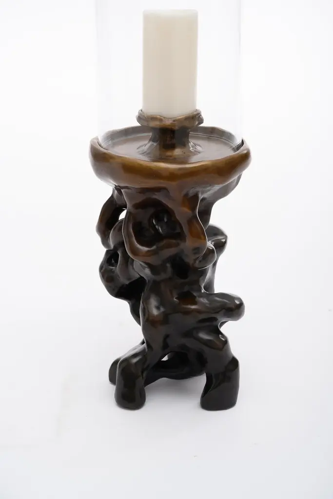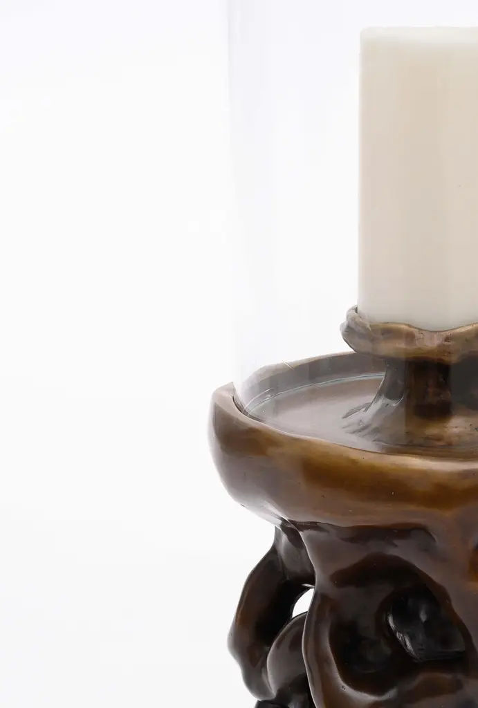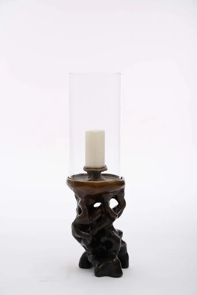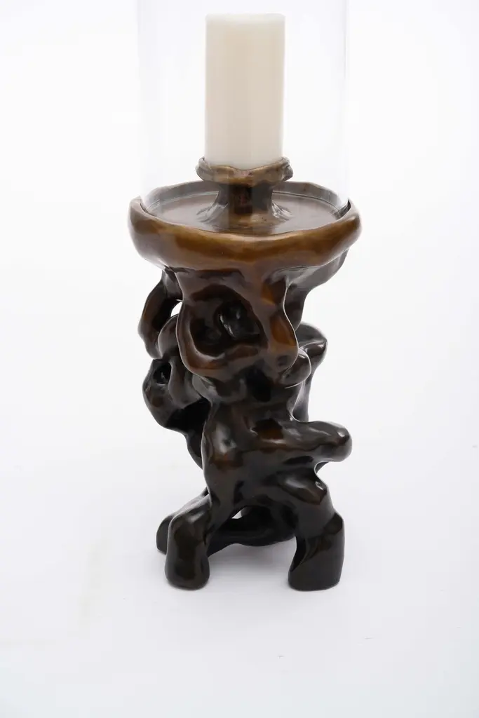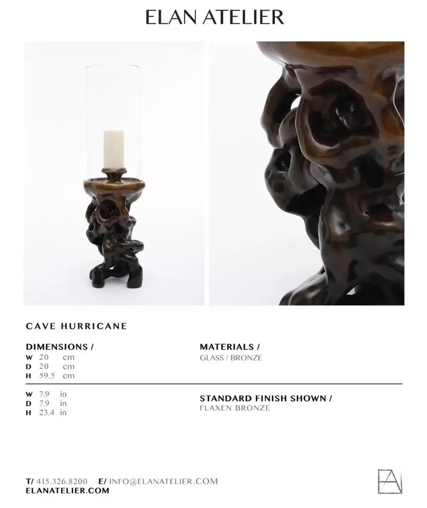 Cavee Hurricane in Antique Bronze with Glass Shade from Elan AtelierInspired by the Chinese Scholars' stones, the cave hurricane candle stand is a sculptural beauty in cast bronze with glass shade. Comes standard in our gradually darkening flaxen bronze finish.Custom sizes and finishes are available.