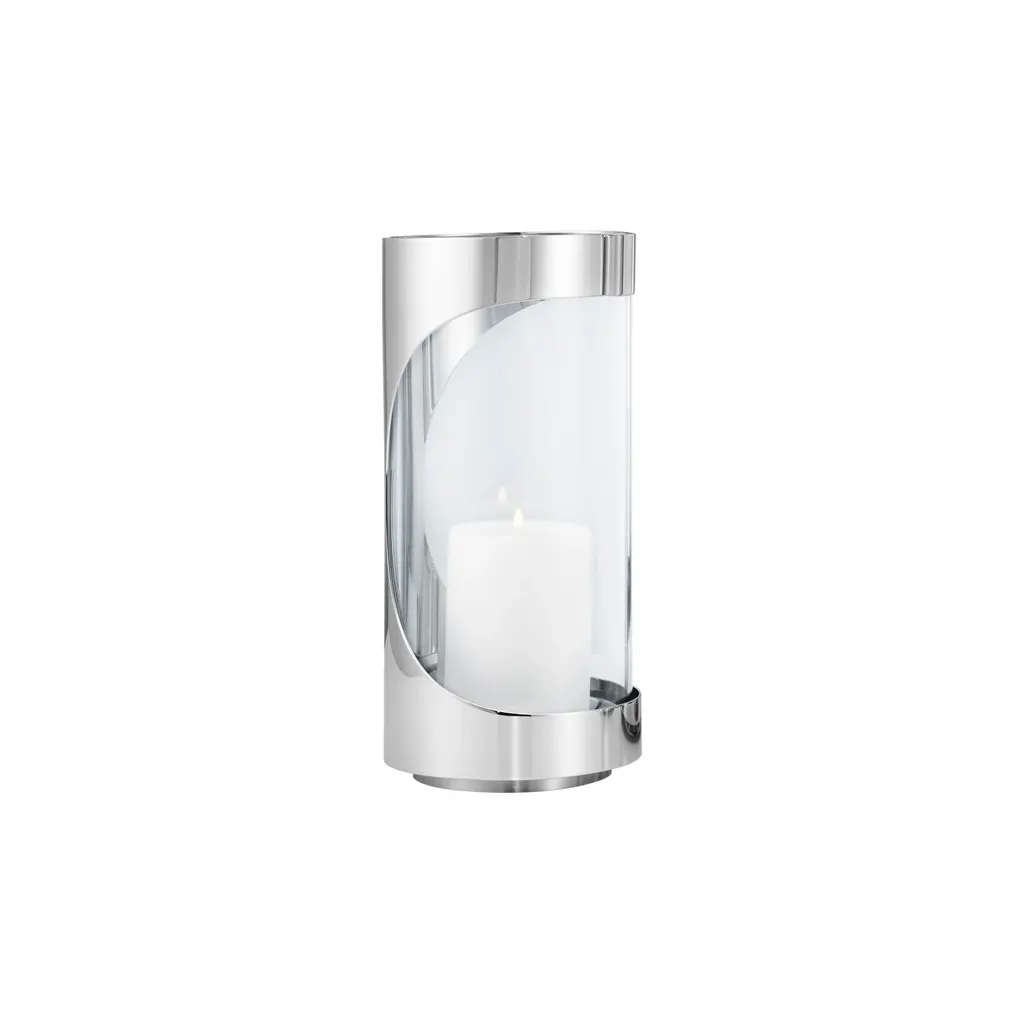 Illuminate your indoor or outdoor space with the sophisticated and timeless elegance of the Chrome Contours Hurricane from Georg Jensen. Designed by Maria Berntsen, these sleek and minimal candleholders exude character and style. Their convenient removable tray allows for effortless cleaning, while adding warmth and ambiance to any open-air setting. Highlights