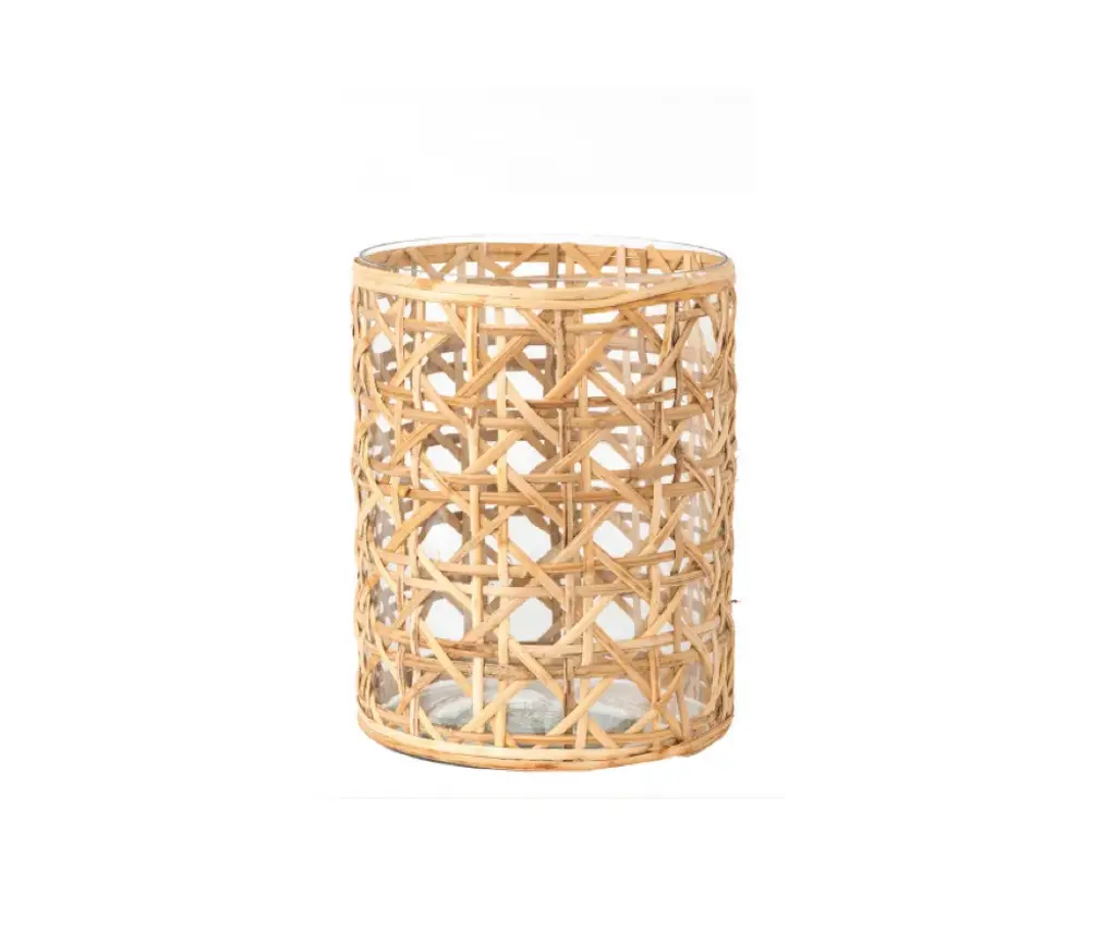 *Lead time is 1-2 weeks; however, depending on vendor's stock-levels, the item may be 'ready to ship' and arrive within one week.* This small decorative cane wicker hurricane is the perfect addition to your home décor! The handmade high quality piece offers a chunky round shape, glass insert and a wicker woven cover for a beautiful design! This piece will look simply stunning on a vanity, as apart of an exciting vignette, or featured on your indoor or outdoor dining table! We love pairing these wicker hurricanes with like styles to create a fabulous grouping/set! This cane wicker woven glass hurricane is the perfect piece to hold a candle for a candlelight ambiance or even used as a vase for a petite floral arrangement! This handmade piece includes the glass insert, comes in three sizes and is sold individually.