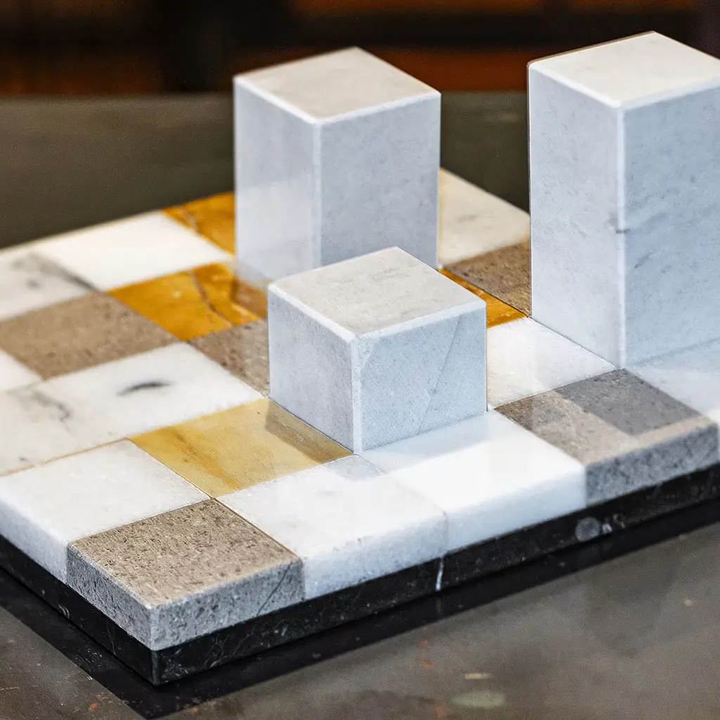 The Citylight 5 Candle Holder features a striking marble design, expertly crafted to enhance any interior space. This exceptional piece showcases a square base made of Nero Marquinia marble, adorned with a mosaic of Giallo Siena, Bianco Cristallino, and Repen tiles. Thoughtfully designed, it leaves open spaces for three interchangeable parallelepipeds constructed from Bianco Carrara marble, each varying in size, and polished to a pristine finish. The process begins with the careful selection of premium marbles, followed by precision cutting to achieve a thickness of 8 millimeters. The arrangement and adherence of the mosaic tiles to the base are executed with meticulous attention to detail, resulting in a harmonious blend of textures and colors. Due to the natural variations in the marbles, slight differences in color and pattern may occur, ensuring that each piece is unique.