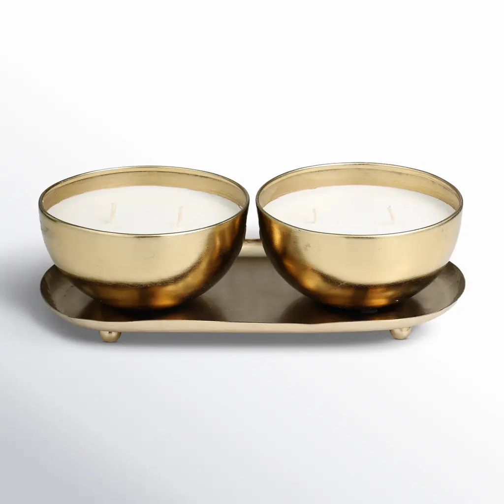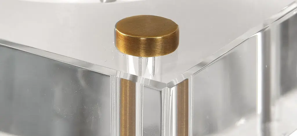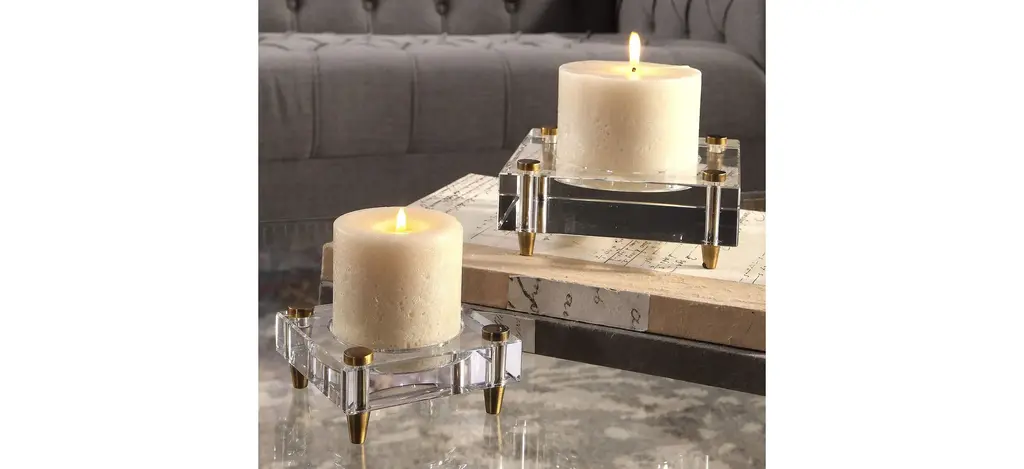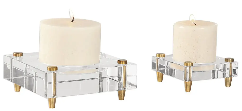 Heavy crystal block candleholders, suspended by machined brass finished legs. Includes one 3"x 3" and one 4"x 3" distressed off-white candles. Sizes: Small-4x2x4, Large-6x3x6