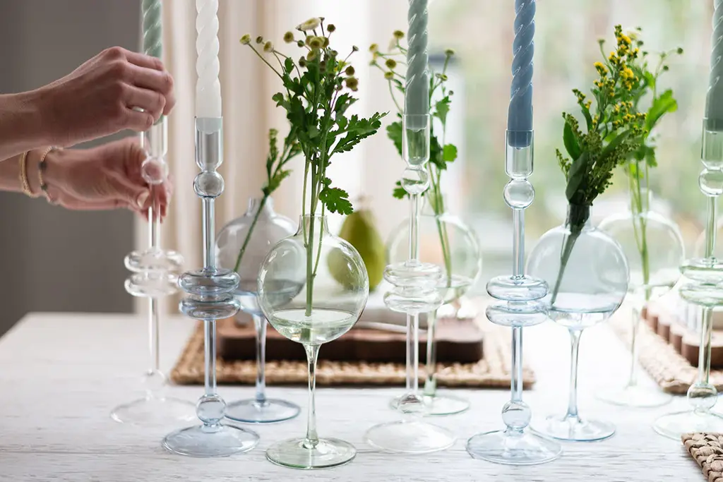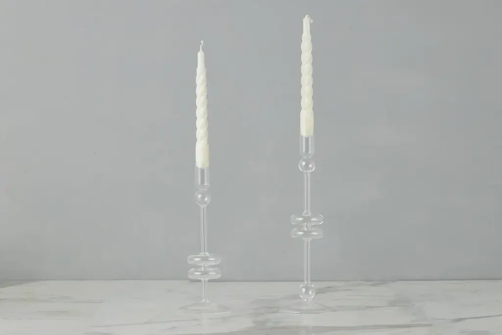 Elevate your home decor with a pair of Clear Glass Candlesticks. These expertly crafted taper candle holders add a touch of timeless elegance to any room. Available in two sizes and three colors, they are perfect for adding a pop of color to your dinner party or creating a statement throughout your home. Mix and match the sizes and colors to create a memorable tablescape. The pair will be 2 of the size that you select. These candlesticks pair perfectly with our Twisted Taper Candles. Hand wash only. Never use sharp objects to remove hardened wax drips.