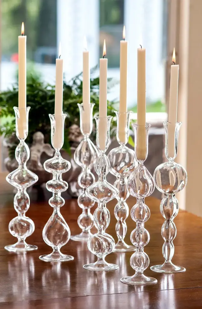 A grouping of four mouth-blown candlesticks in clear glass, each with a different design. Create your own distinctive arrangement as these candlesticks are all sold separately. Care Instructions: Hand Wash
