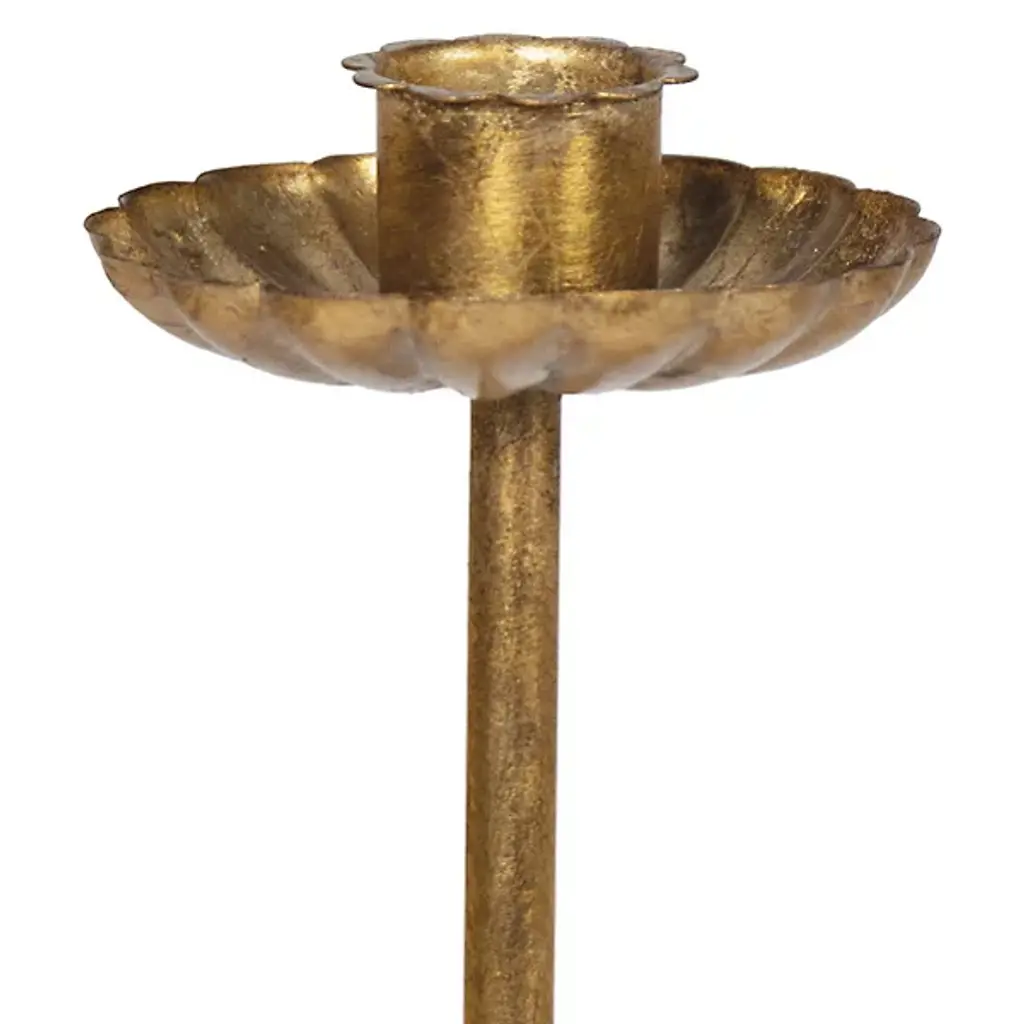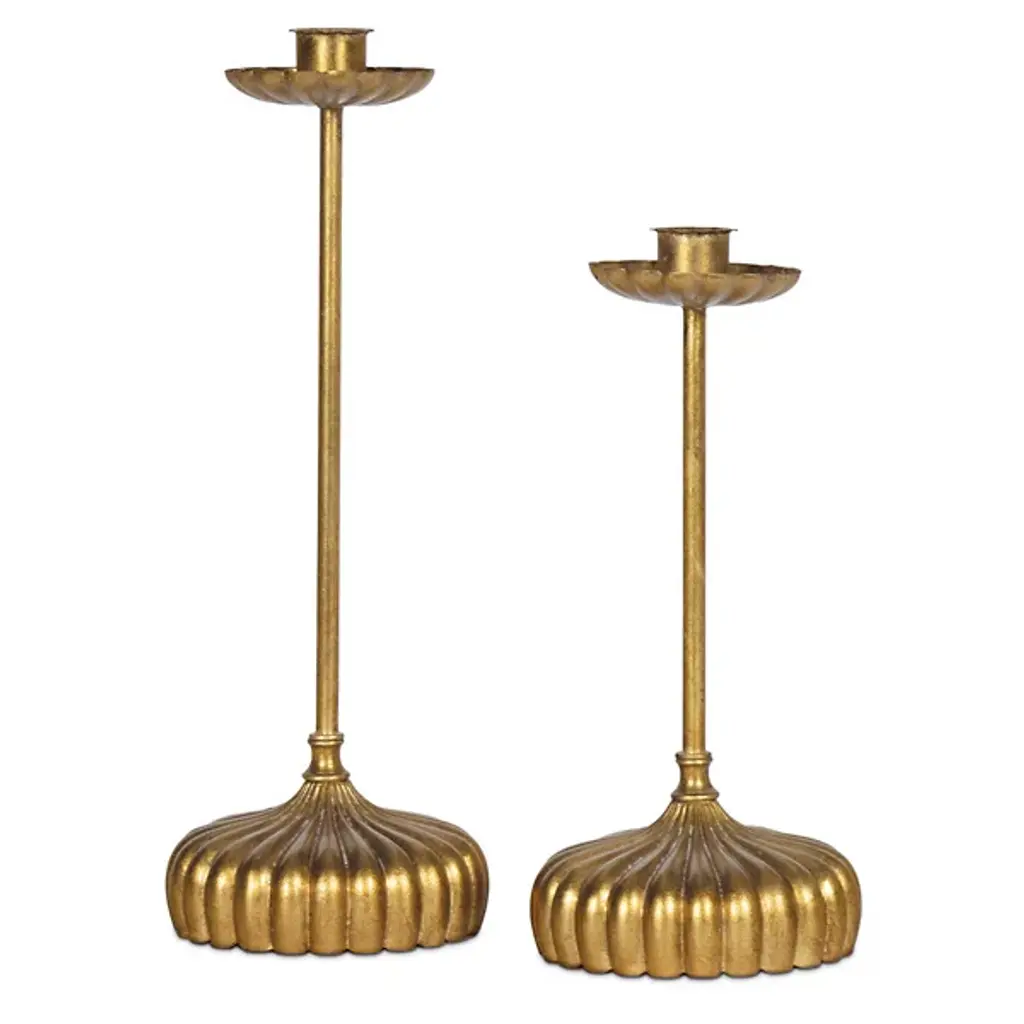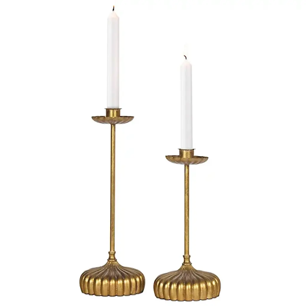 The Clove Candle Holder, Set of 2 from Regina Andrew draws inspiration from vintage European candelabras with its fluted bases and ornate bobeche details. Traditional craftsmanship shines through in the antiqued metal finish and classical proportions. The two holders work in harmony, creating layered height variation that adds depth to mantels and dining tables. These timeless pieces bring old-world charm to any setting. The scalloped bases provide sturdy support, while the elongated stems create an appealing vertical line that draws the eye upward to the candle cups.