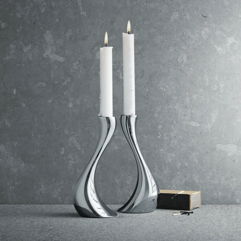 The COBRA candlestick brings a dramatic twist to your interior and your lighting. Its strong curves give an impression of movement and attitude. This candlestick is classic in its imposing silver form but witty because of its dramatic swerving body. The way it rises almost seems gravity-defying. It shares a number of qualities with its namesake: it is imposing, bold and striking. The form was inspired in part by the idea of melting wax. The curve is such an organic one, it is almost as if a classic candlestick has begun to melt. There is something seductive about the form, with its dynamic spiralling shape and stainless steel exterior. The mirrored surface catches and reflects the light with flair. When purchasing two or more, you open the door to endless possibilities for arrangement. Please note that candles (10016658) are sold separately.